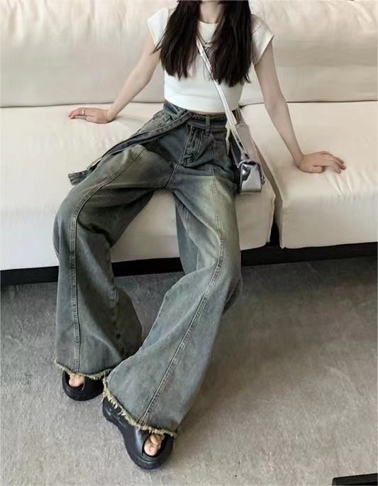 쁘띠 빈티지 스트랩 러프 걸레 청바지 여성의 봄과 여름 새로운 스트레이트 슬림 룩 느슨한 와이드 레그 트렌디 한 바지