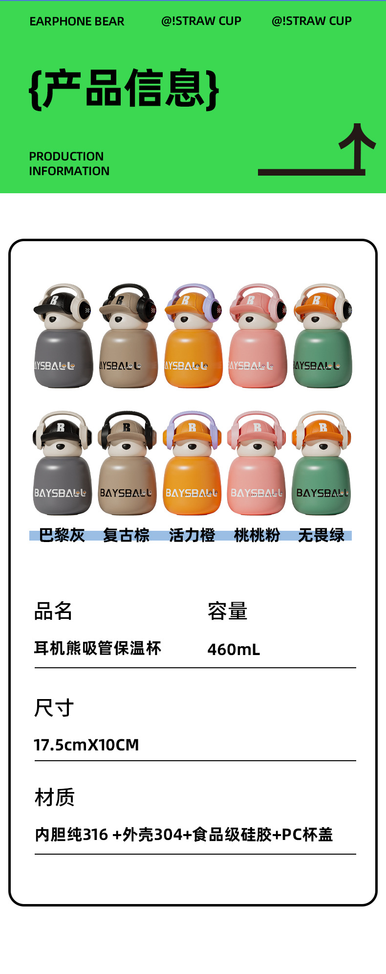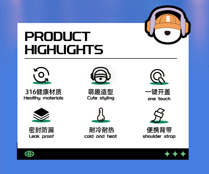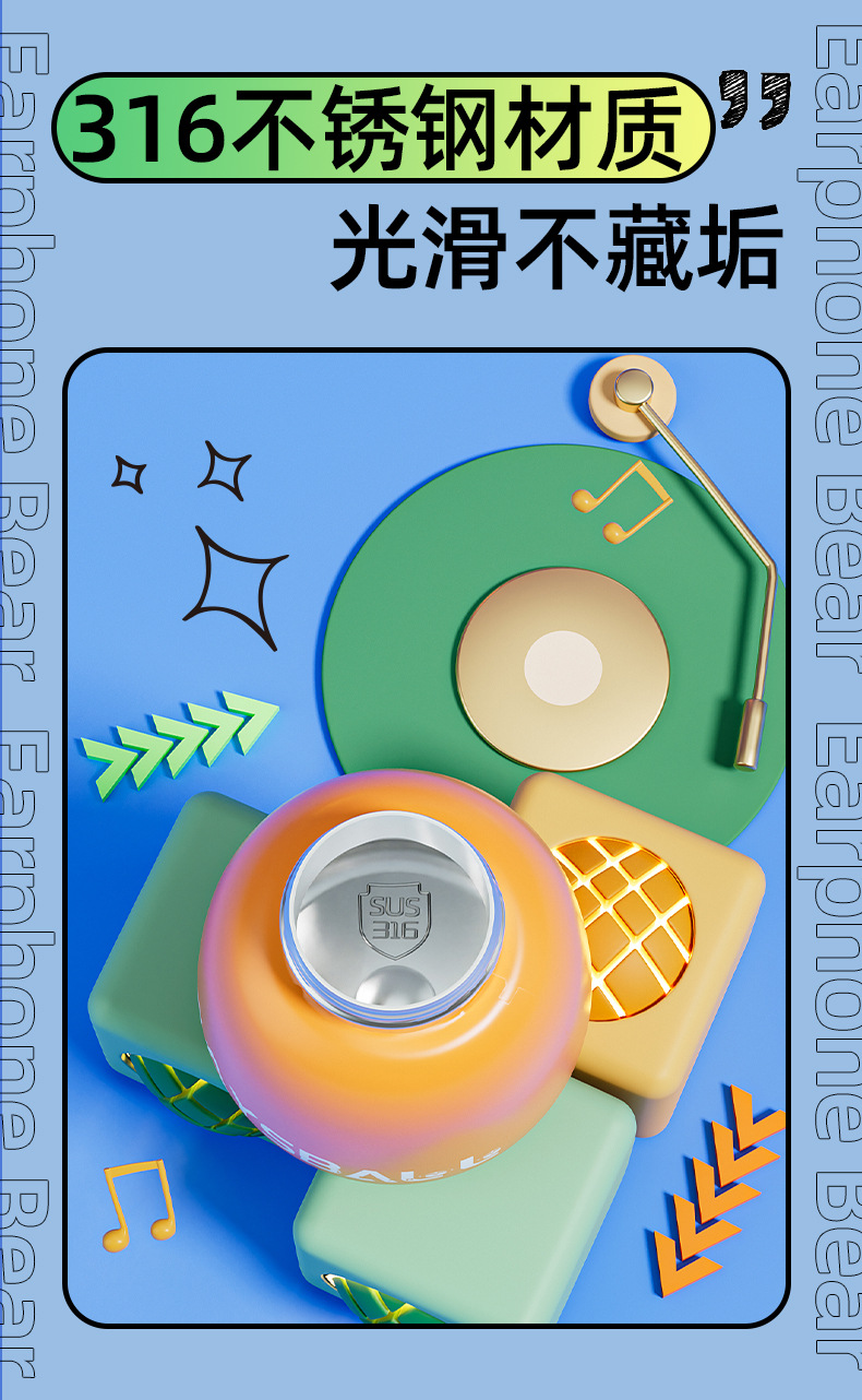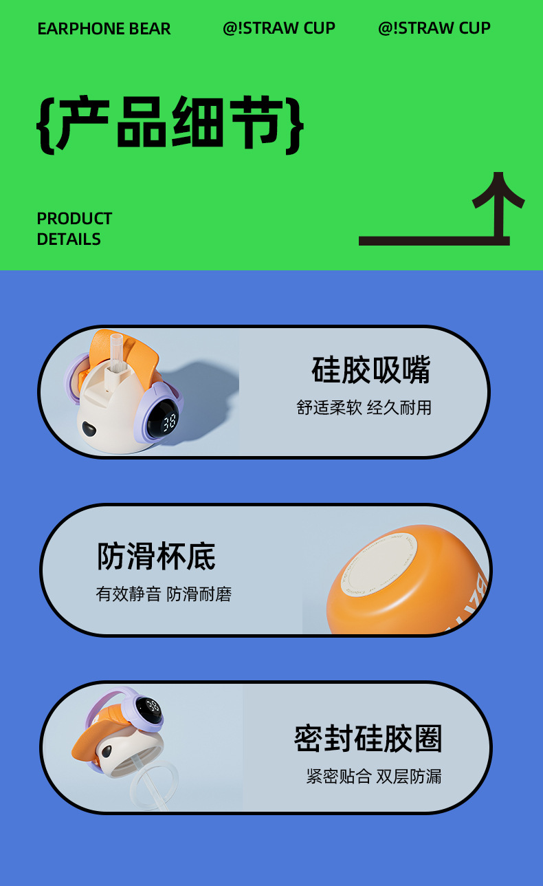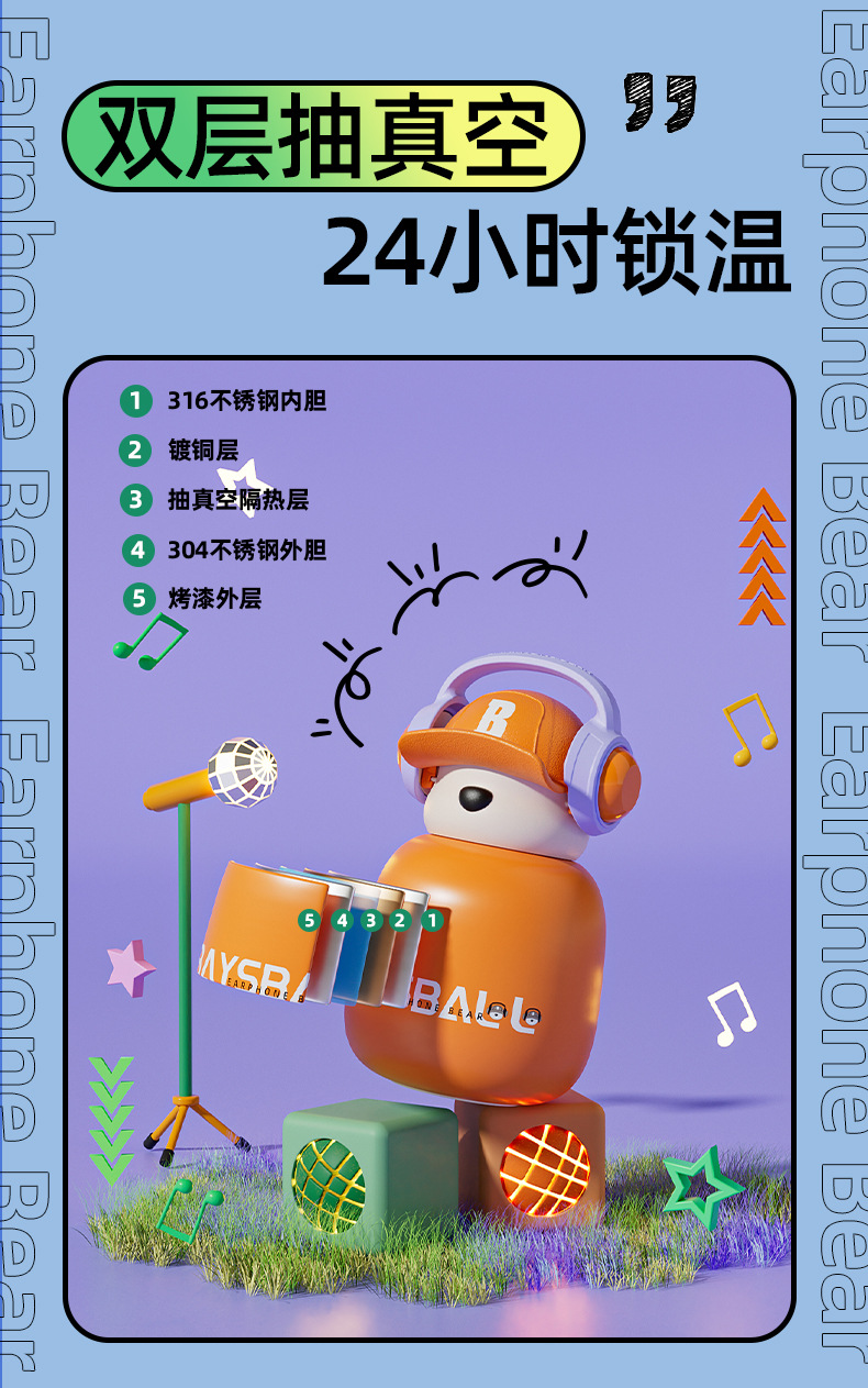 새로운 스마트 헤드셋 곰 식품 등급 316 스테인레스 스틸 높은 색상 가치 짚 학생 어린이 주전자 보온병 컵