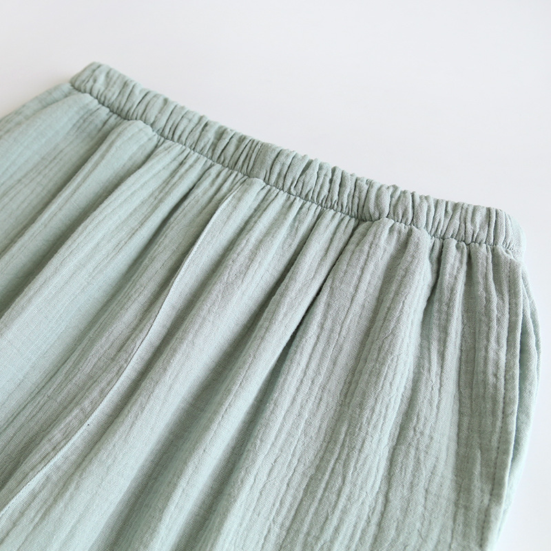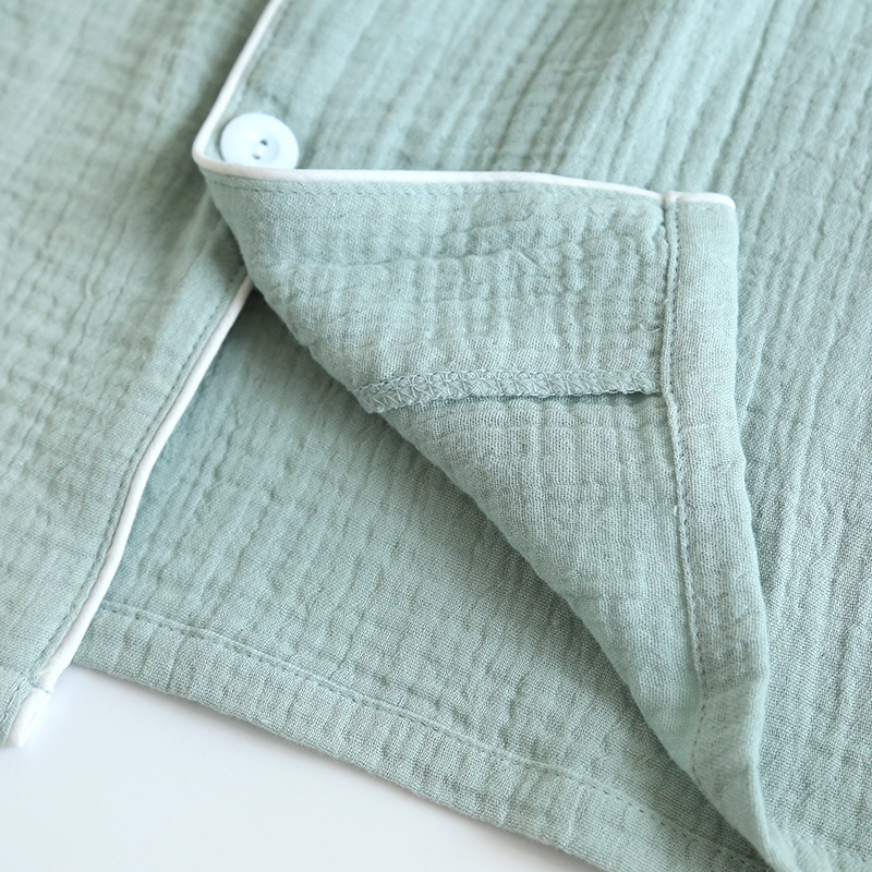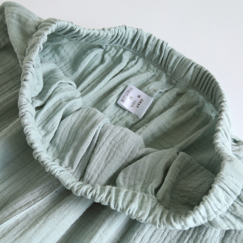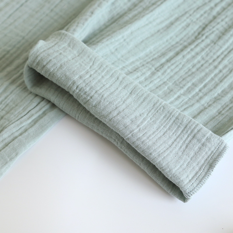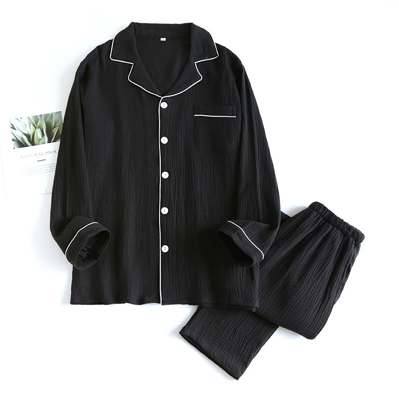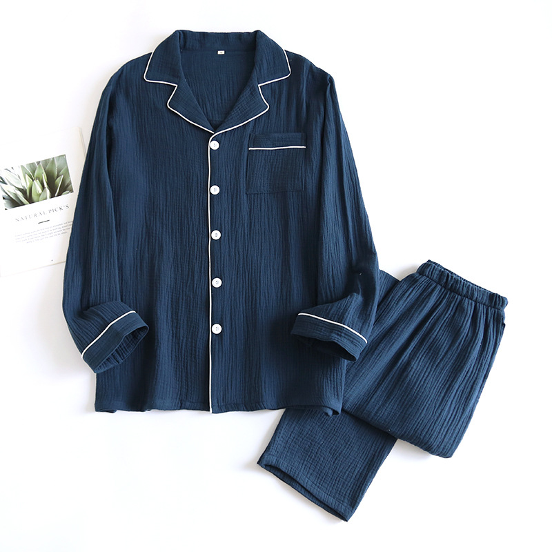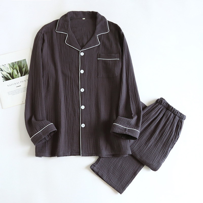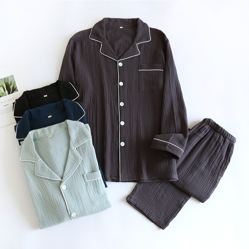 잠옷 남자의 순면 봄과 가을 얇은 긴팔 순면 더블 레이어 거즈 느슨한 플러스 사이즈 단색 가정 옷 세트스토어 가기