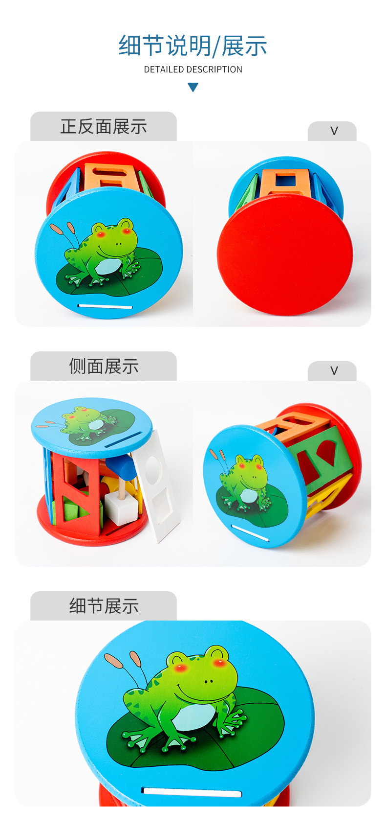 2、将可以拿掉的木块取下,把各种形状的积木块拿出来,教宝宝认识不同的形状和颜色;