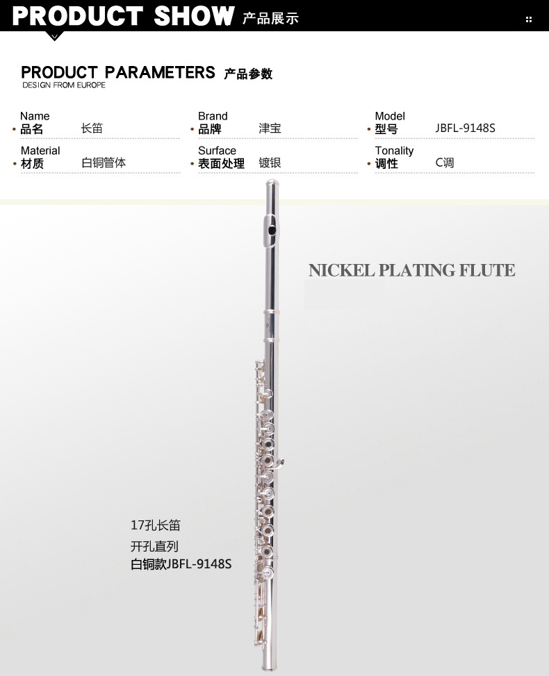 진바오 플루트 악기 JBFL-9148S 흰색 구리 튜브 바디 홀 인라인 E 키 17 홀 플루트 웨스턴 플루트