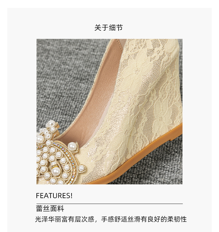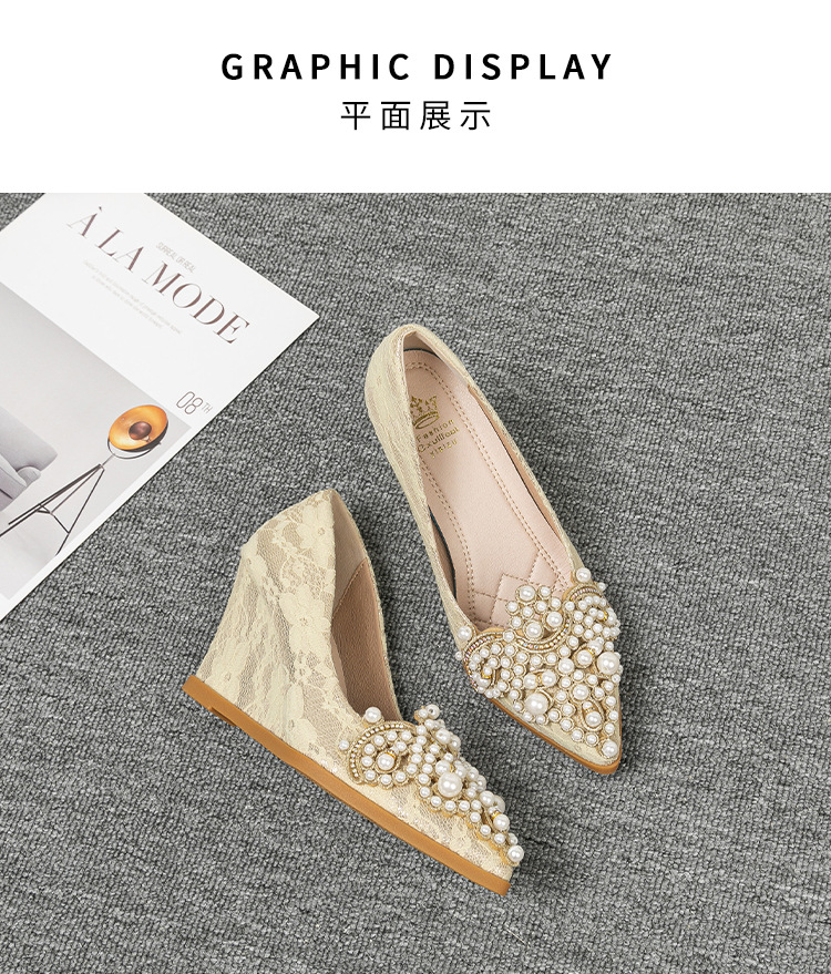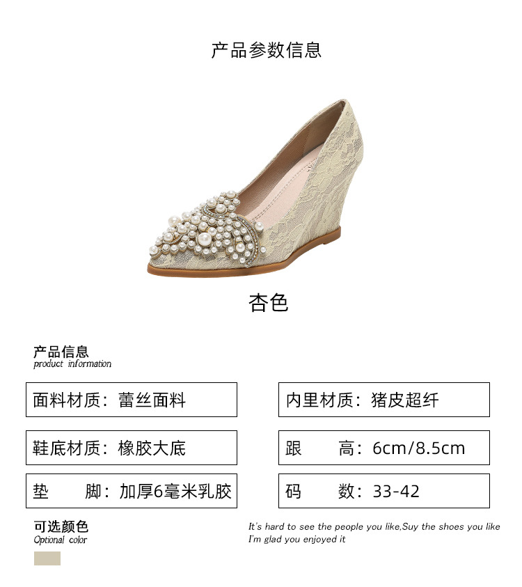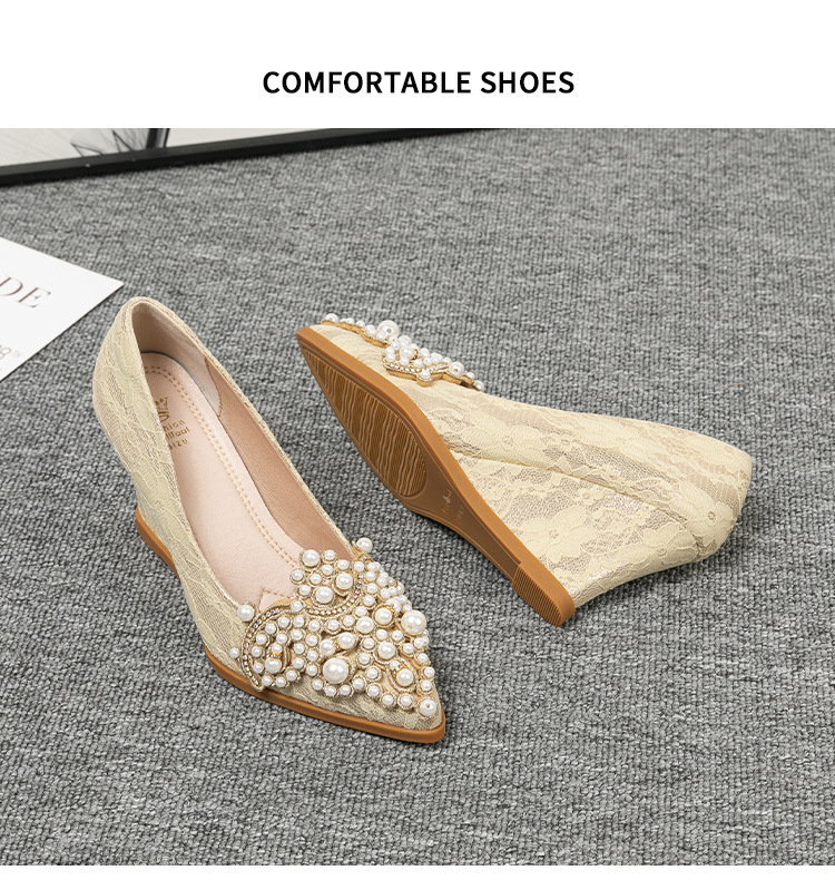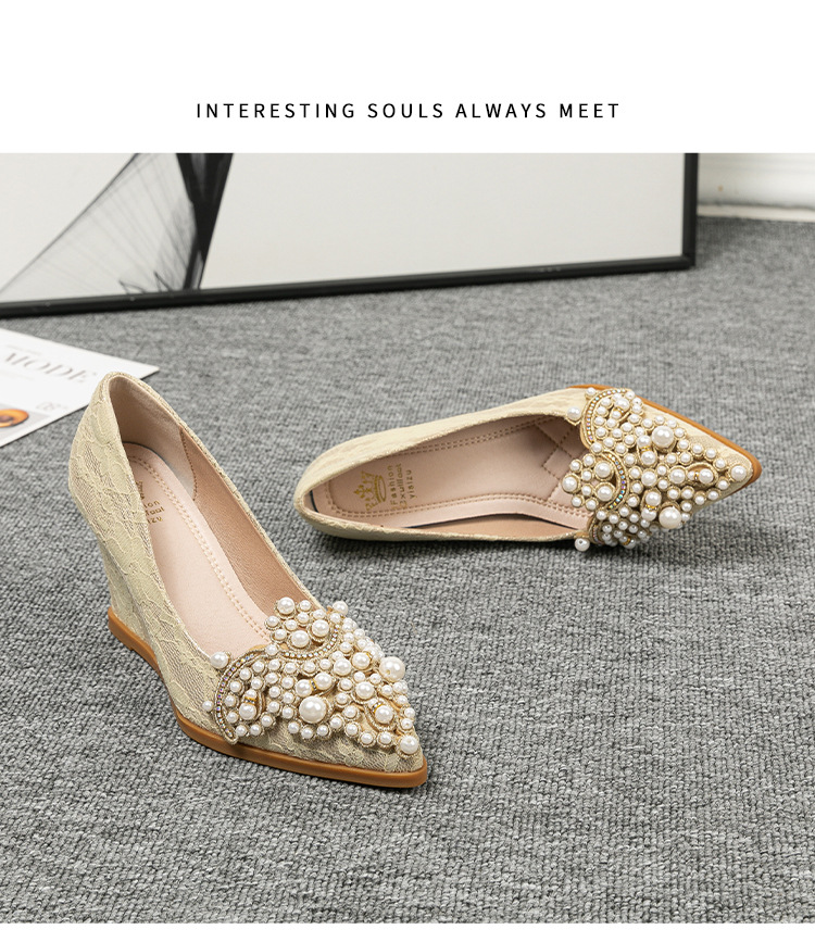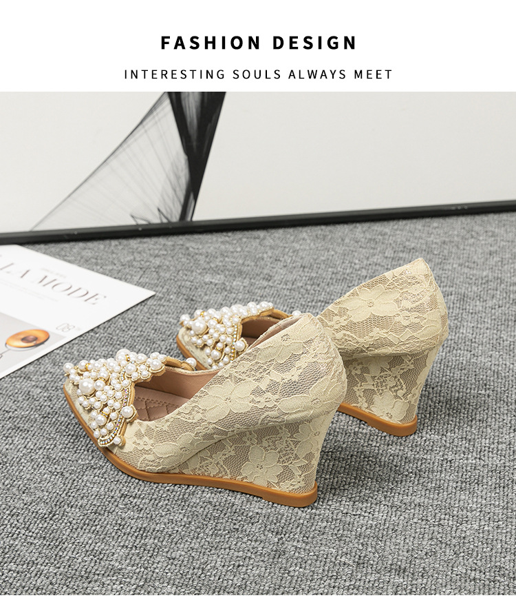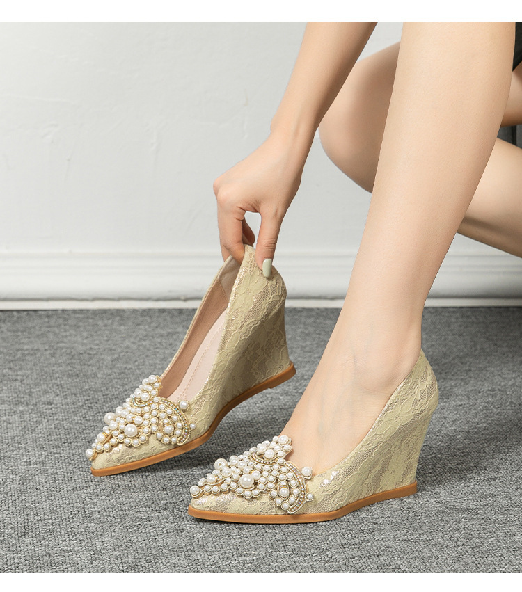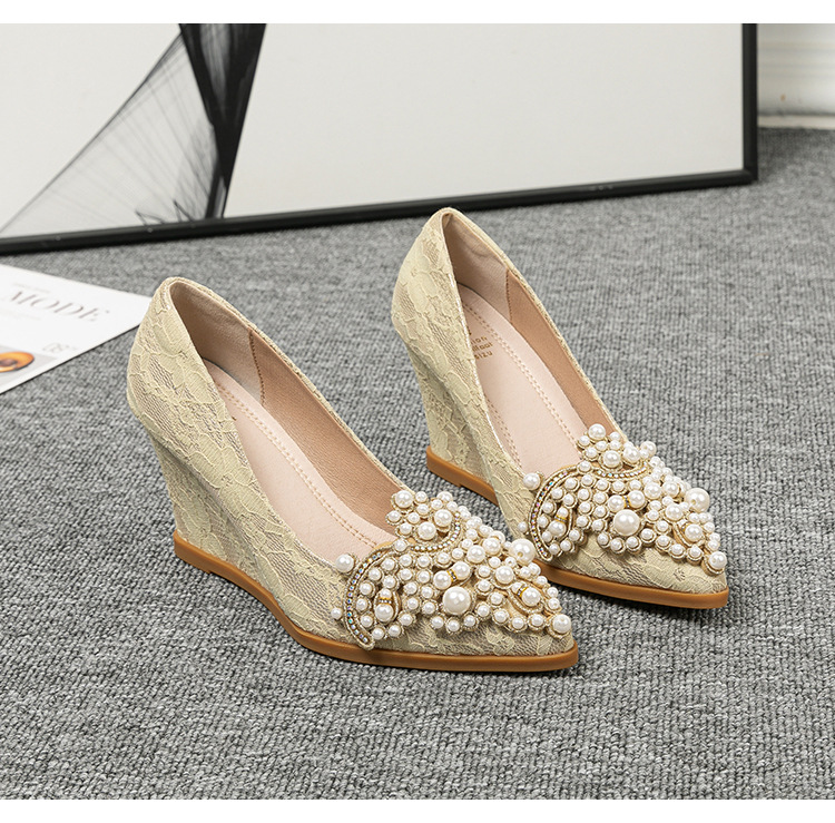 여성용 웨지힐 슈즈 2024 가을 신상 두꺼운 밑창 패션 자수 진주 레이스 살구색 하이힐 여성용 뾰족 구두스토어 가기