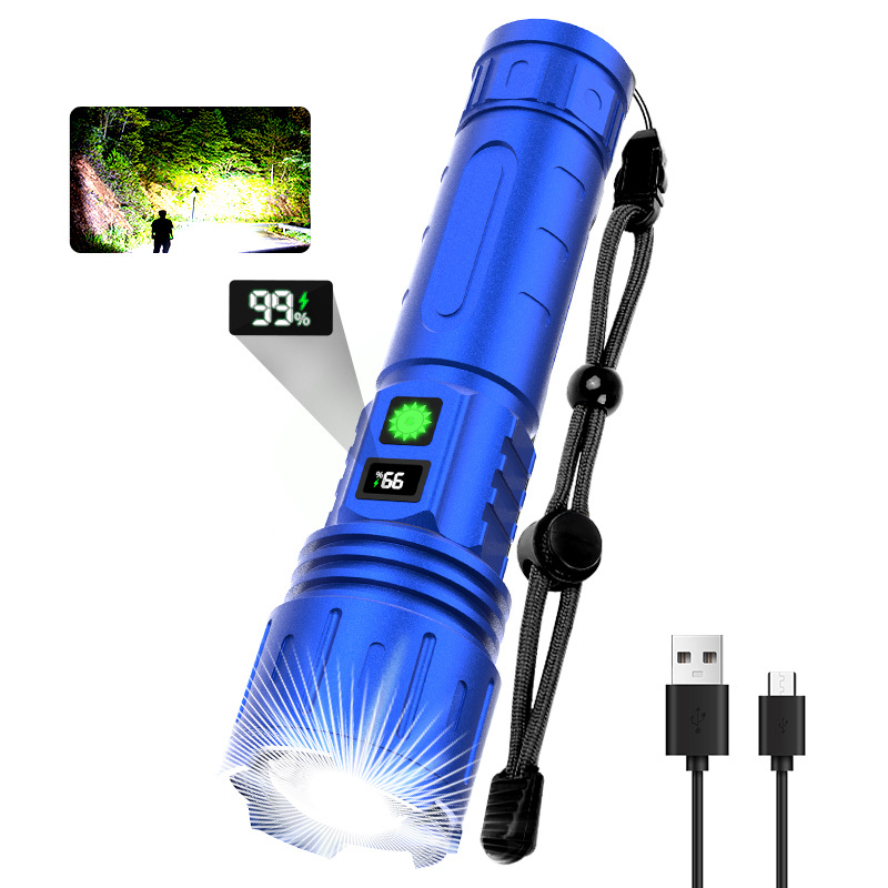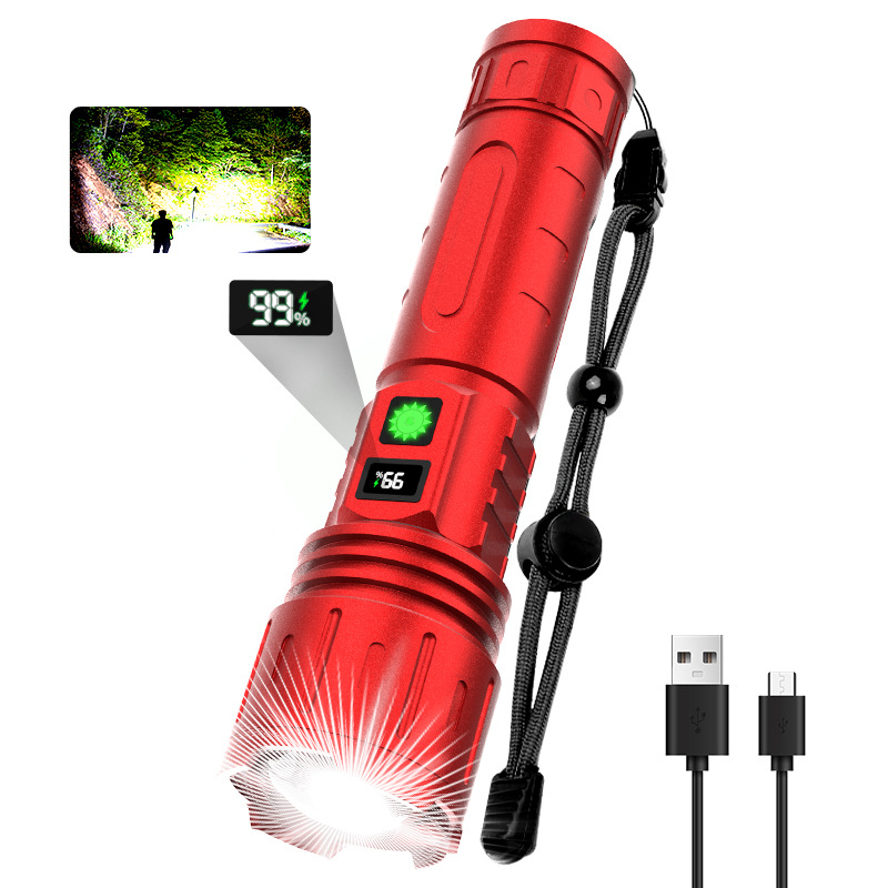 USB 충전식 배터리 디스플레이 줌 화이트 레이저 비상 손전등 다기능 휴대용 야외 손전등