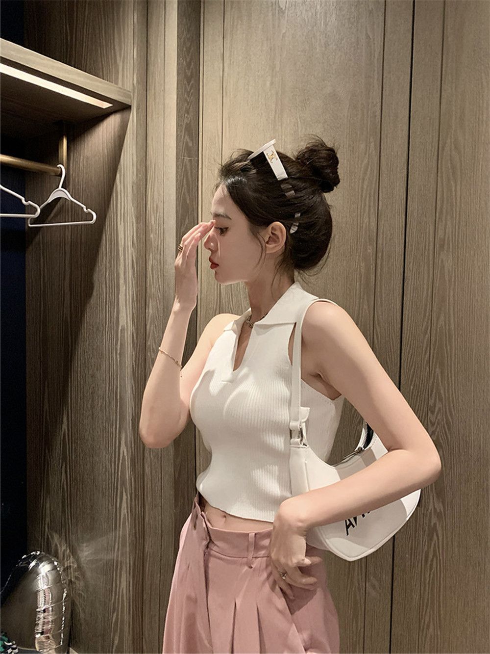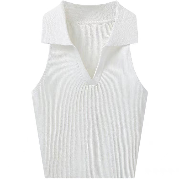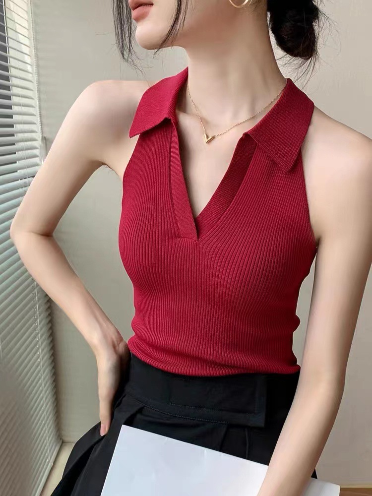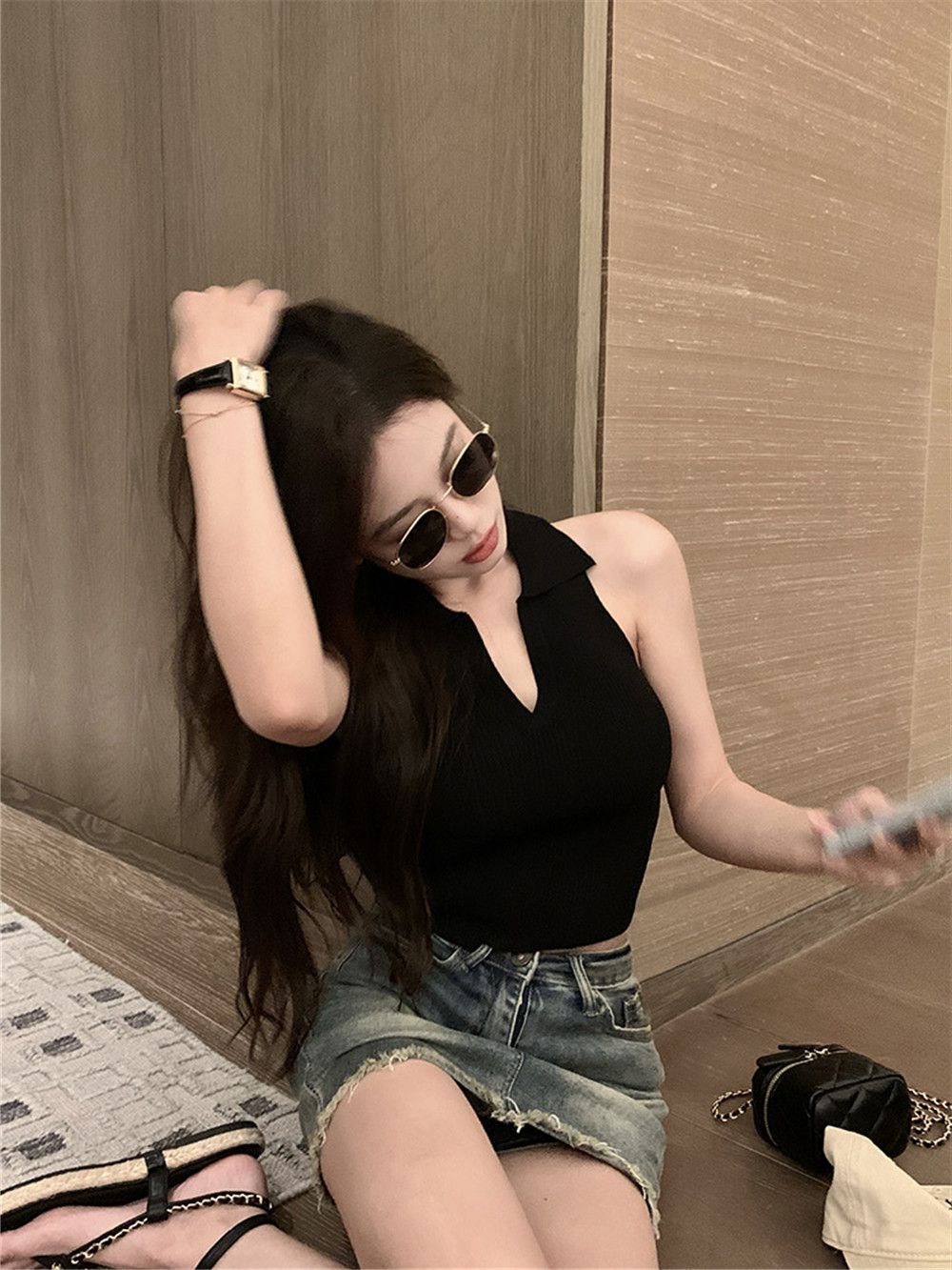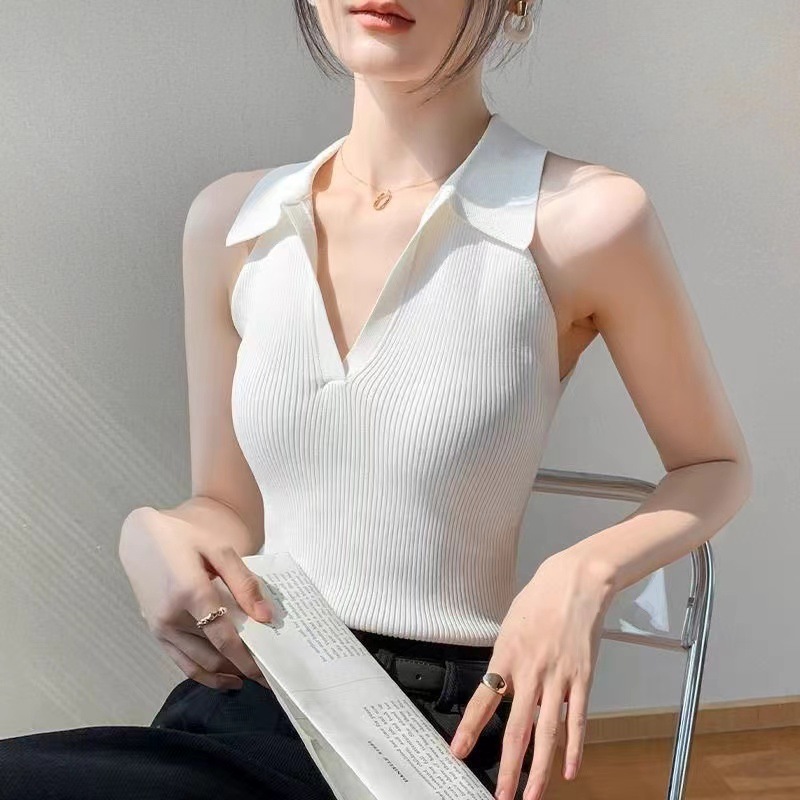 여성용 라펠 민소매 탑 2025 여름 신상 하이엔드 틈새 슬림 티셔츠 달콤하고 매운 홀터넥 브이넥 스웨터 제조업체스토어 가기
