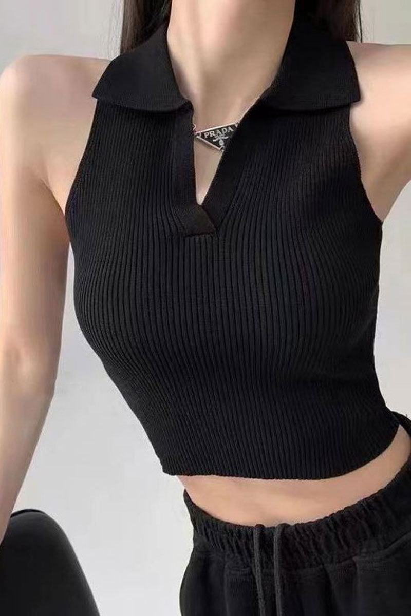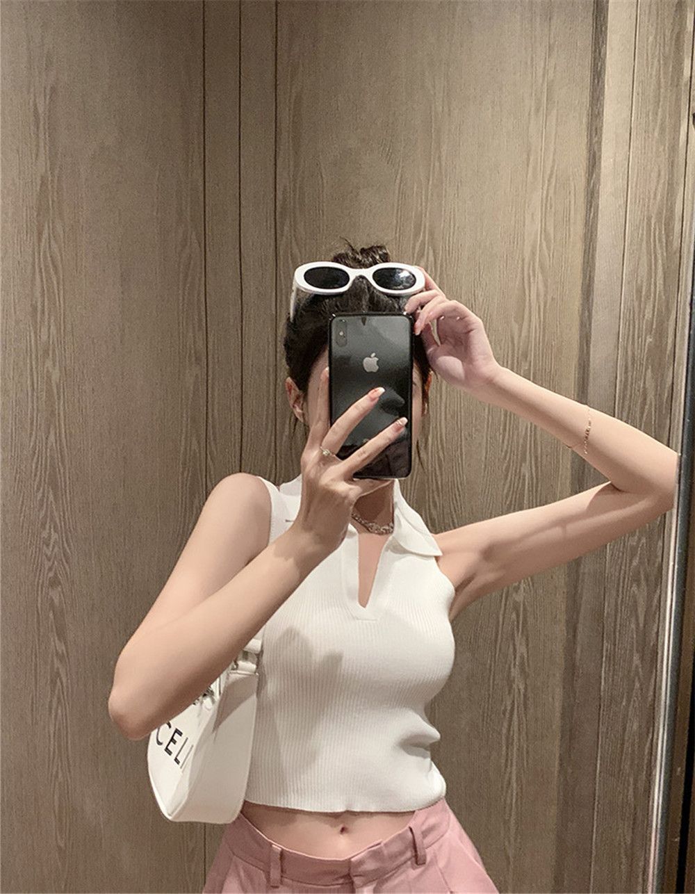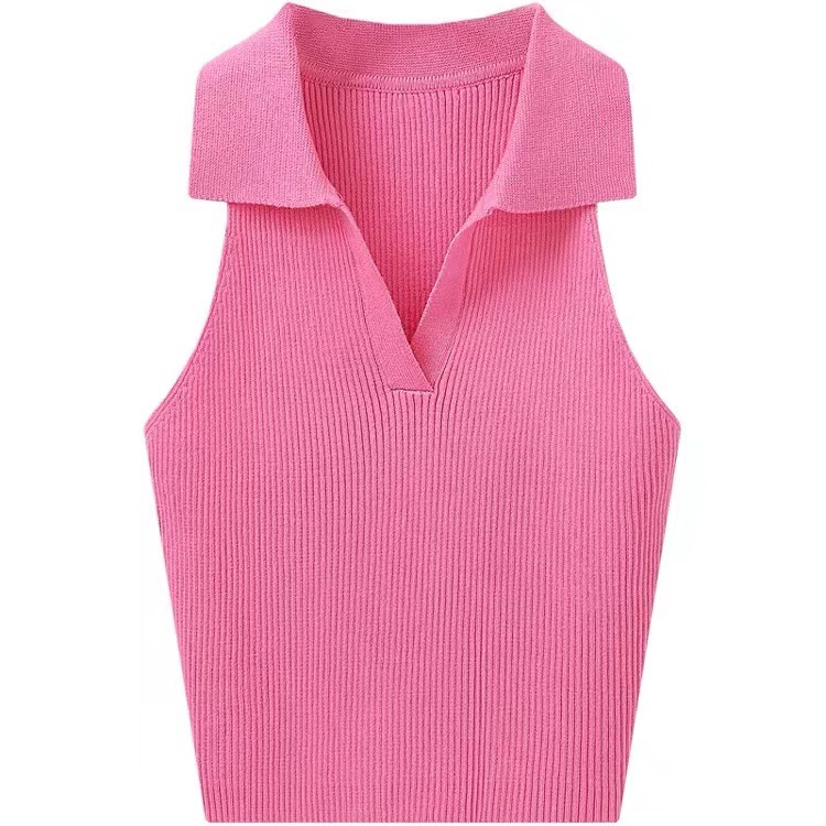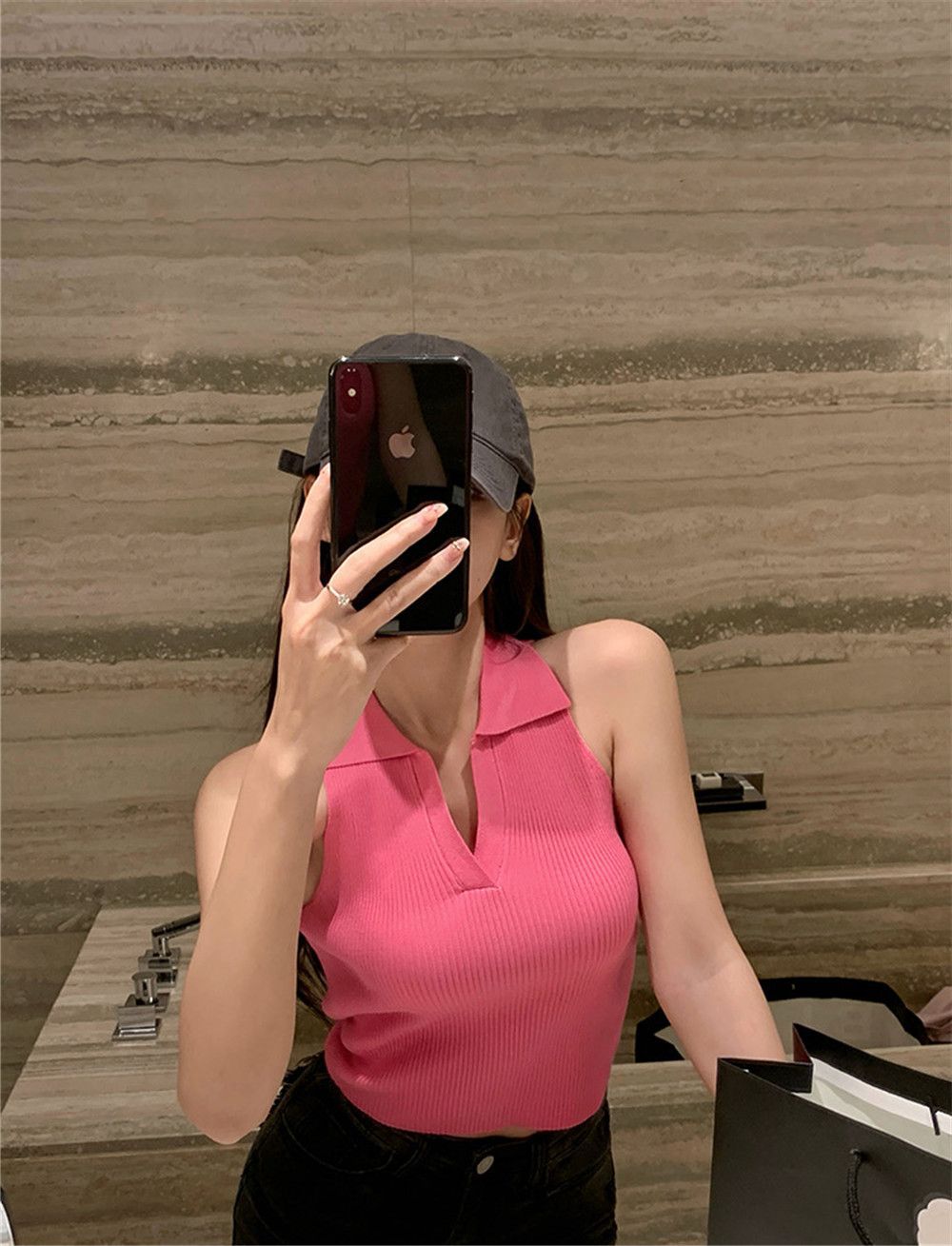 여성용 라펠 민소매 탑 2025 여름 신상 하이엔드 틈새 슬림 티셔츠 달콤하고 매운 홀터넥 브이넥 스웨터 제조업체스토어 가기