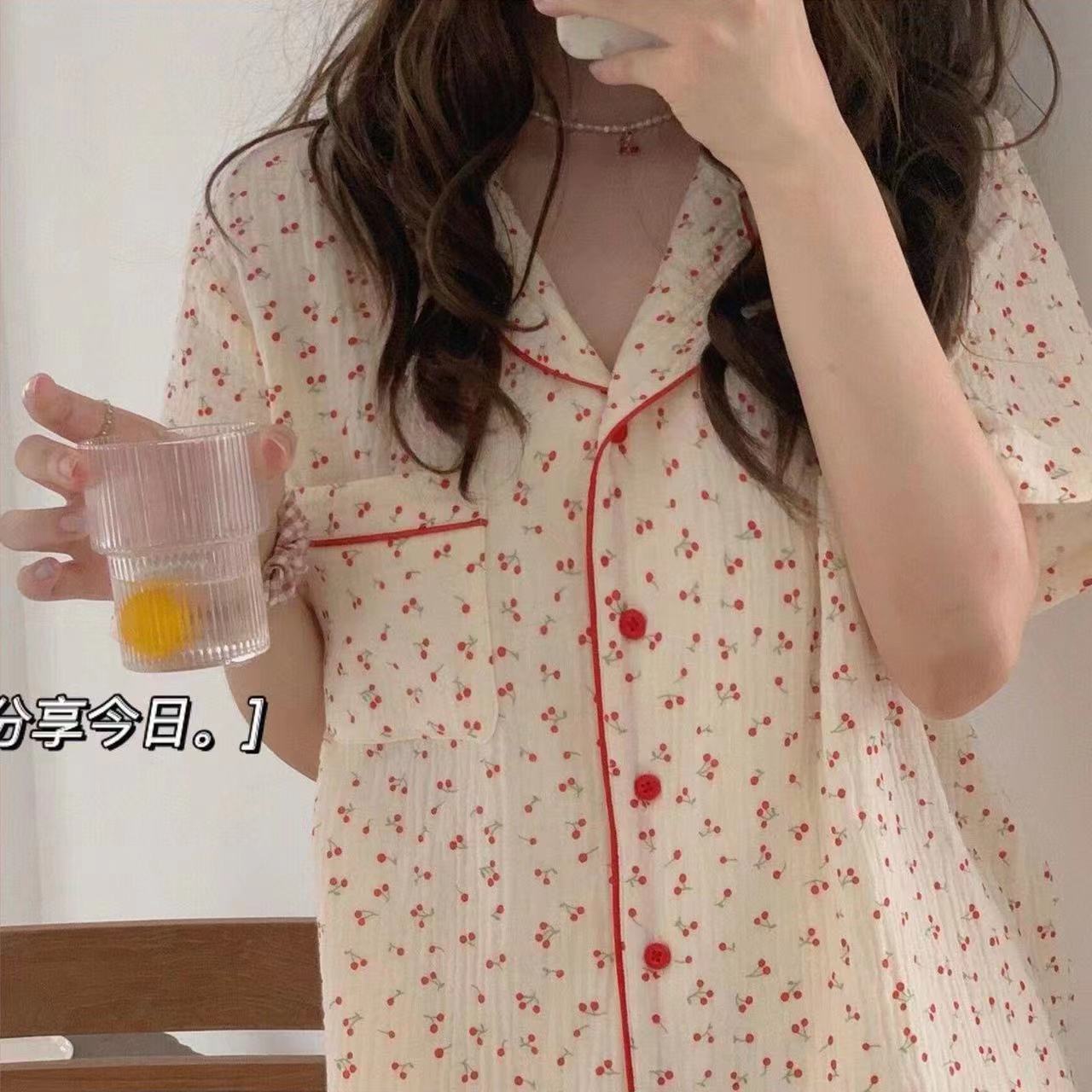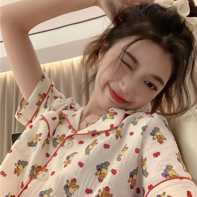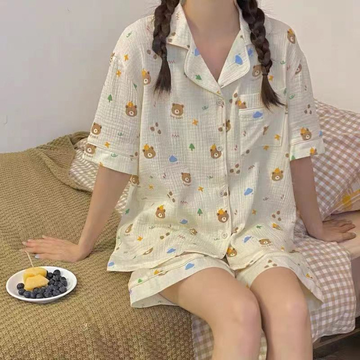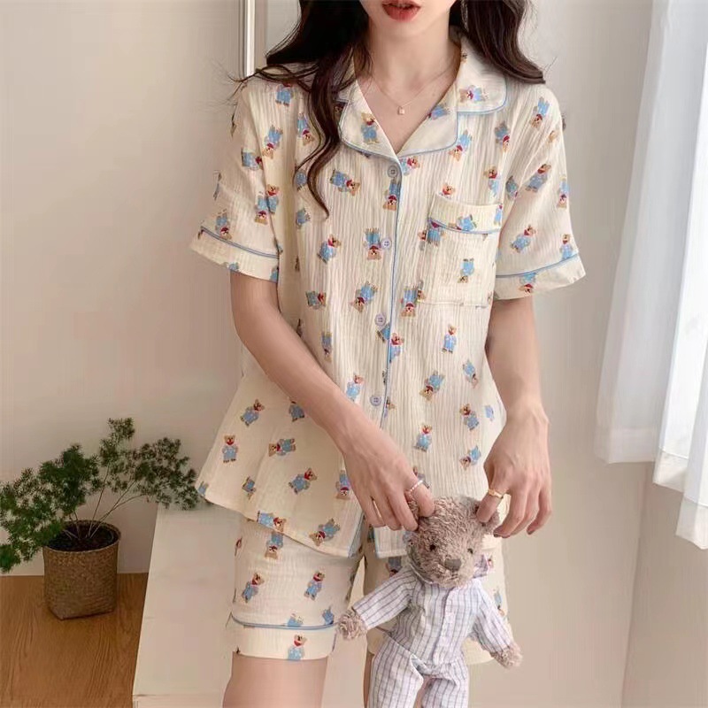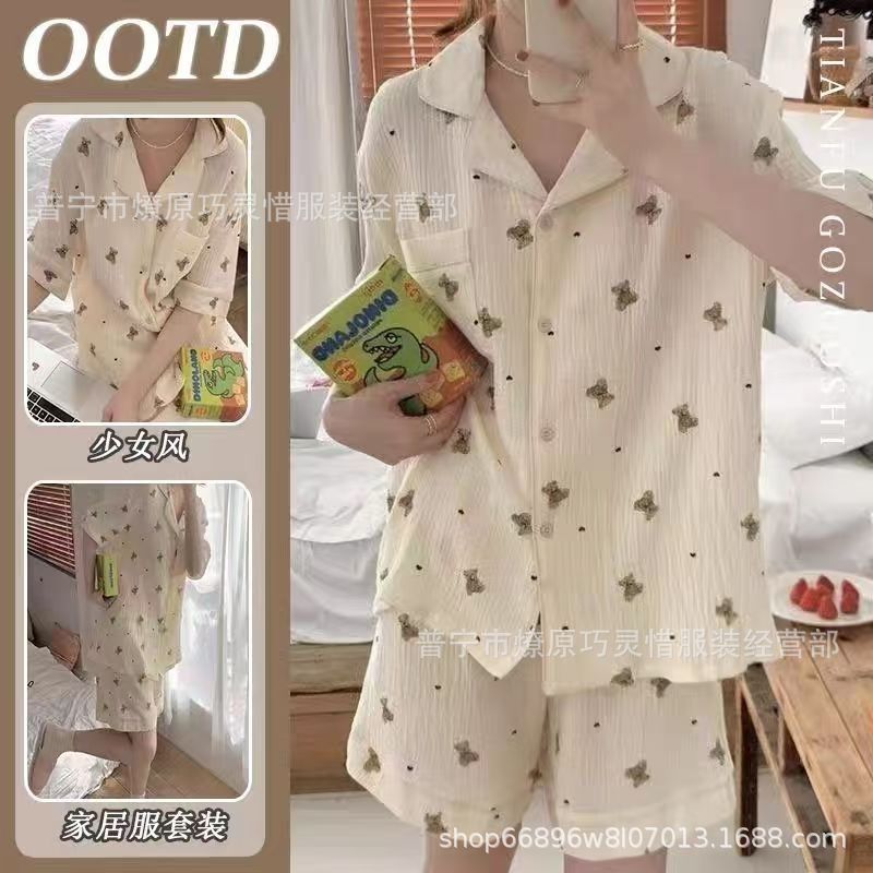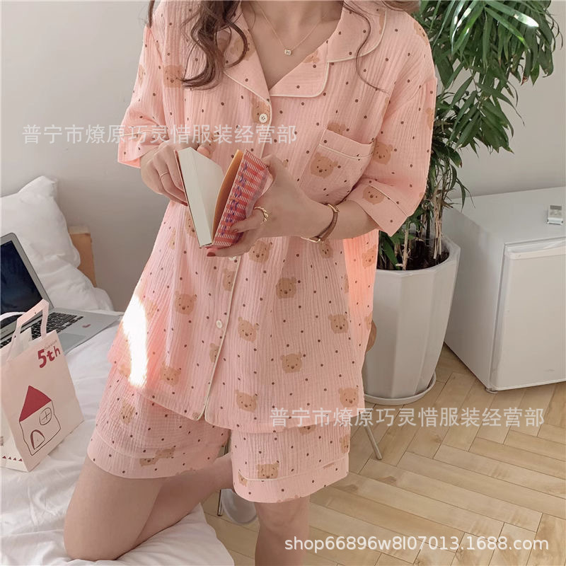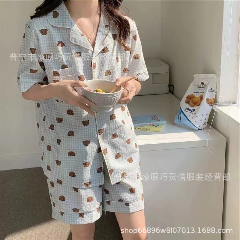 여름 새로운 반팔 반바지 버블 면 잠옷 여자의 귀여운 여자의 달콤한 가정 옷 카디건 세트 겉옷스토어 가기