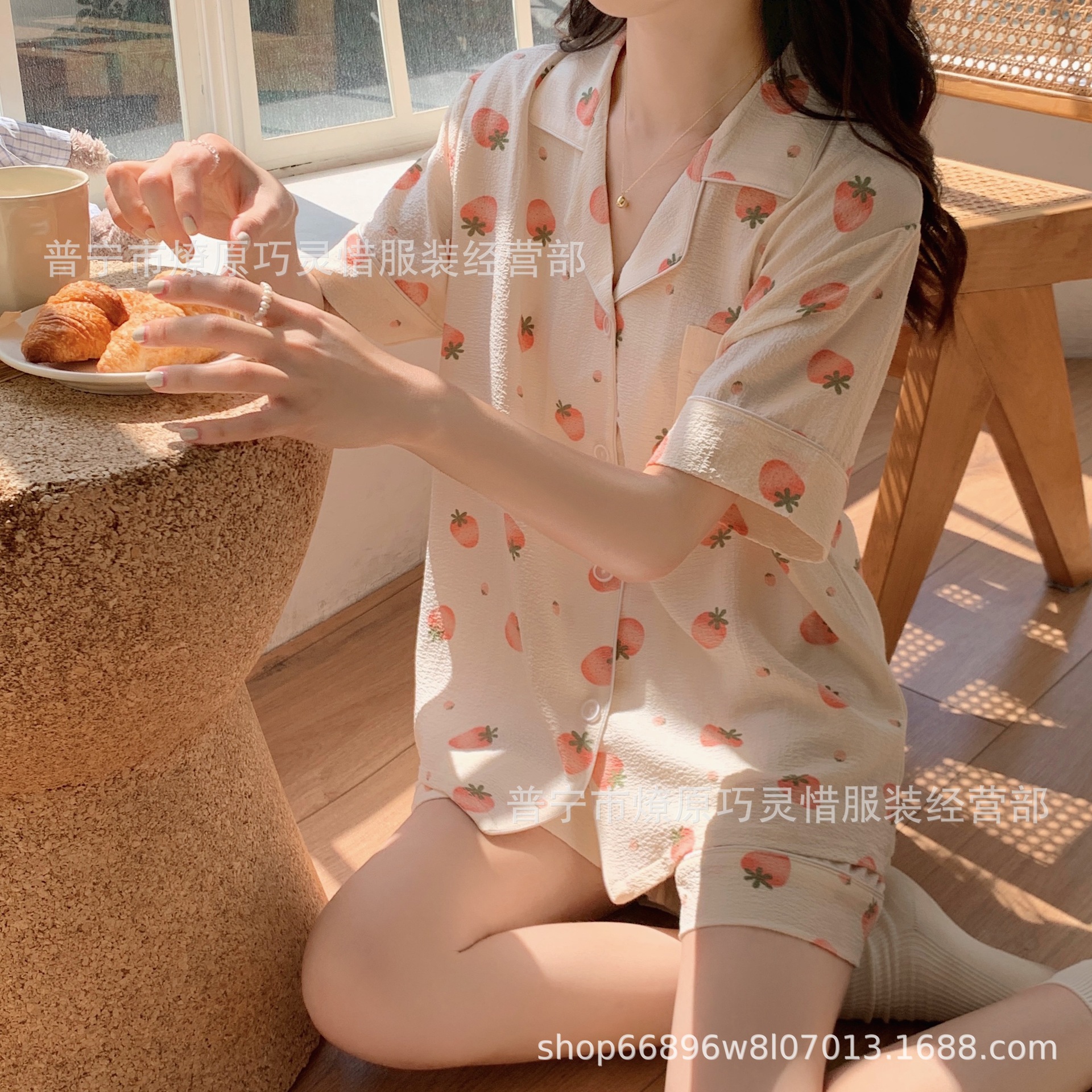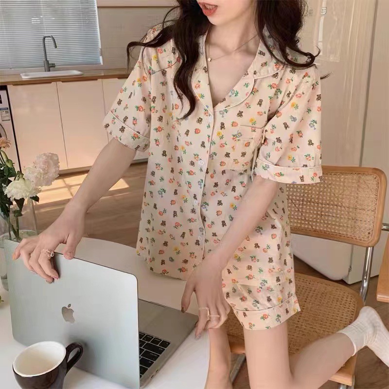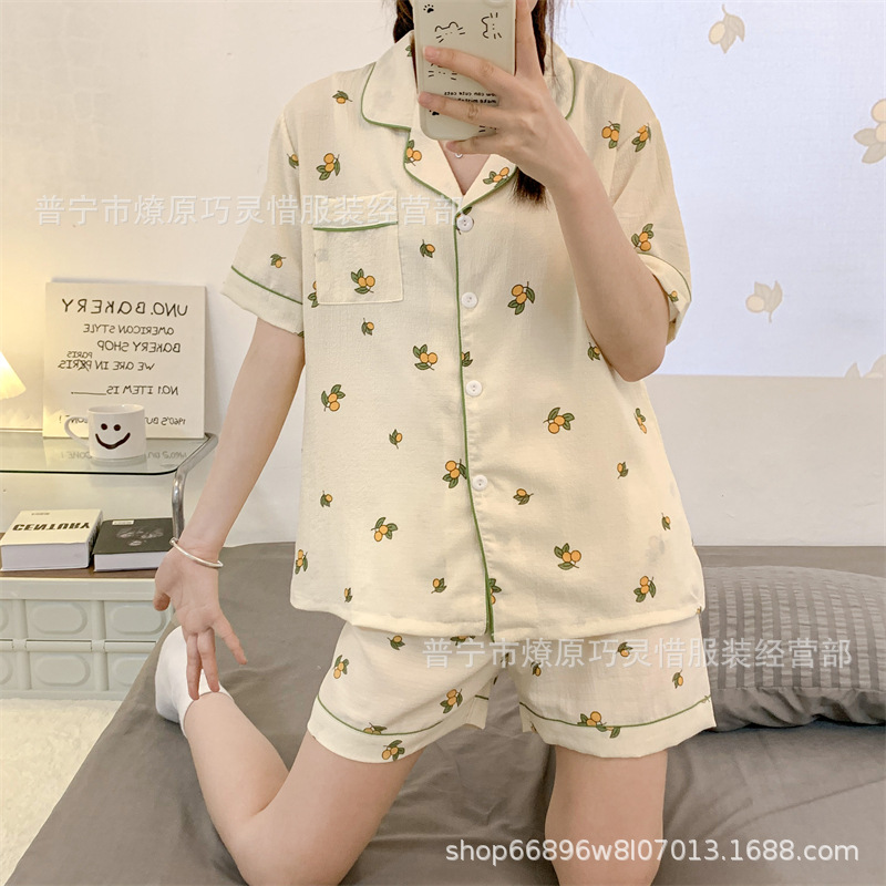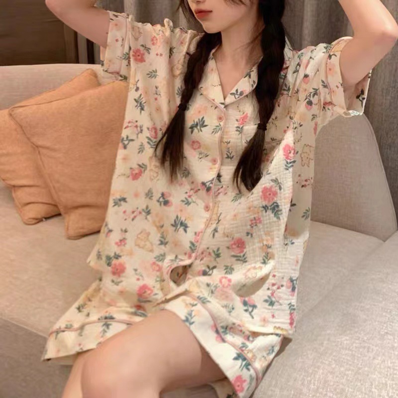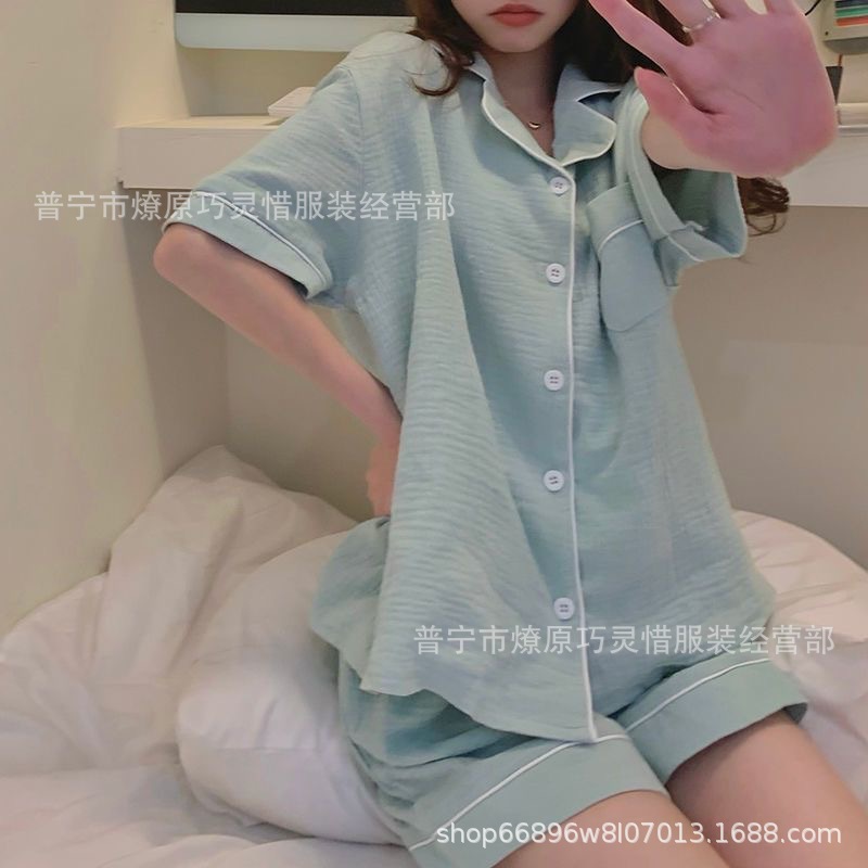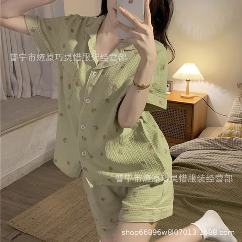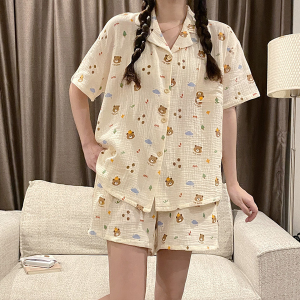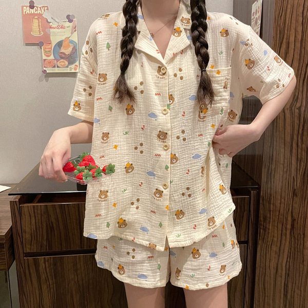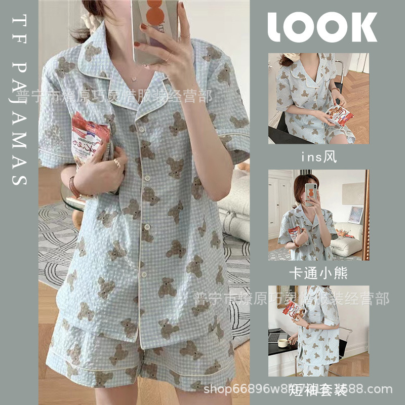 여름 새로운 반팔 반바지 버블 면 잠옷 여자의 귀여운 여자의 달콤한 가정 옷 카디건 세트 겉옷스토어 가기