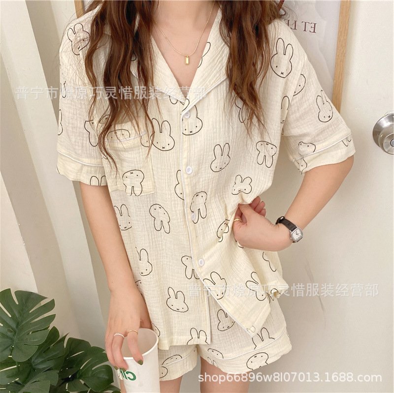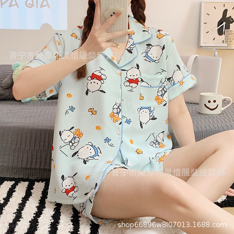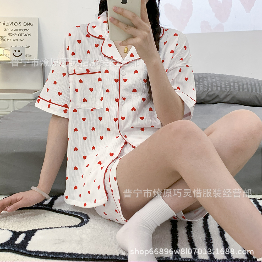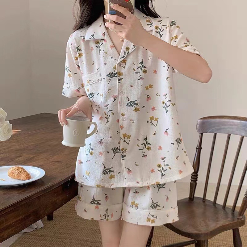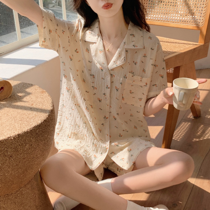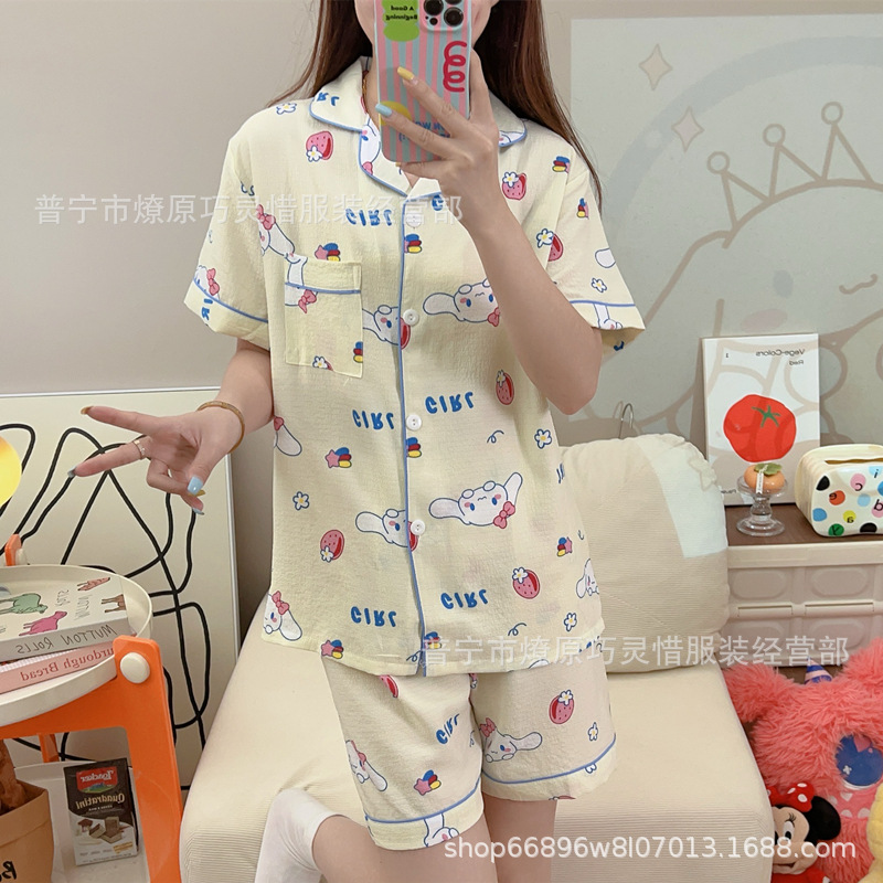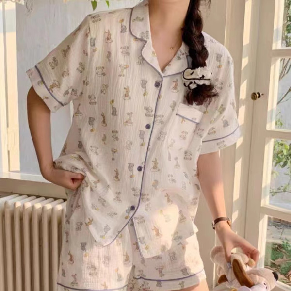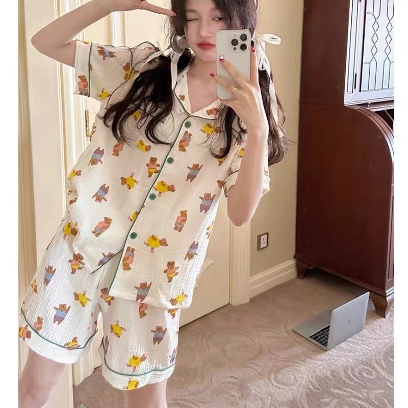 여름 새로운 반팔 반바지 버블 면 잠옷 여자의 귀여운 여자의 달콤한 가정 옷 카디건 세트 겉옷스토어 가기