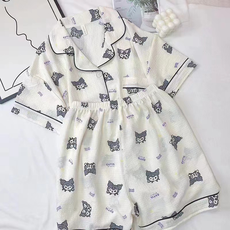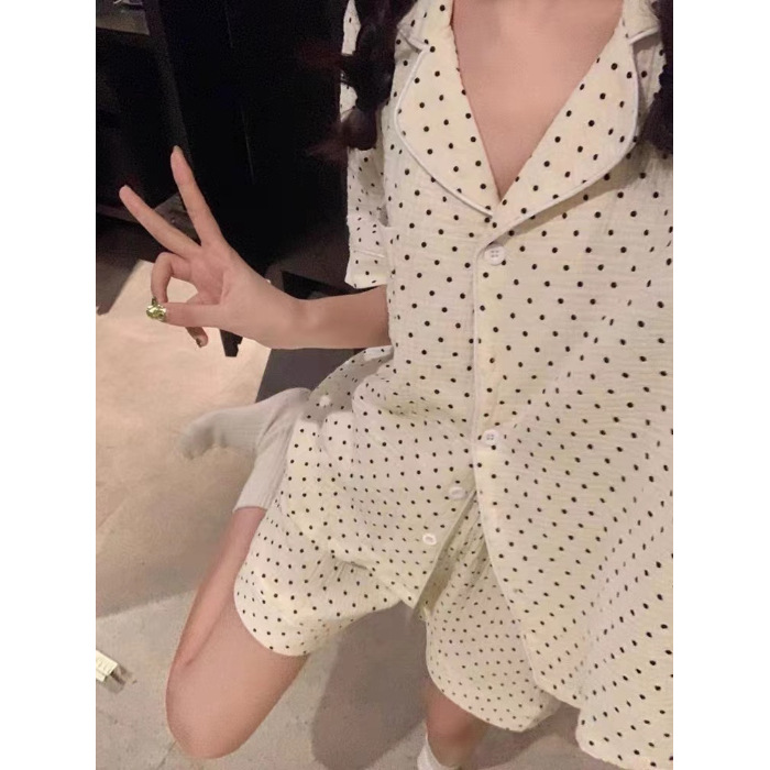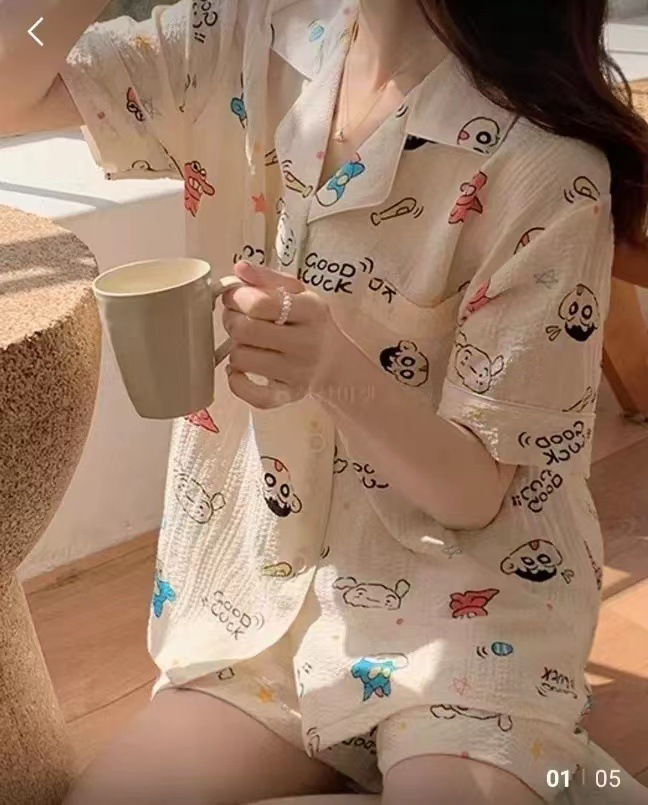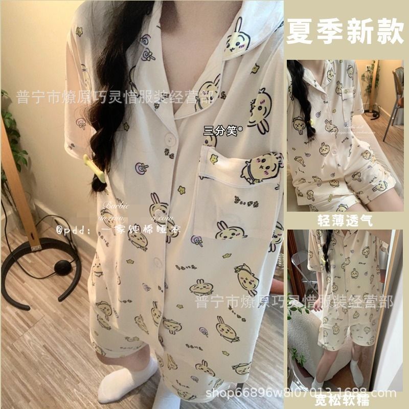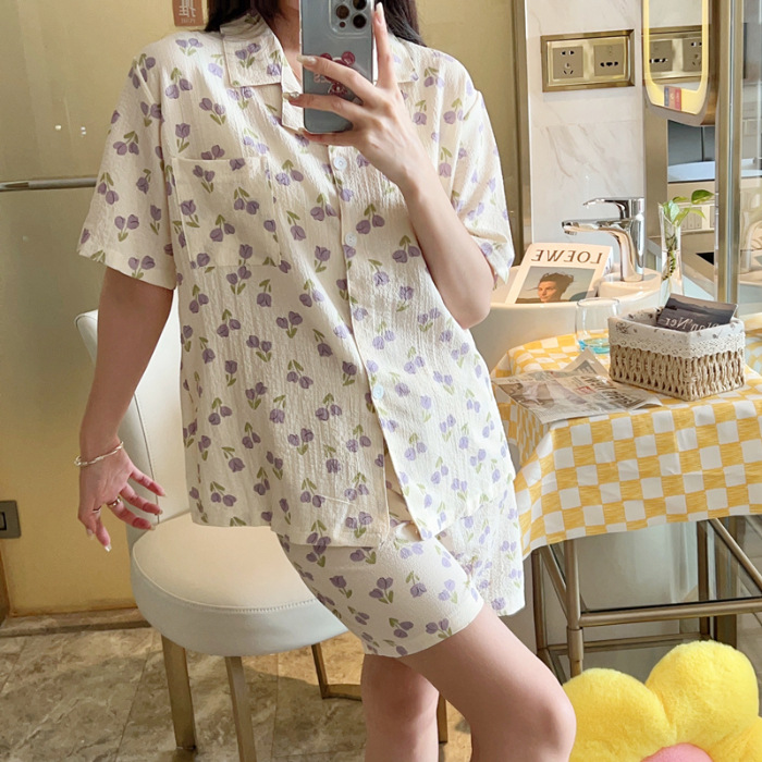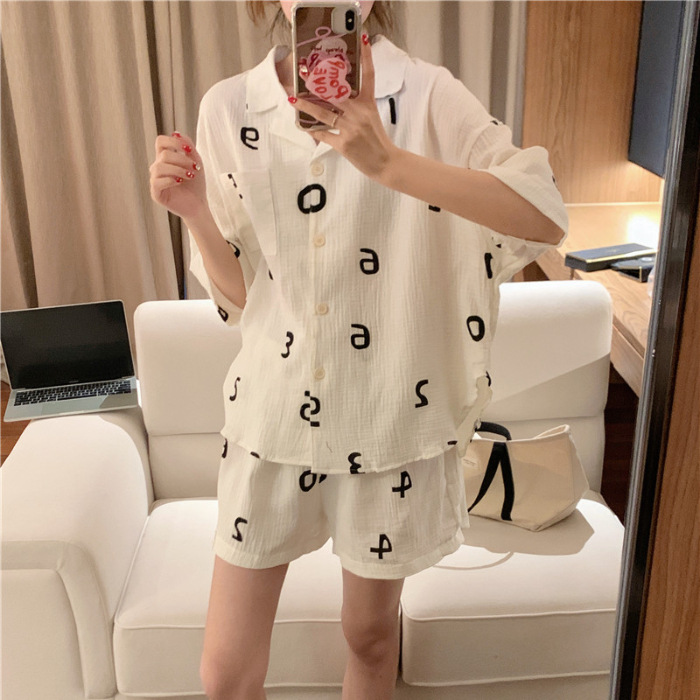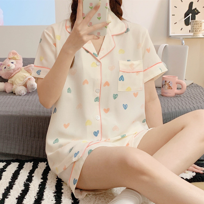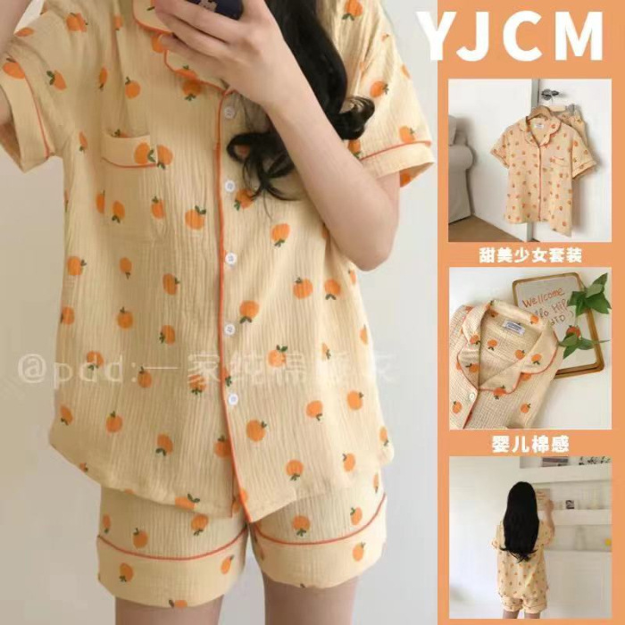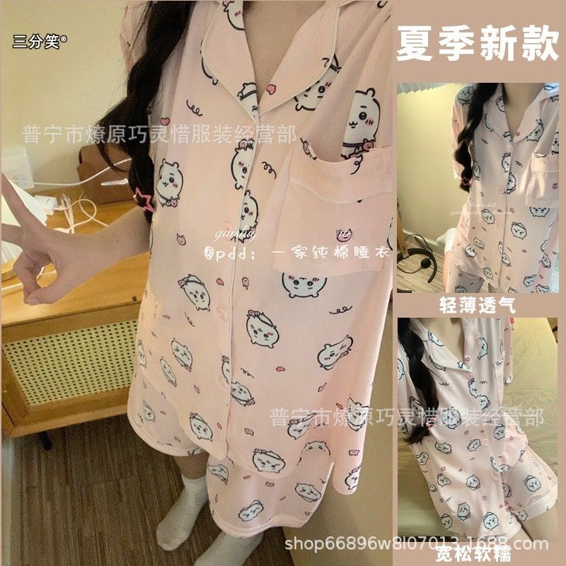 여름 새로운 반팔 반바지 버블 면 잠옷 여자의 귀여운 여자의 달콤한 가정 옷 카디건 세트 겉옷스토어 가기