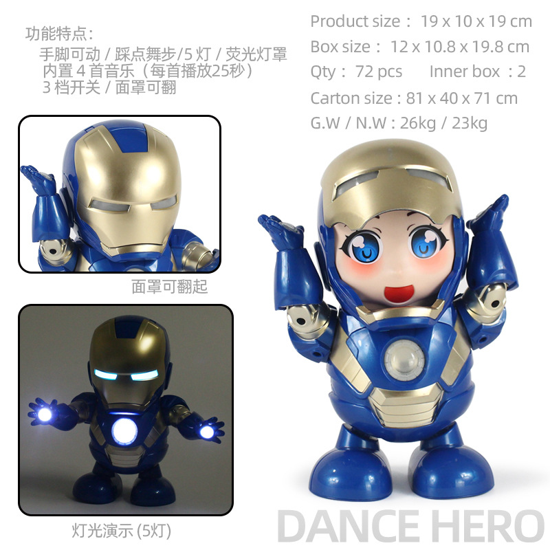 蓝女版钢铁英雄:彩盒尺寸:12*10.8*19.8cm,外箱尺寸:84*40*71cm,箱规:72盒/箱。