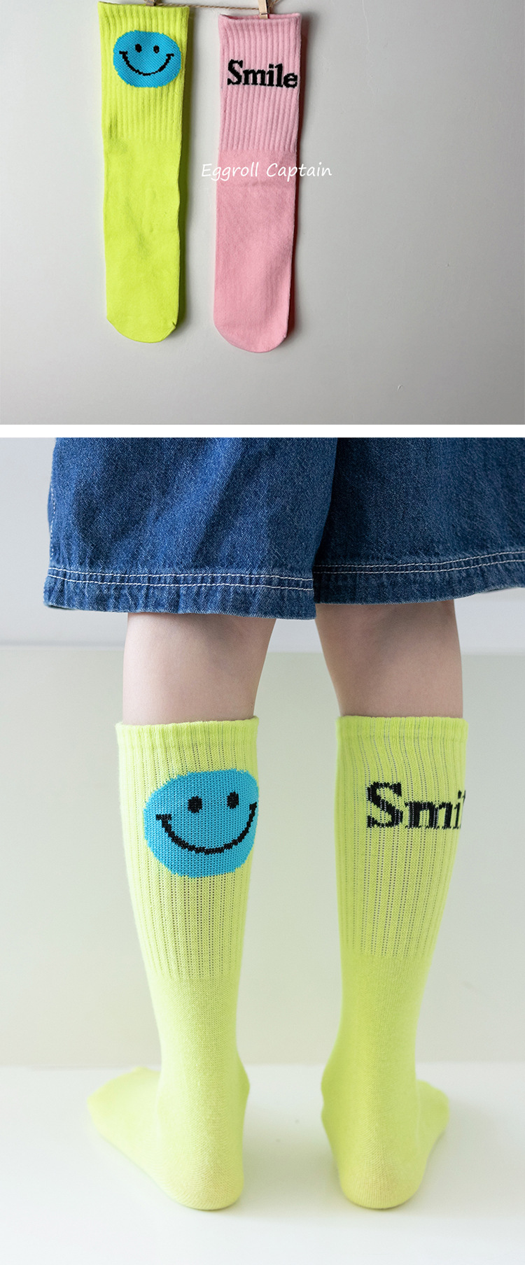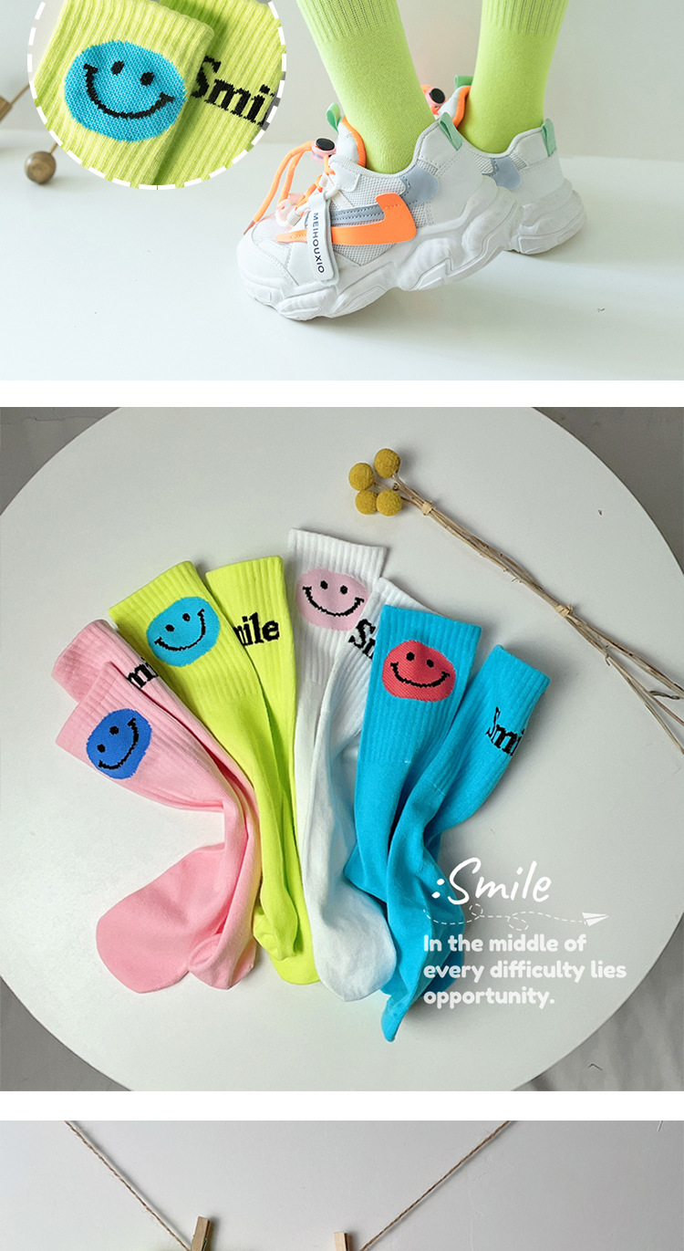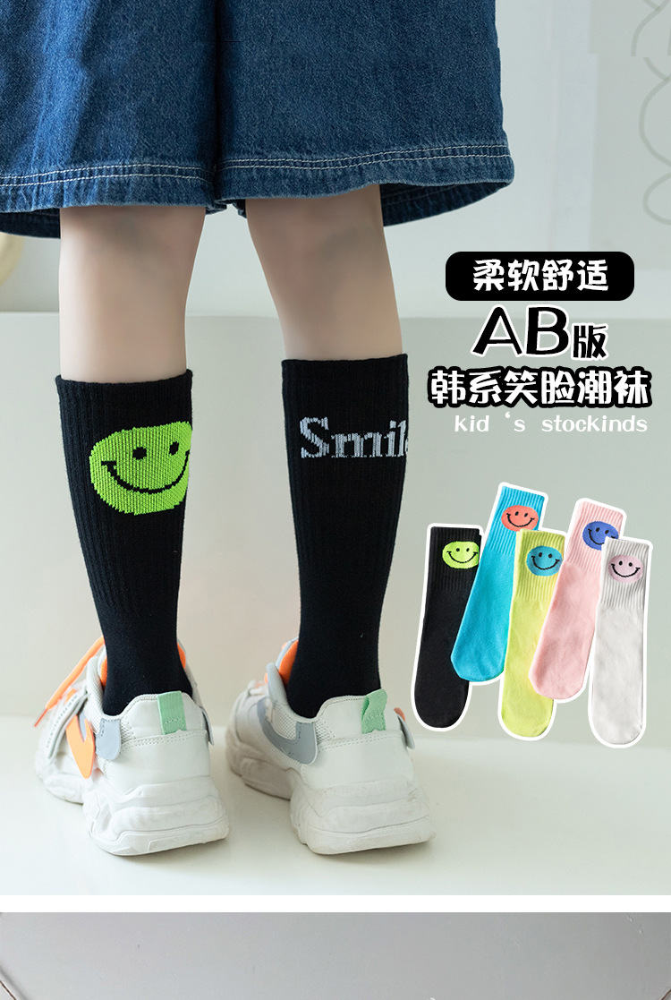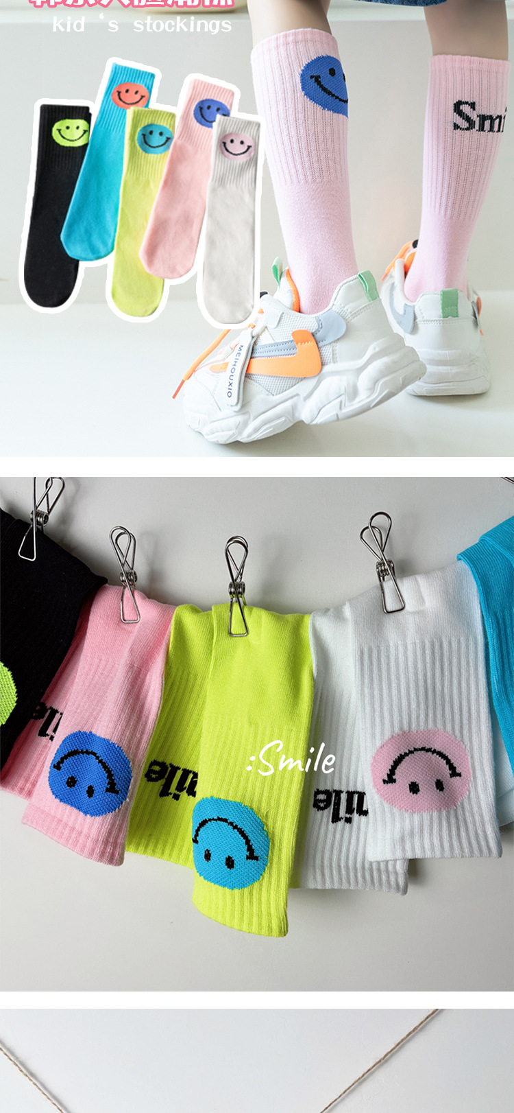 새로운 어린이 유행 양말 AB 버전 소년 소녀 송아지 양말 아기 높은 양말 한국 스마일 얼굴 양말 핑크 그린
