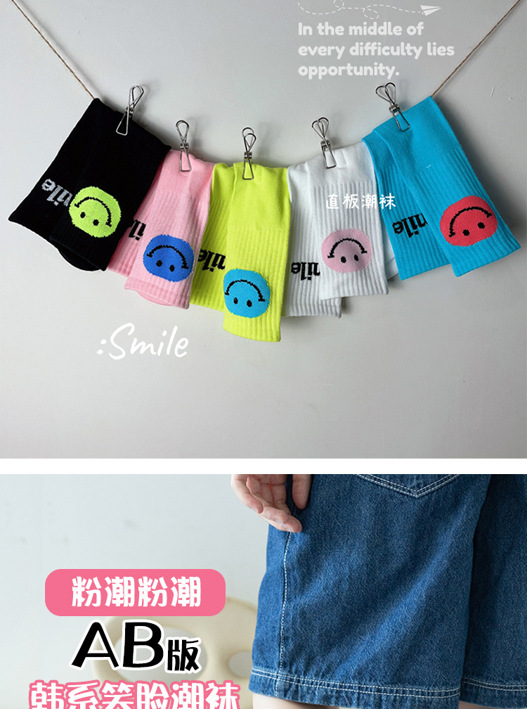 새로운 어린이 유행 양말 AB 버전 소년 소녀 송아지 양말 아기 높은 양말 한국 스마일 얼굴 양말 핑크 그린스토어 가기