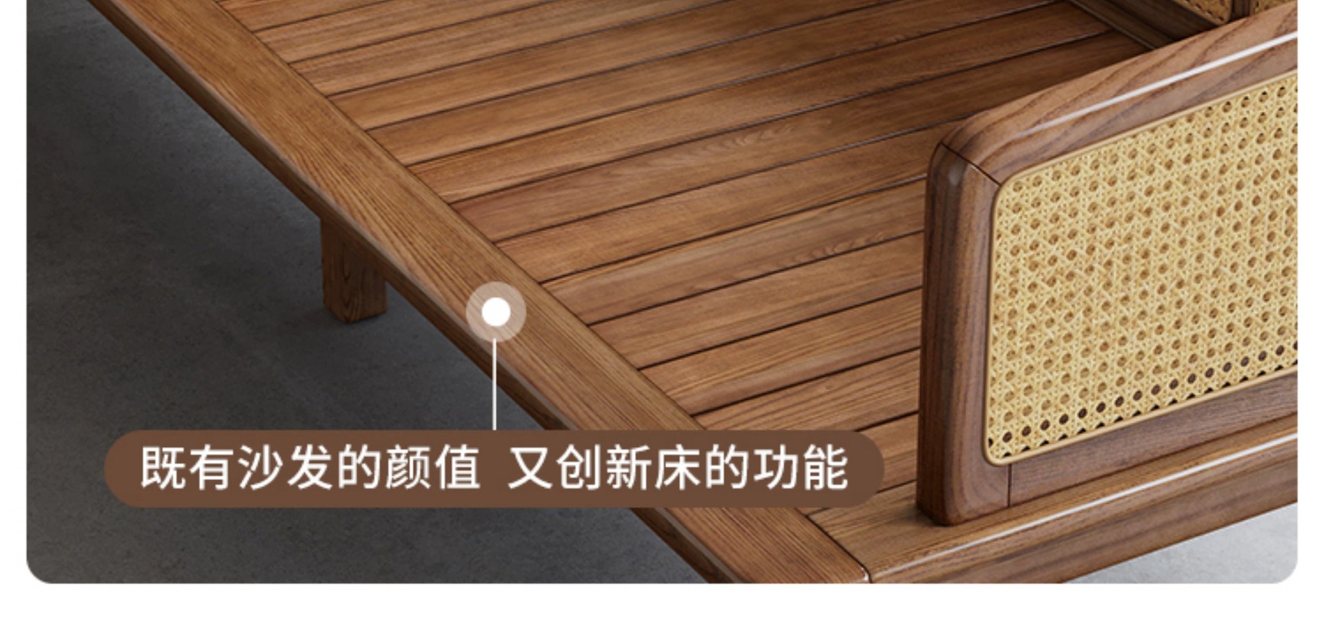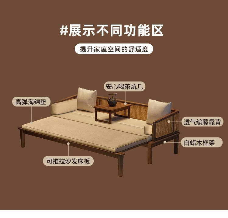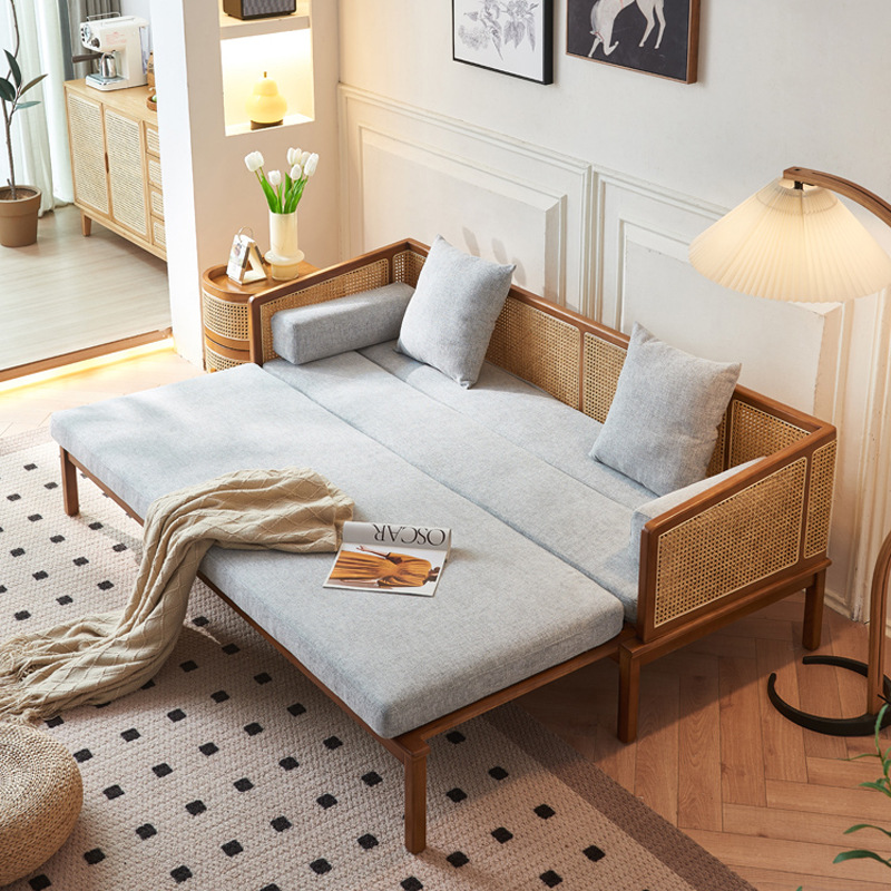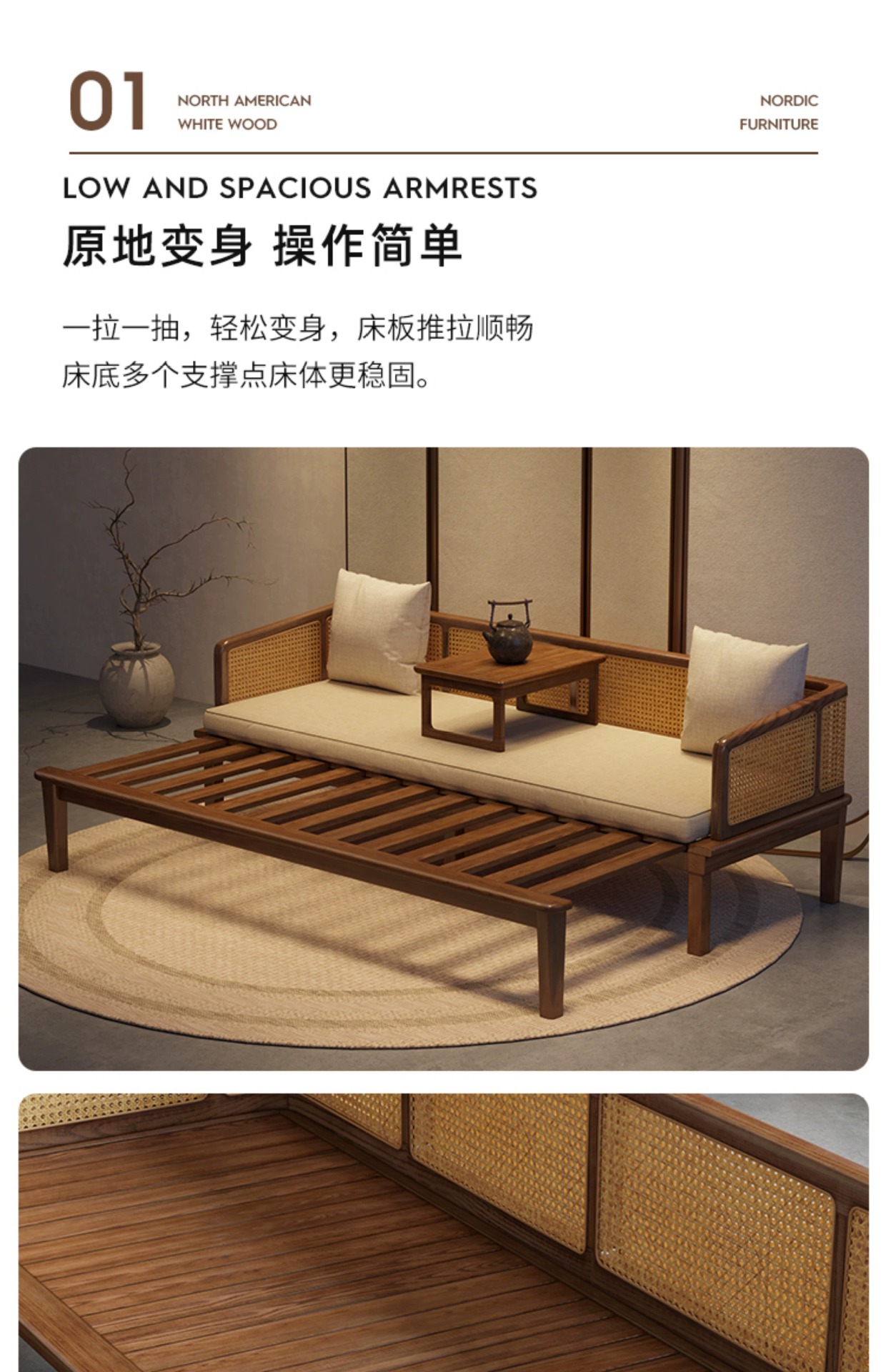 새로운 중국식 등나무 짠 단단한 나무 소파 베드 푸시 풀 소형 아파트 가정용 거실 텔레스코픽 이중 사용 소파 홈스테이 호텔