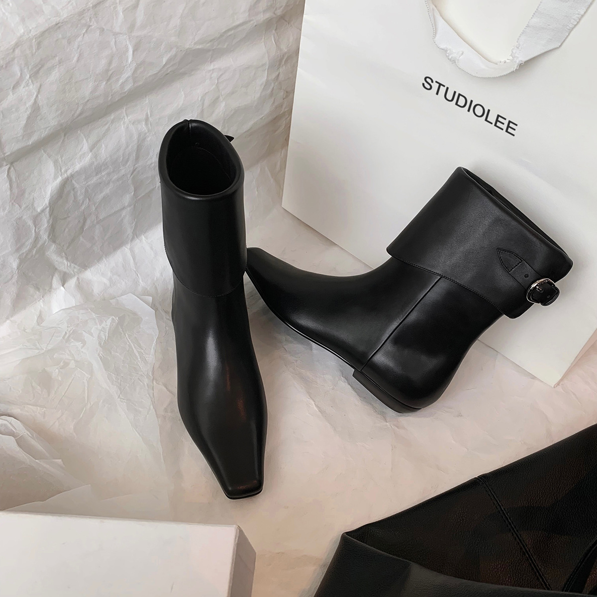포도 어머니 스튜디오 펜드라 화보 ~ 세련된 스퀘어 헤드 로우 힐 벨트 버클 접이식 짧은 부츠 여성스토어 가기