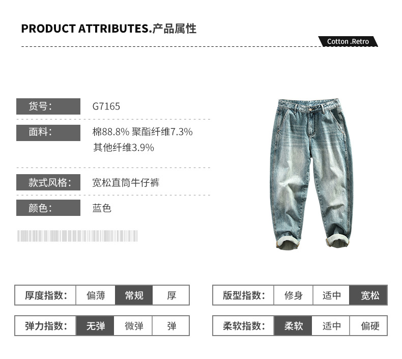 G7165 남성용 빈티지 세탁 청바지 한 세대의 머리카락