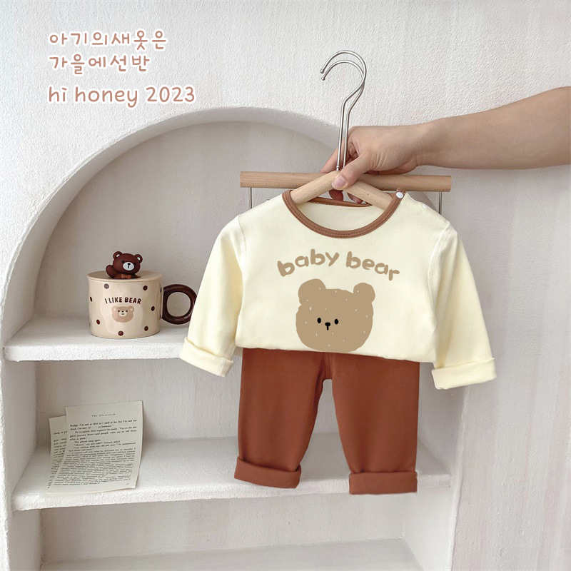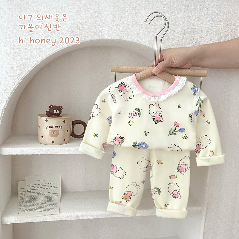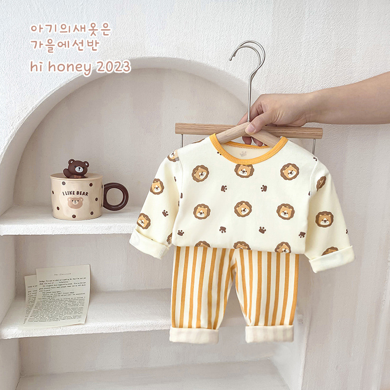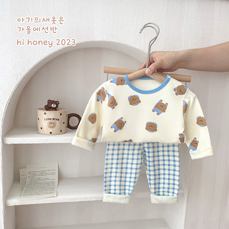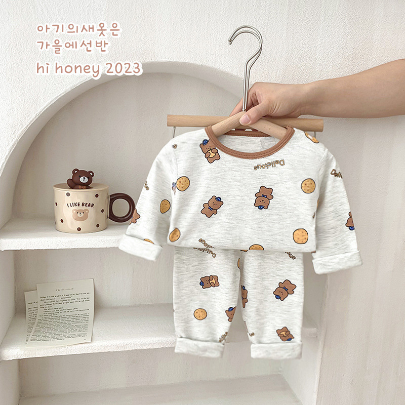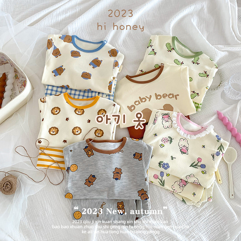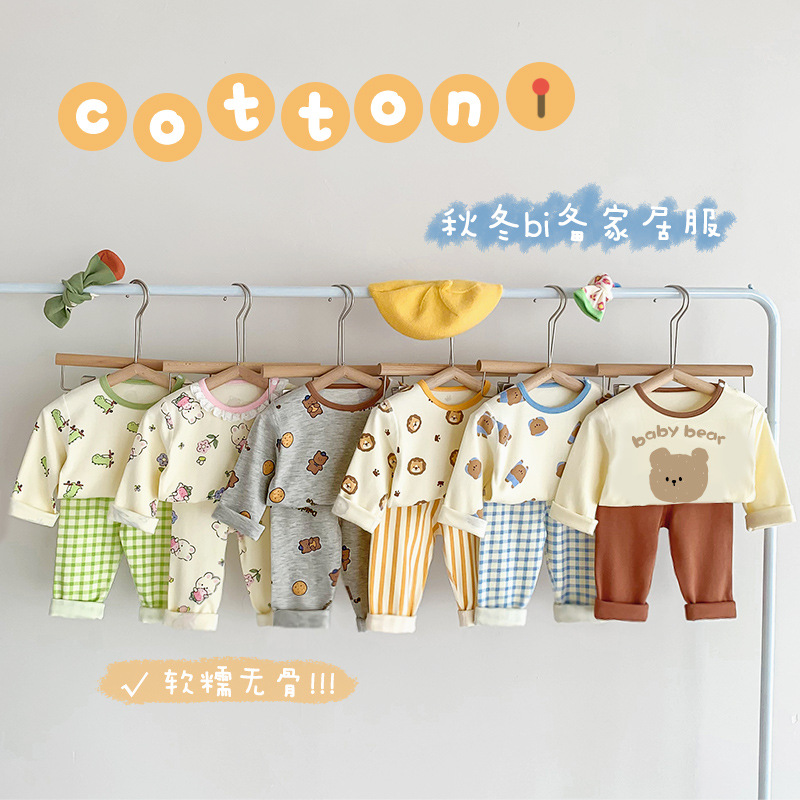 25가지 새로운 한국 스타일 아동복 세트, 면 소재의 무봉제 가을 옷, 남성 및 여성 잠옷, 아기 가을 겨울 옷스토어 가기