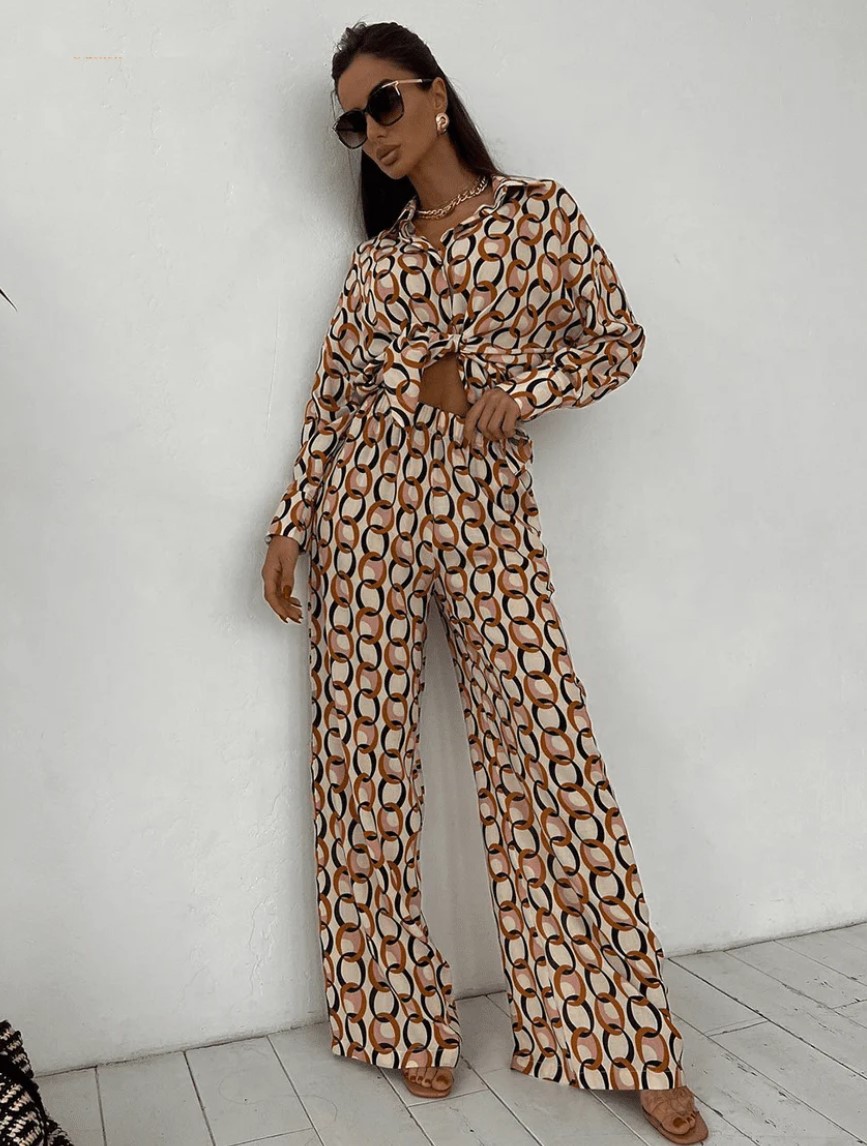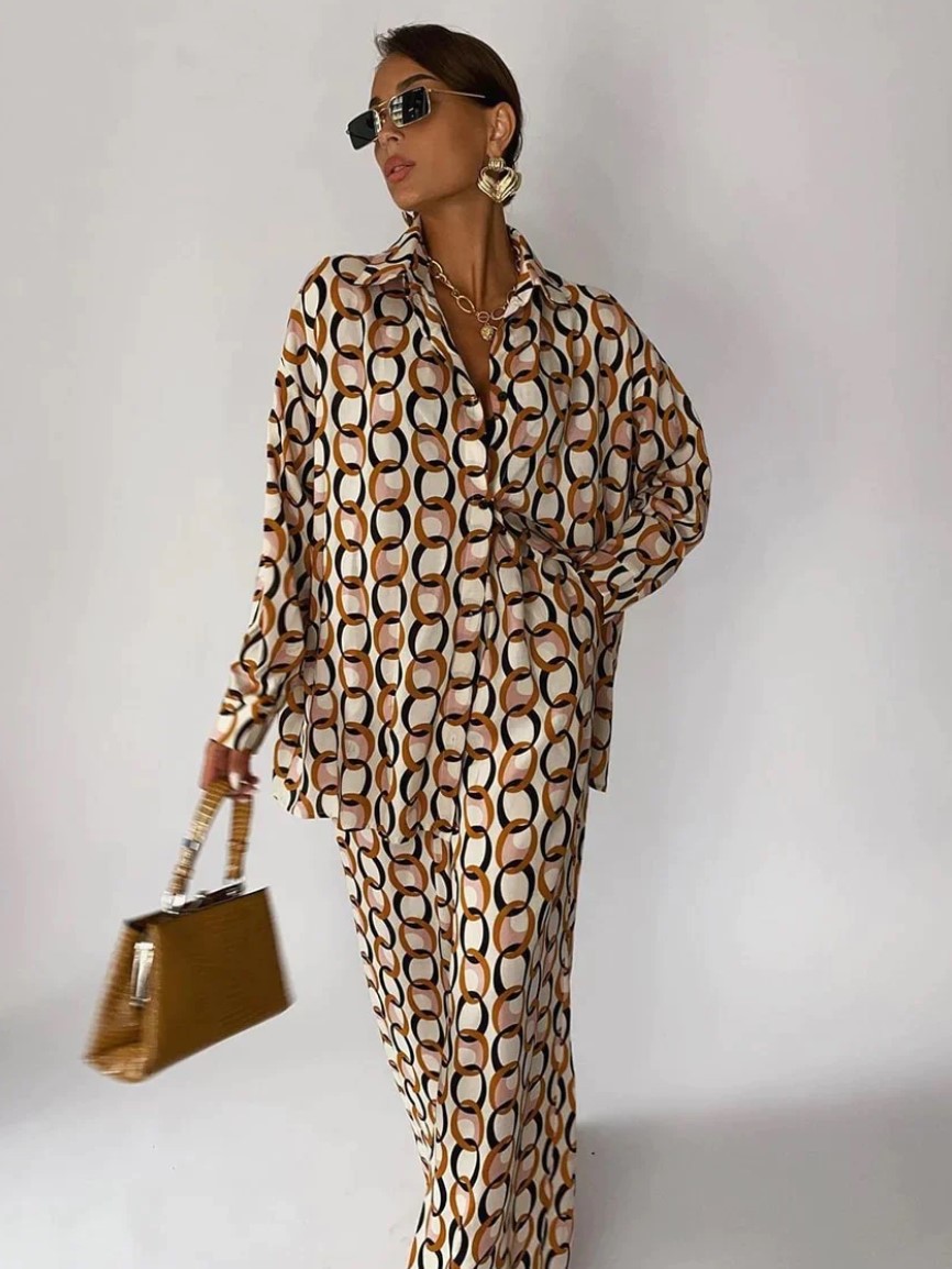 유럽과 미국의 신상품 세트, 패셔너블한 프린트 루즈핏 긴팔 셔츠+스트레이트 팬츠, 봄, 가을 여성복, 사계절용