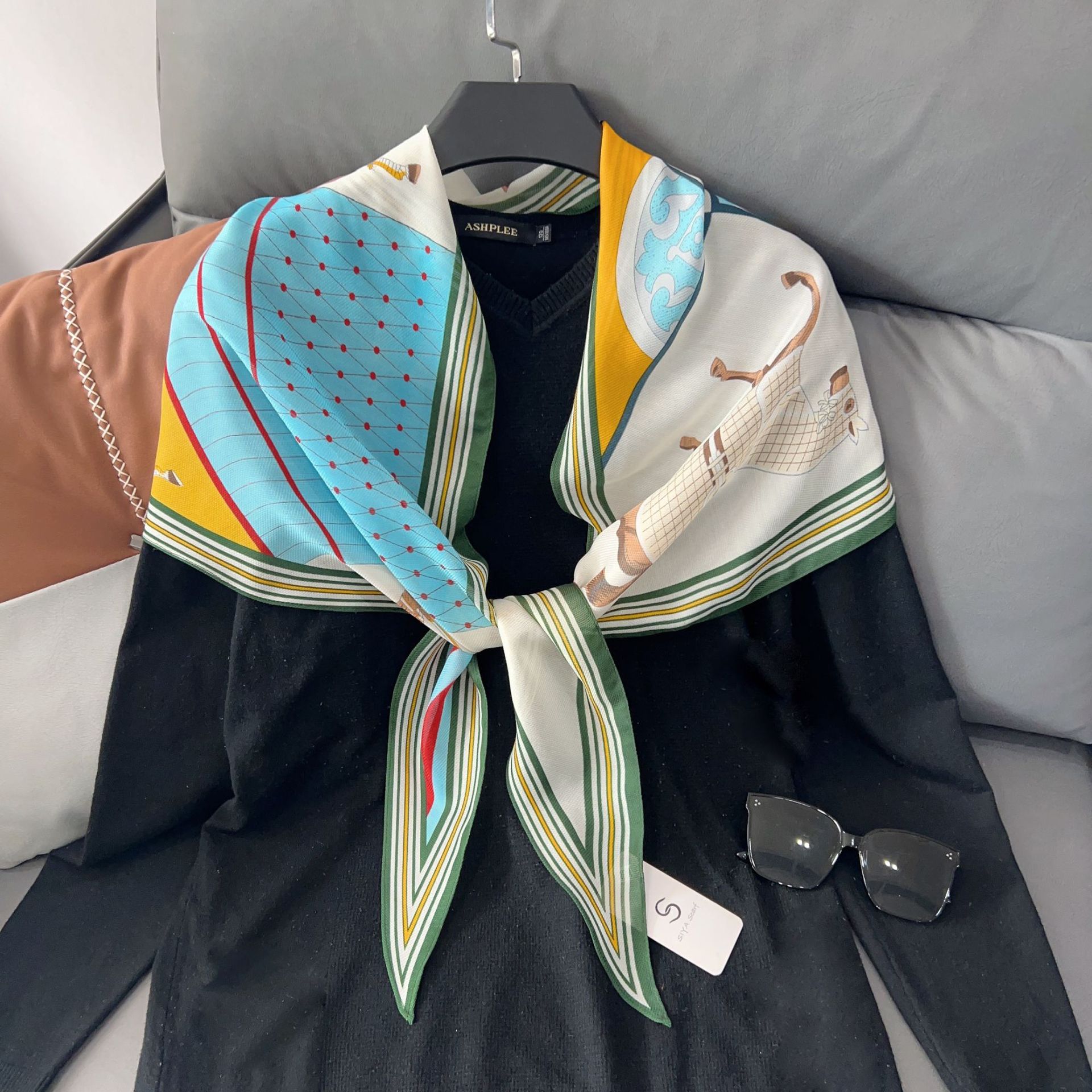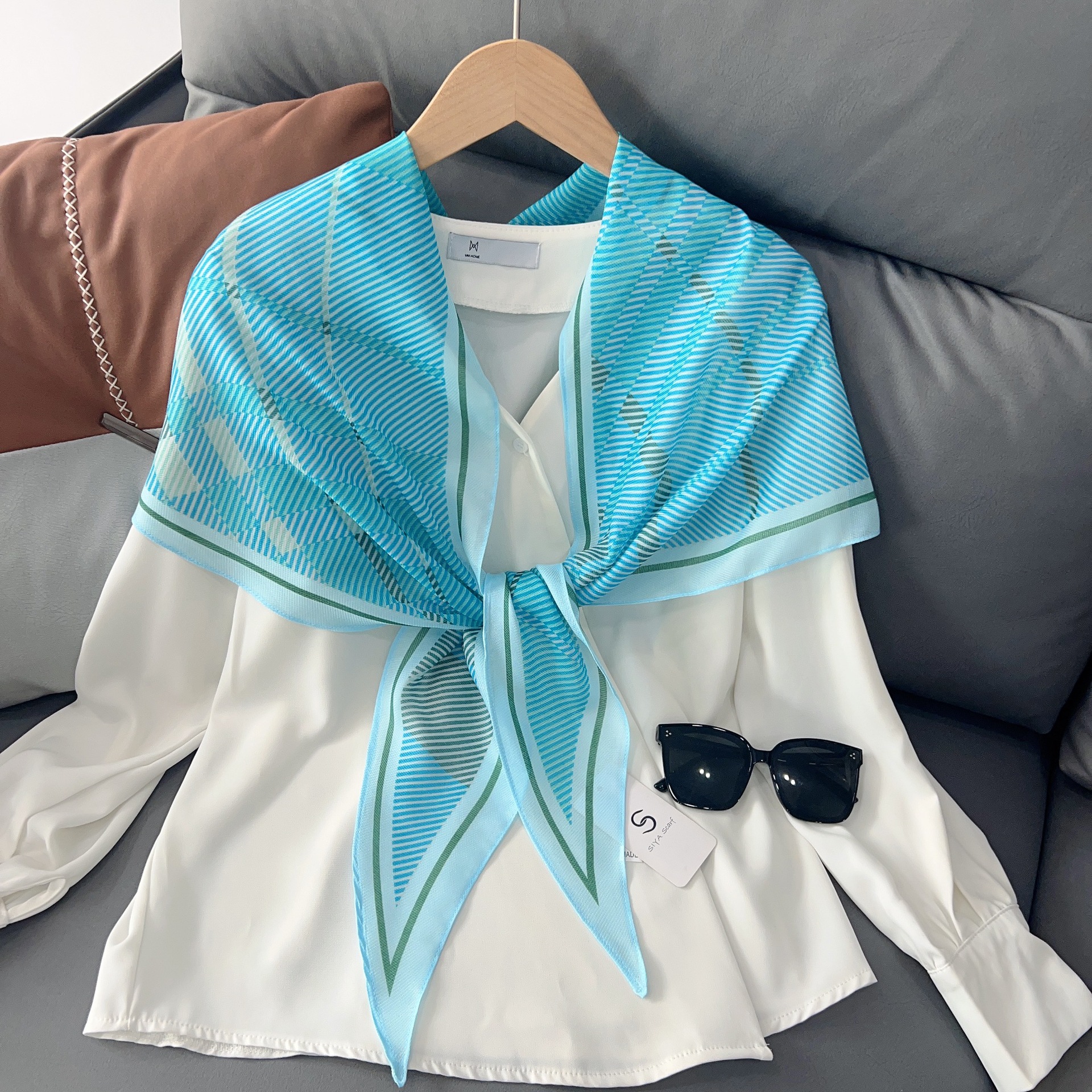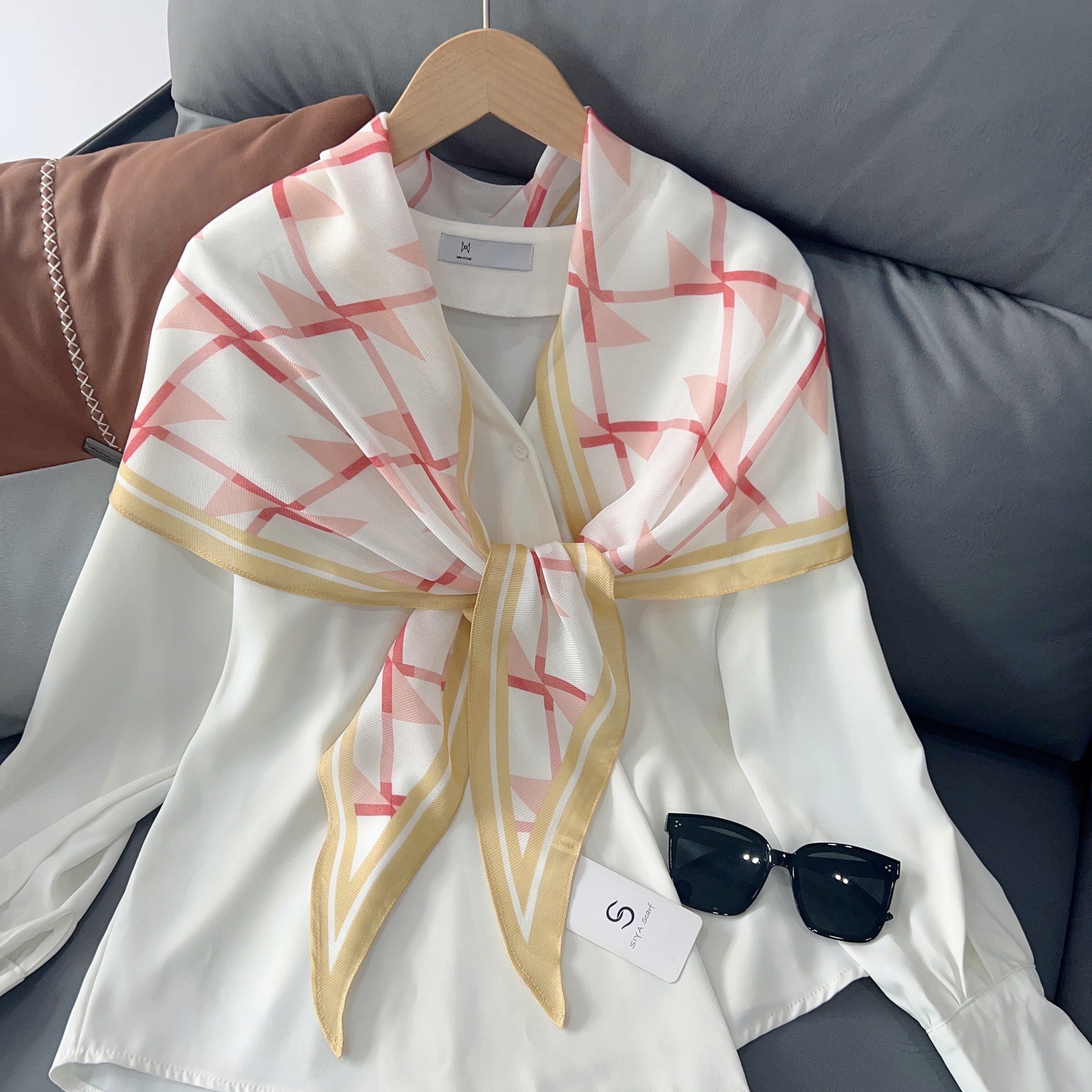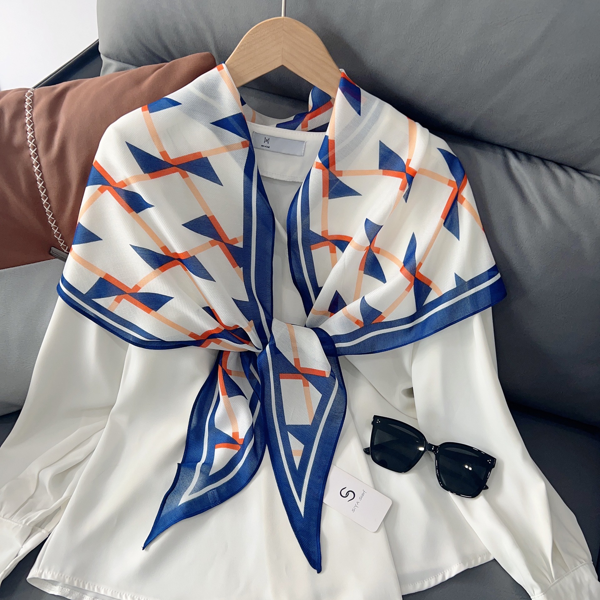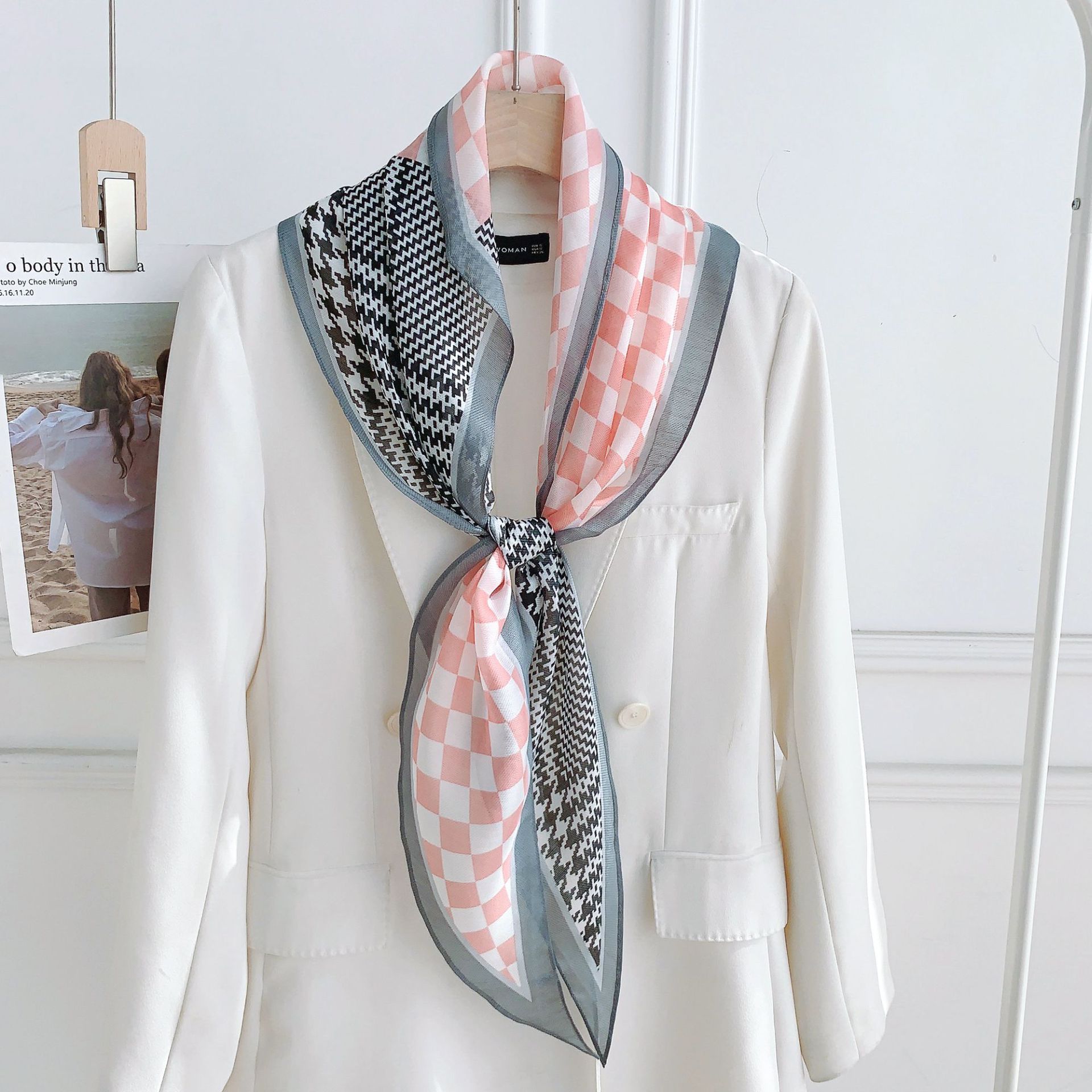 패셔너블한 프린트 얇은 매듭 장식 실크 스카프 여성용 2026 신상 컬러 블록 다이아몬드 모양 숄 자외선 차단 스몰 스카프스토어 가기