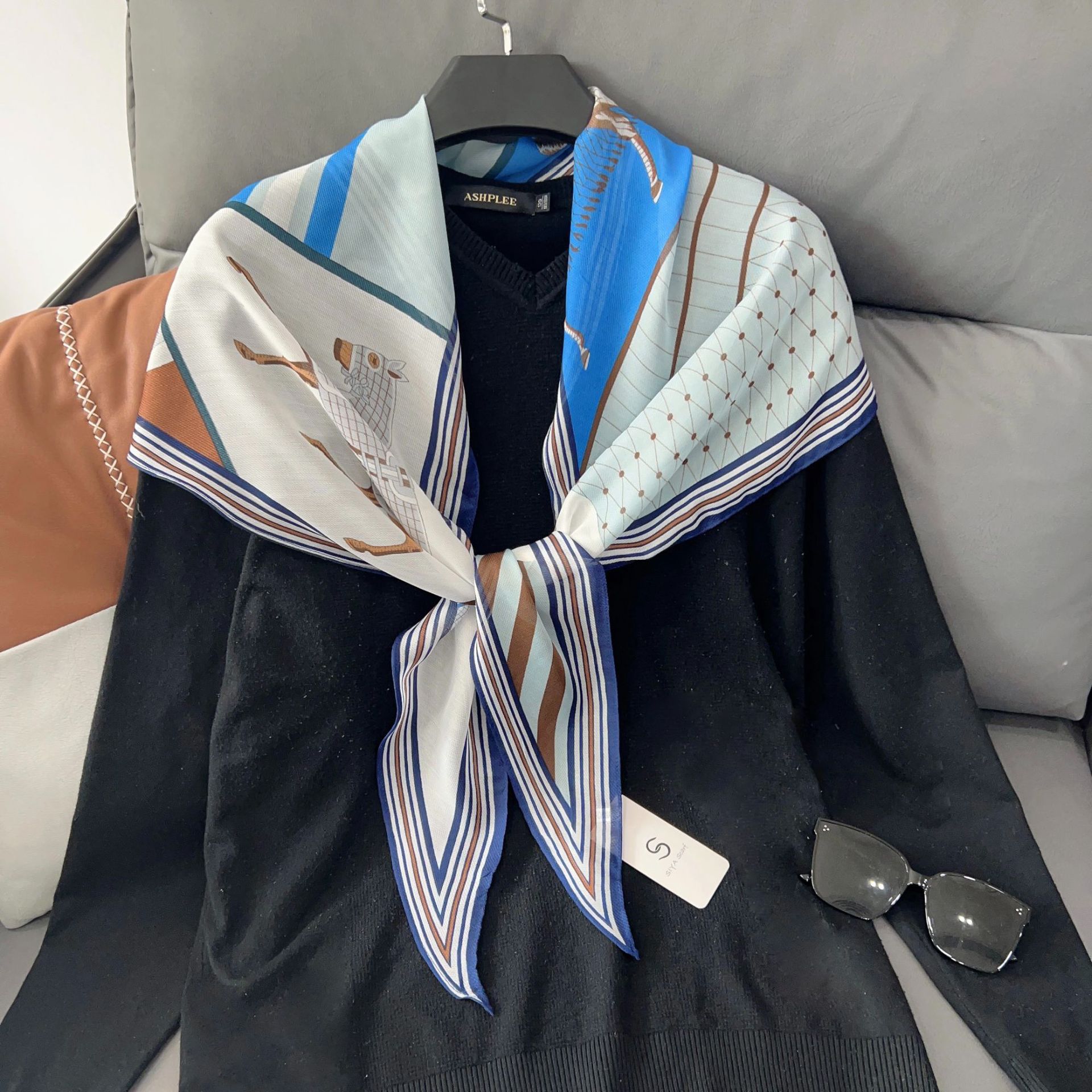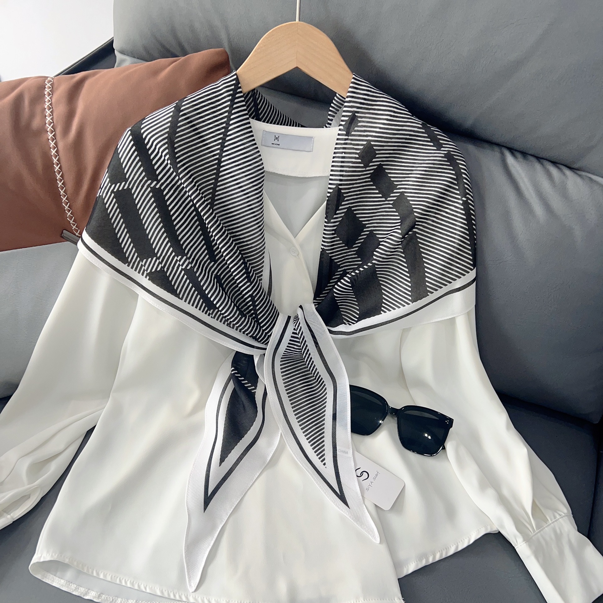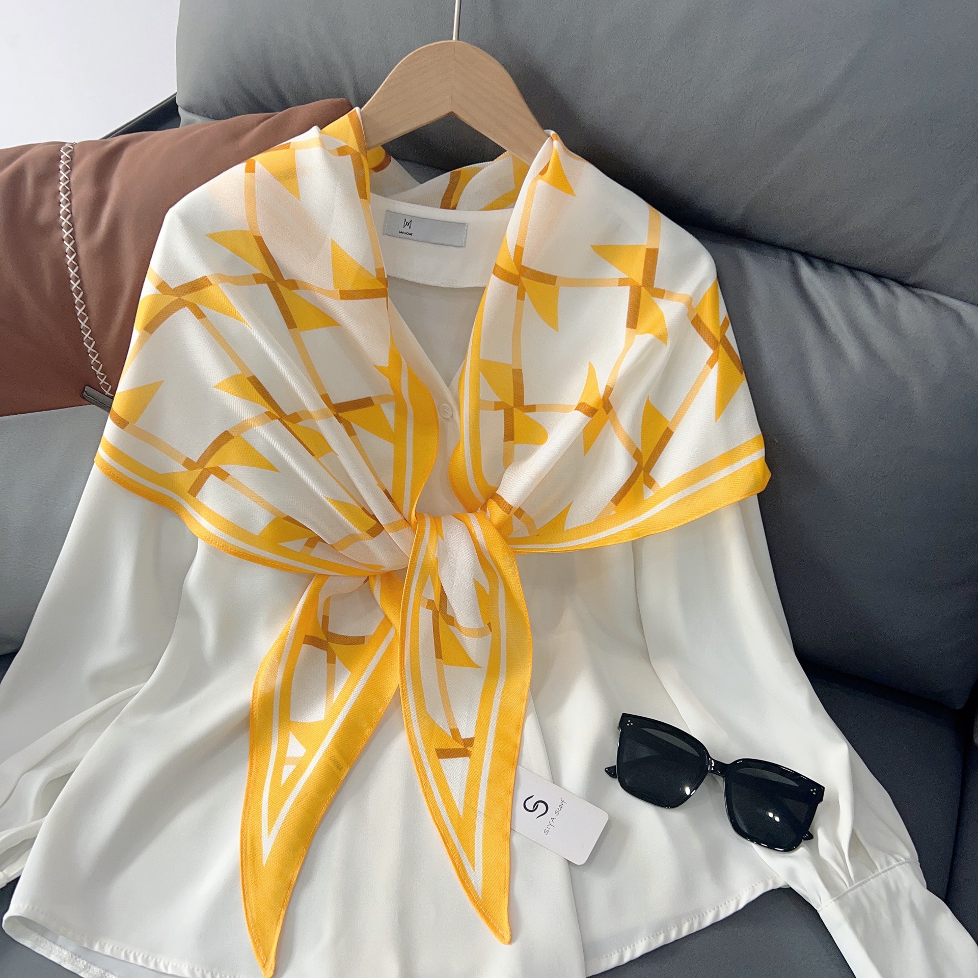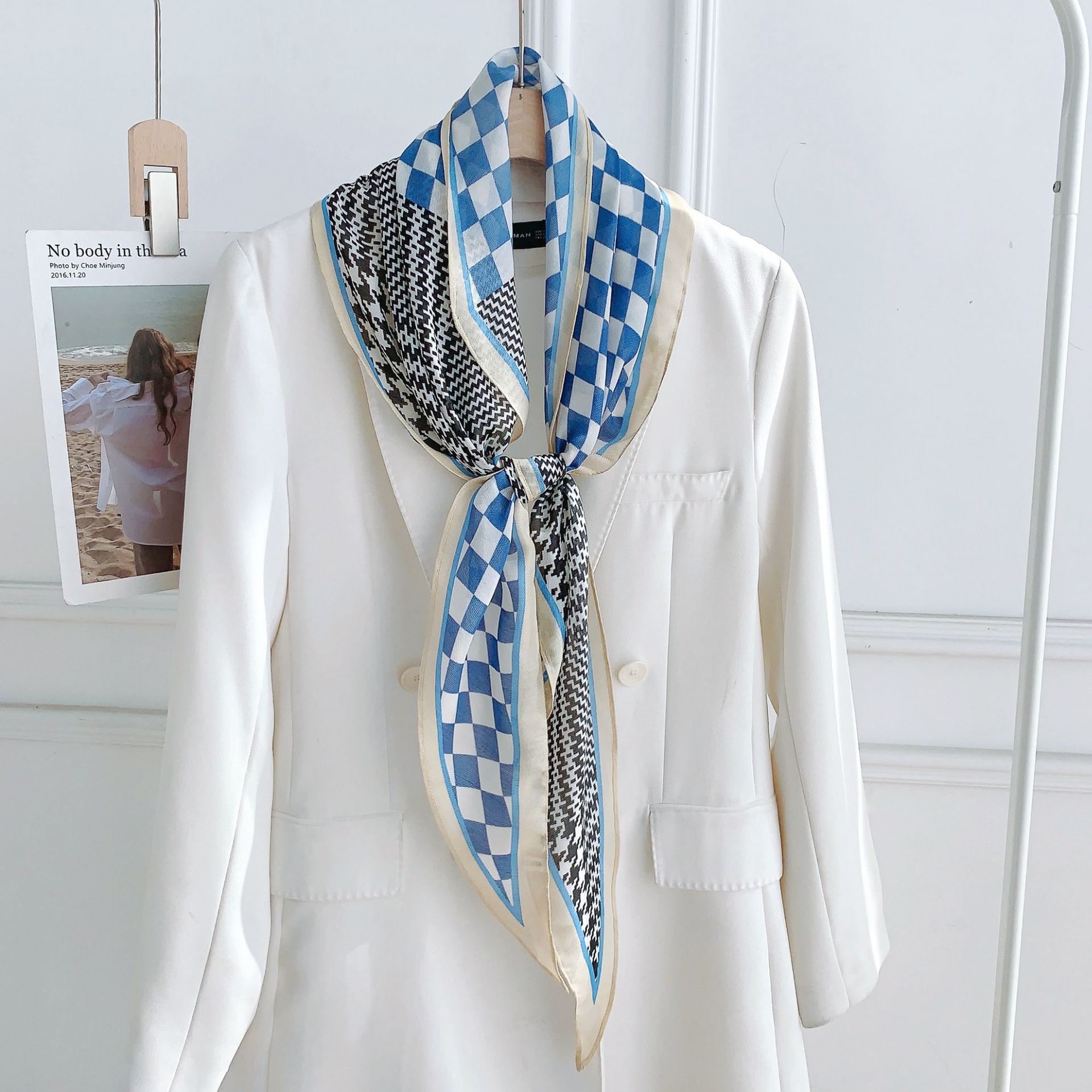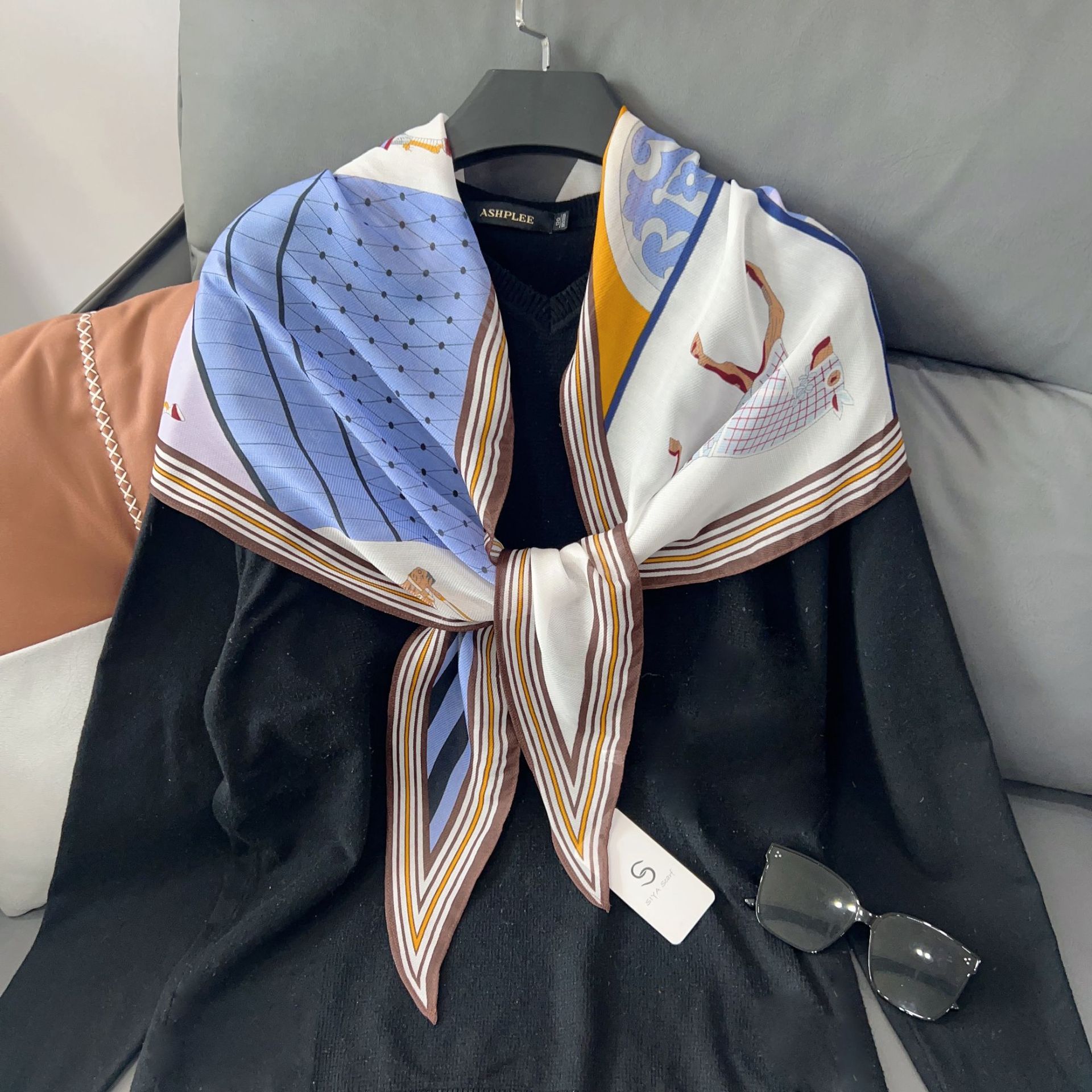 패셔너블한 프린트 얇은 매듭 장식 실크 스카프 여성용 2026 신상 컬러 블록 다이아몬드 모양 숄 자외선 차단 스몰 스카프스토어 가기