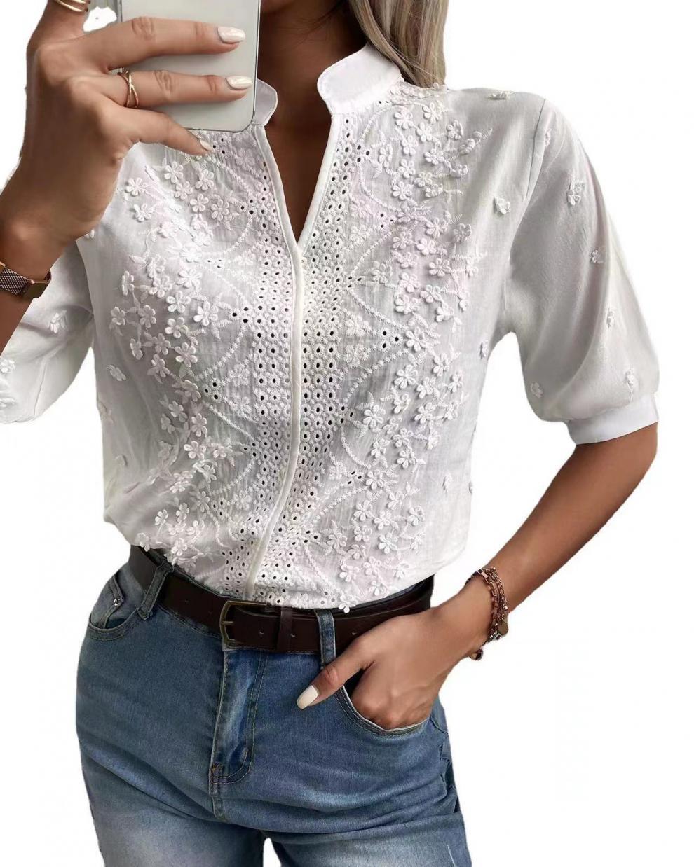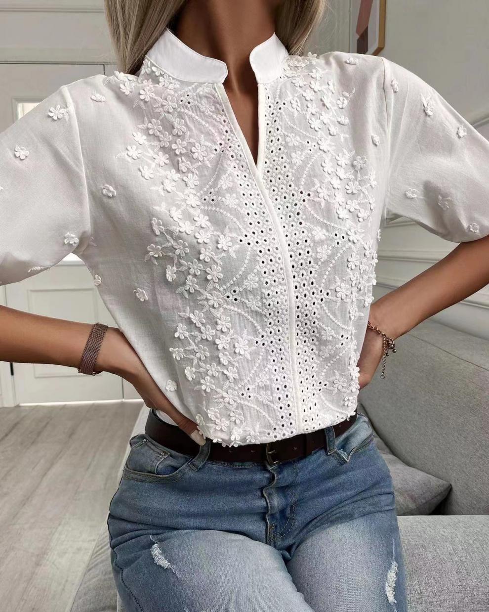 유럽과 미국 여성의 2023 새로운 여름 크로스 보더 패션 스탠딩 칼라 자수 중공 우아한 하프 슬리브 모든 매치 탑스토어 가기