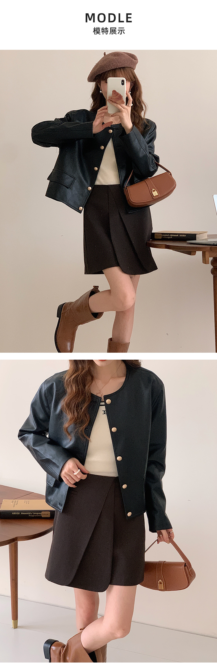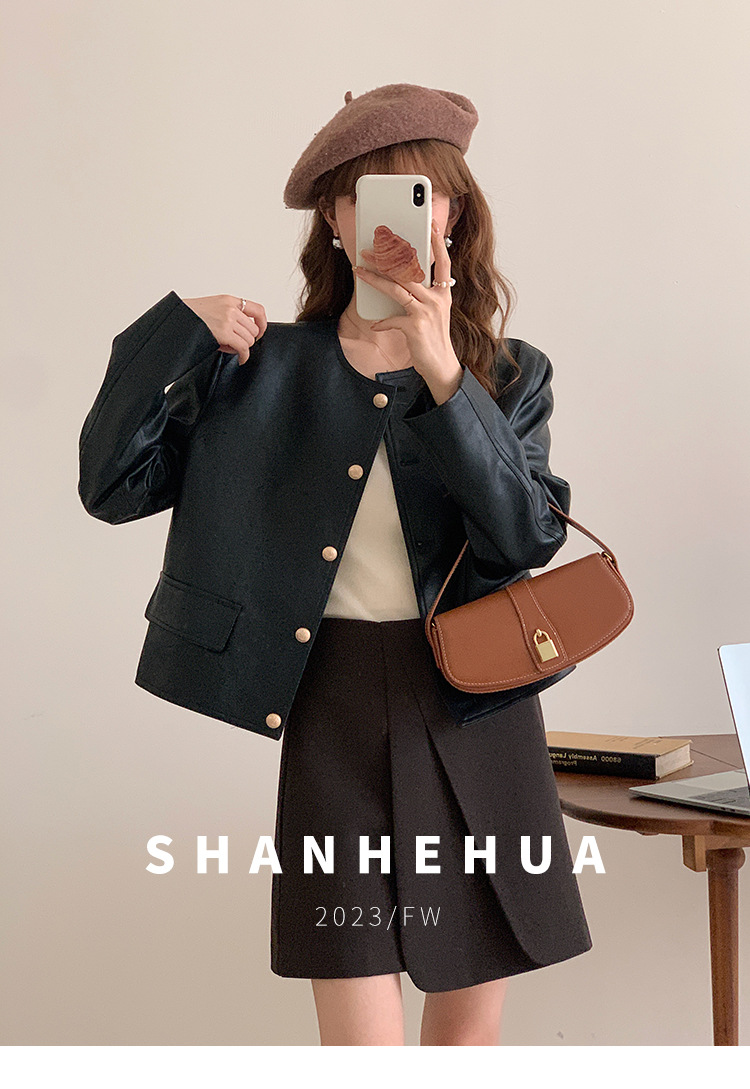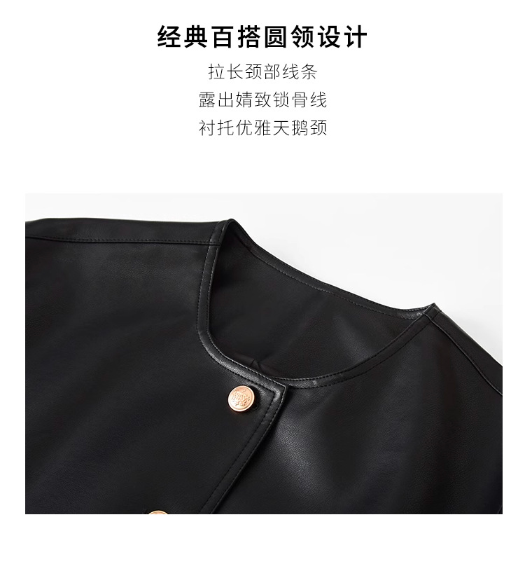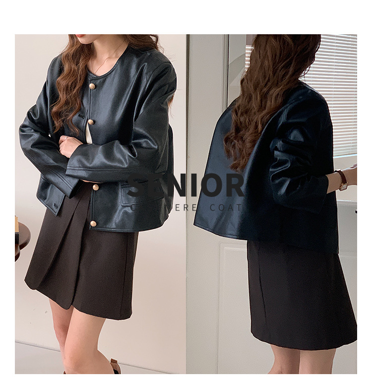 [벤 추] 유행 짧은 가죽 자켓 여자의 2023 이른 가을 새로운 한국 복고풍 라운드 넥 Pu 가죽 자켓