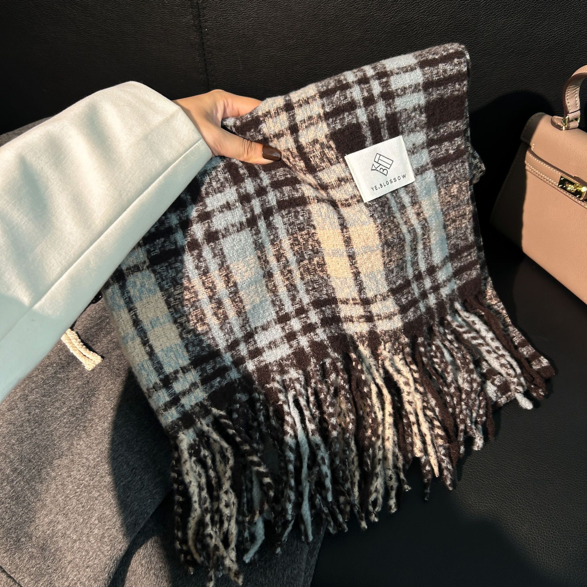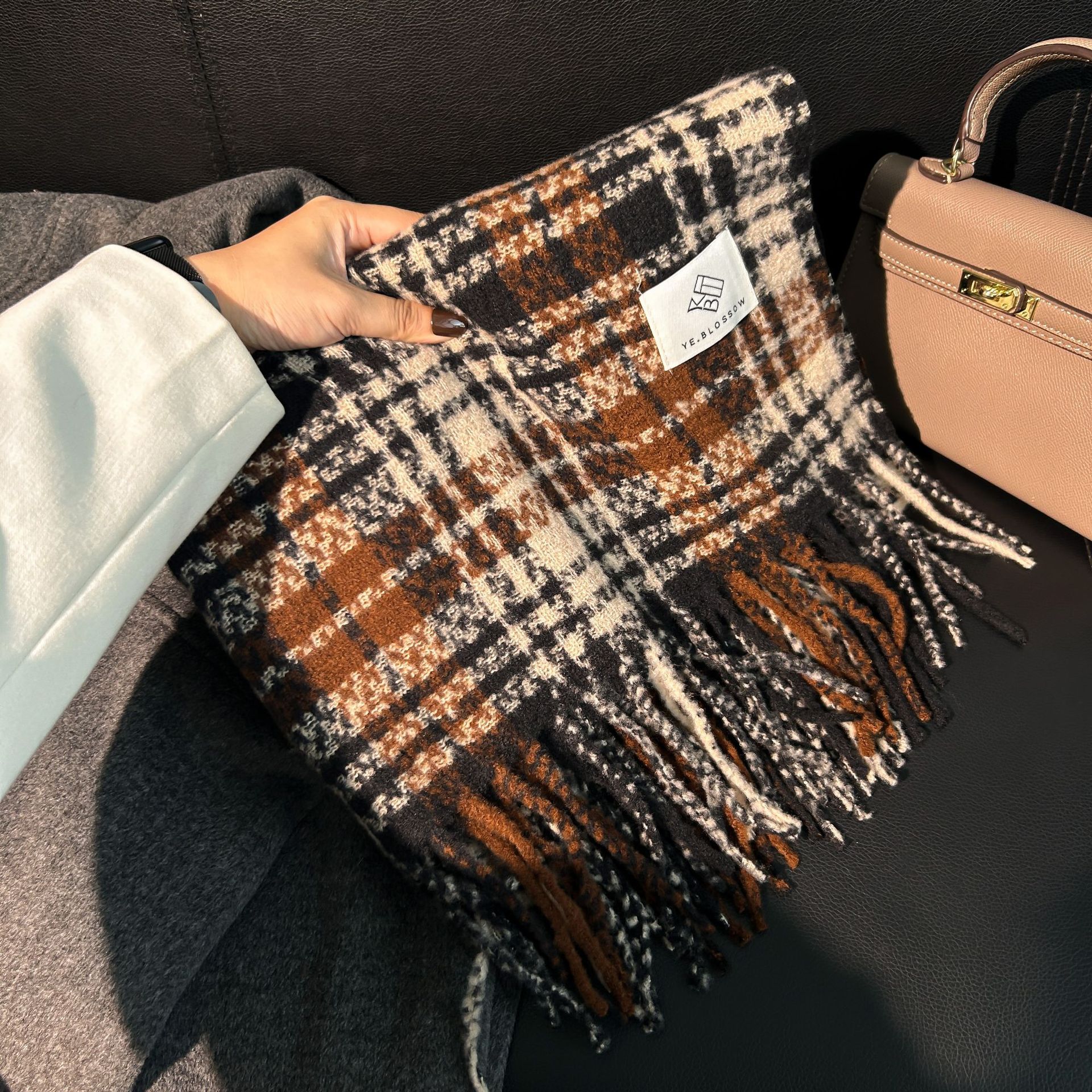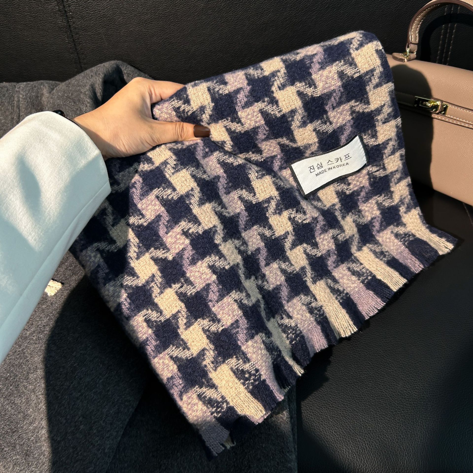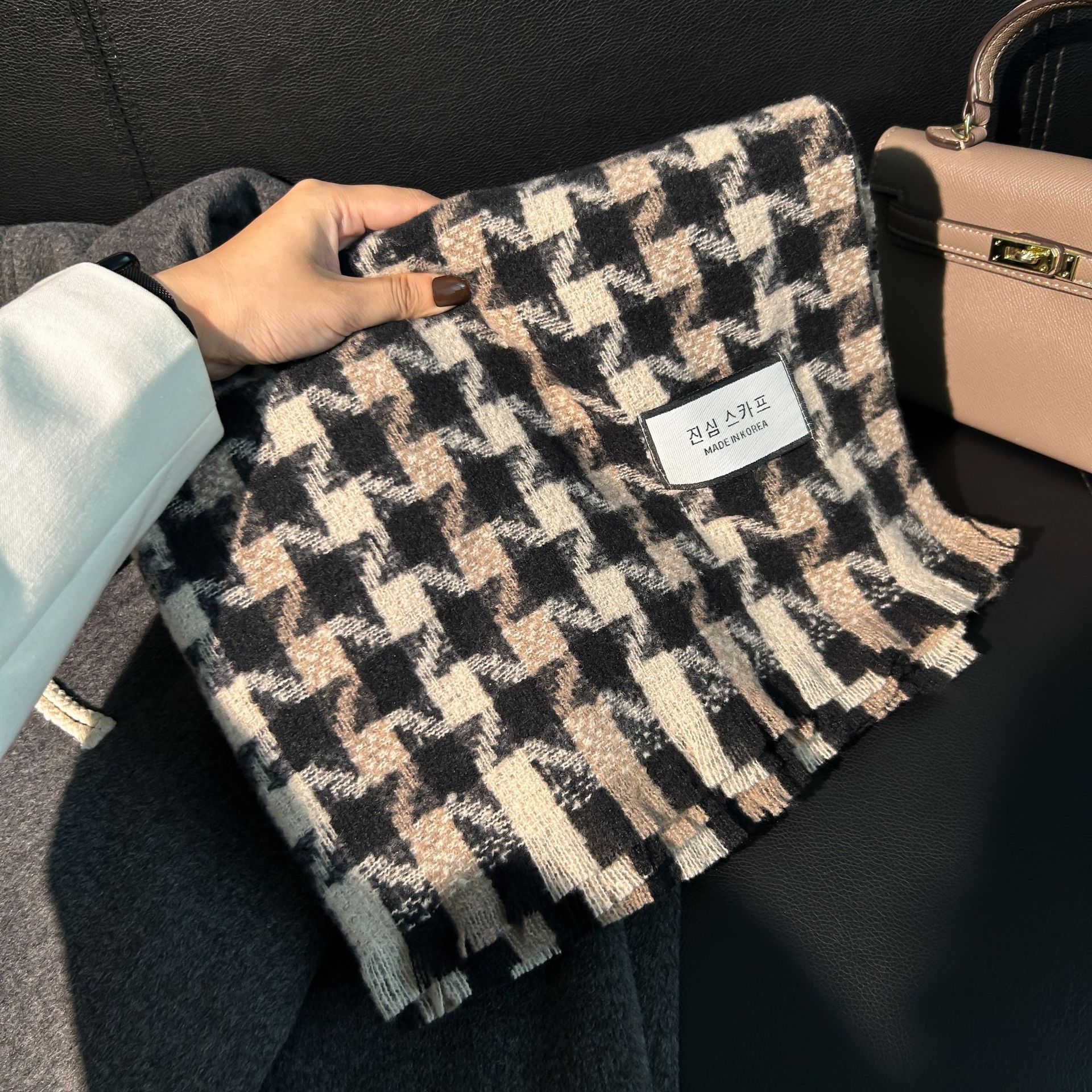 Tonglu 스카프 여성의 겨울 하이 엔드 감각 Mahair 흑백 격자 무늬 스카프 같은 스타일 폭발 따뜻한 두꺼운 스카프스토어 가기