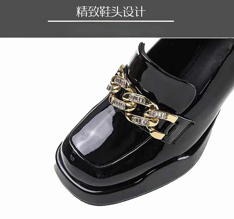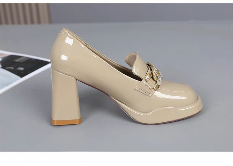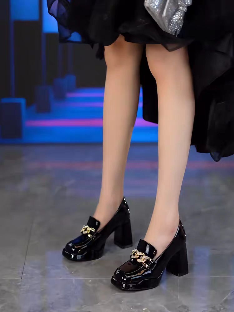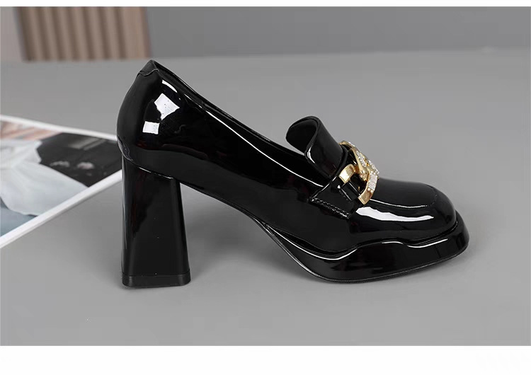 영국 스타일 라운드 토 여성용 가죽 구두, 페이턴트 가죽 두꺼운 굽 깊은 입구 단화, 2024년 봄 가을 유행 메탈 버클 하이힐스토어 가기