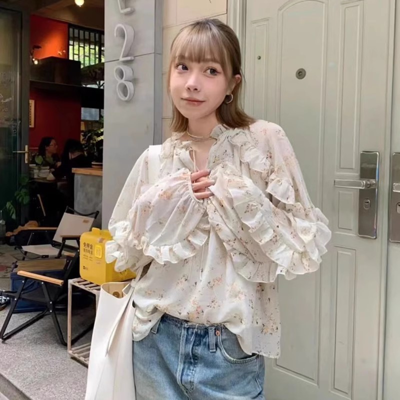 2023 새로운 가을 휴가 스타일 꽃 목가적 인 레이스 셔츠 여성 곰팡이 쉬폰 셔츠-6130 라이트 럭셔리스토어 가기