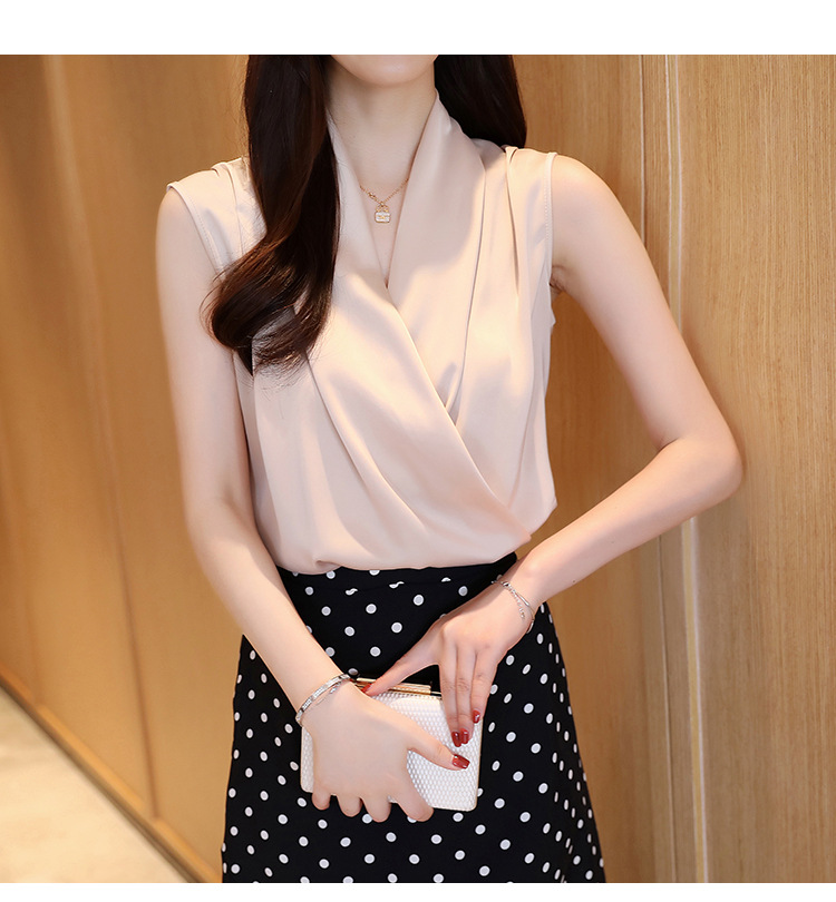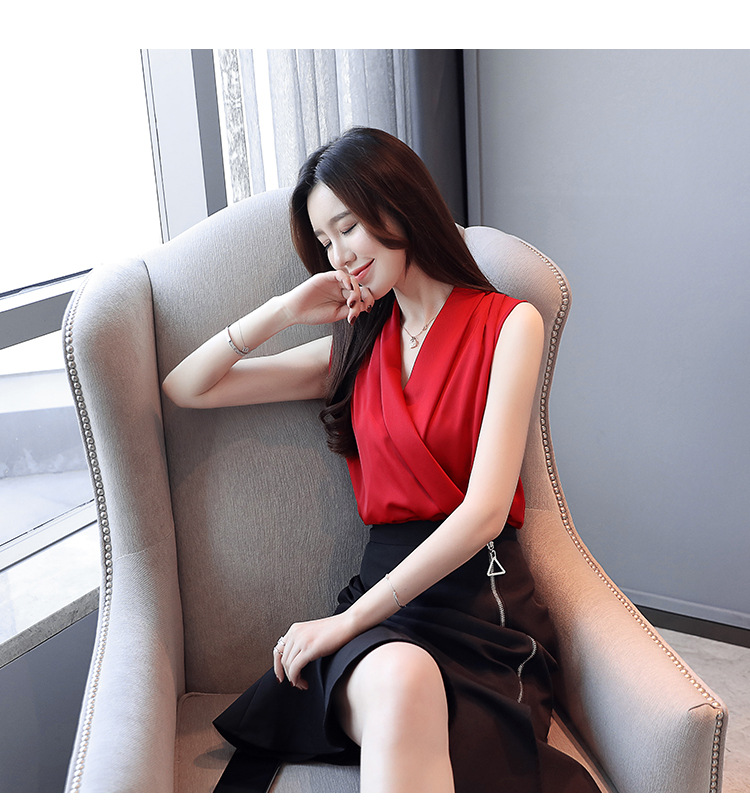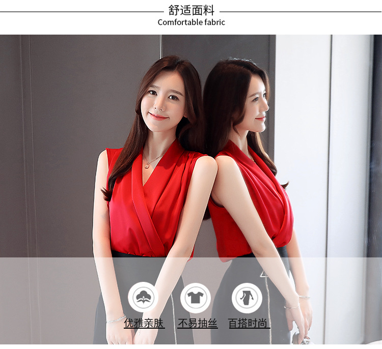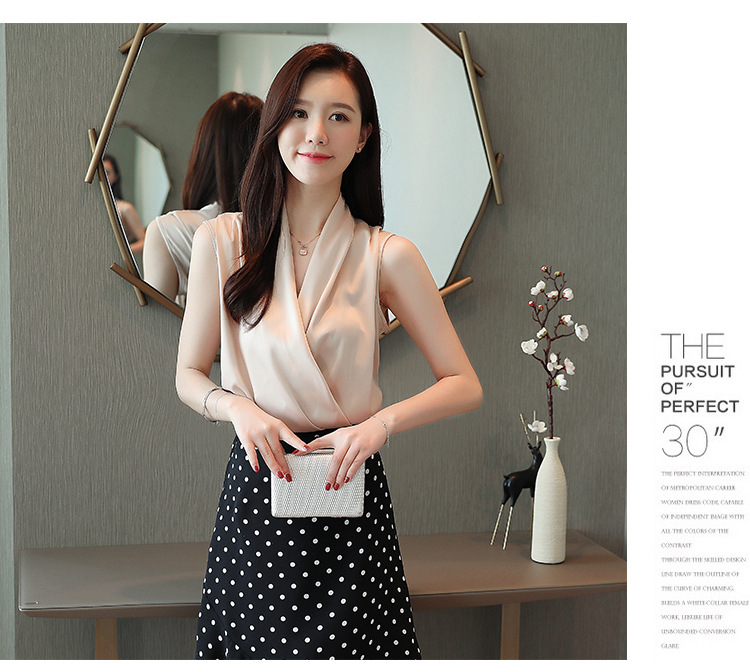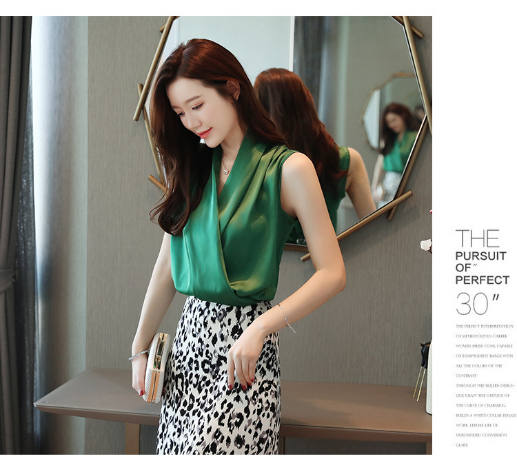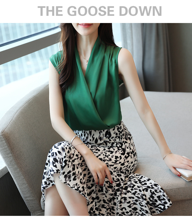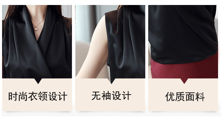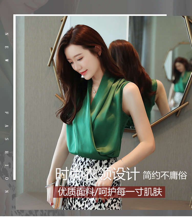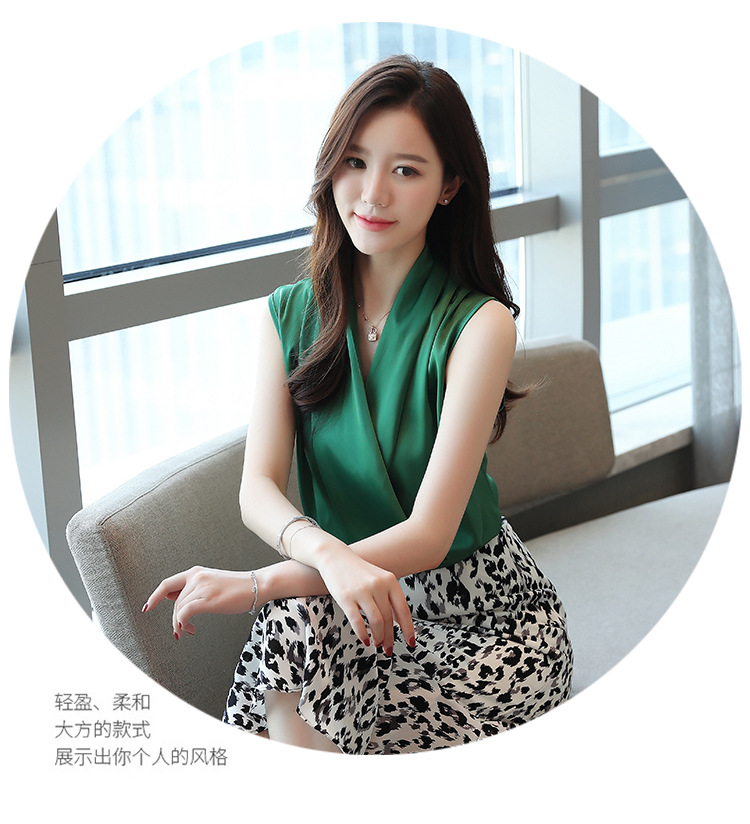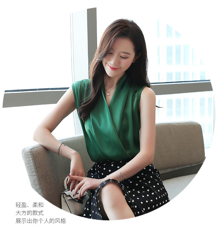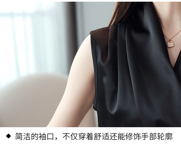 실제 사진 비디오 여름 민소매 쉬폰 셔츠 여성 2025 기질 슬리밍 V 넥 OL 새틴 셔츠 조끼스토어 가기
