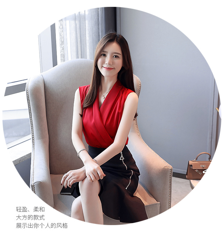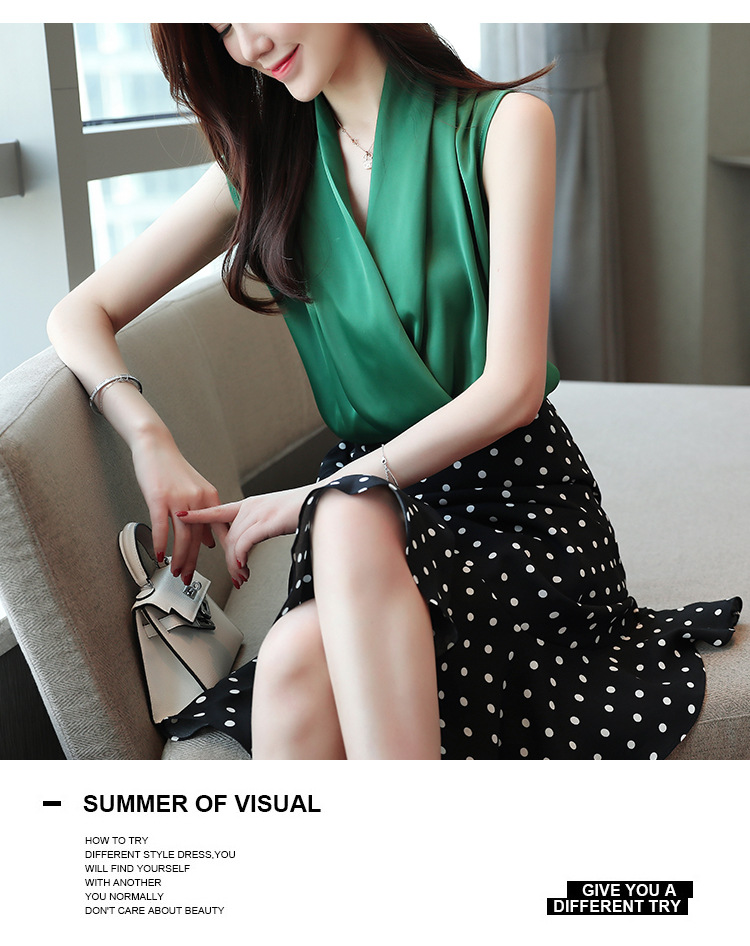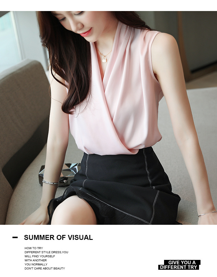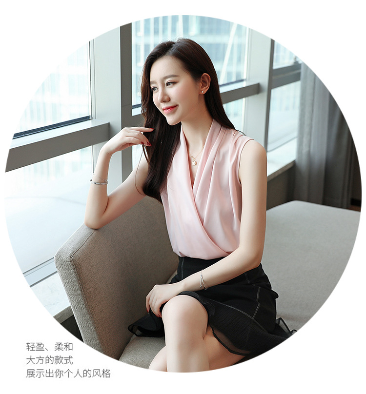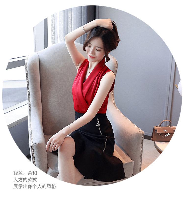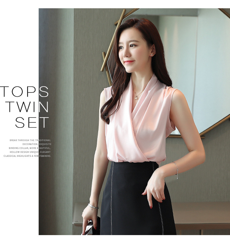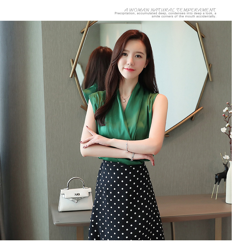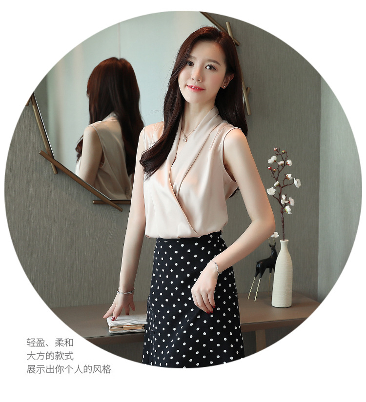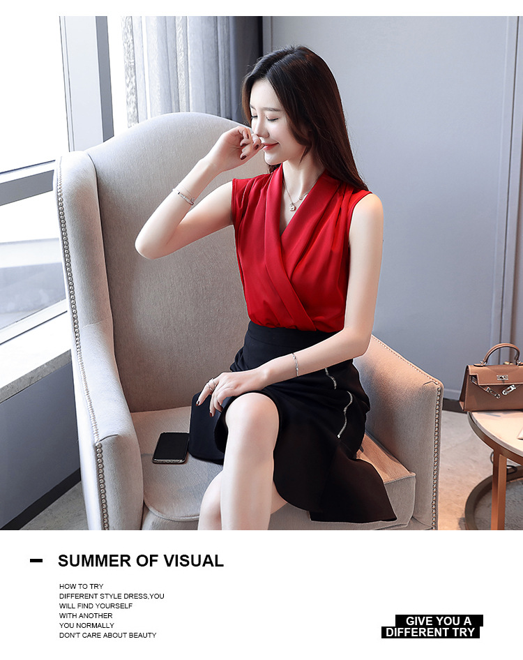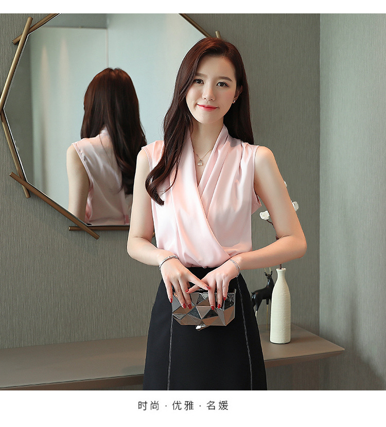 실제 사진 비디오 여름 민소매 쉬폰 셔츠 여성 2025 기질 슬리밍 V 넥 OL 새틴 셔츠 조끼스토어 가기