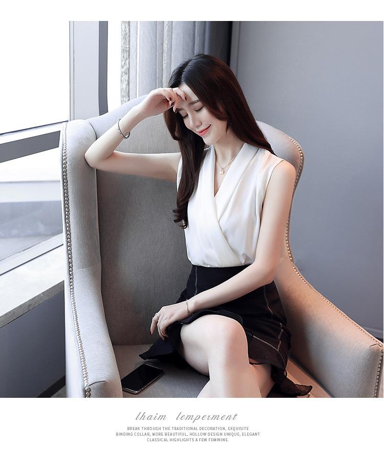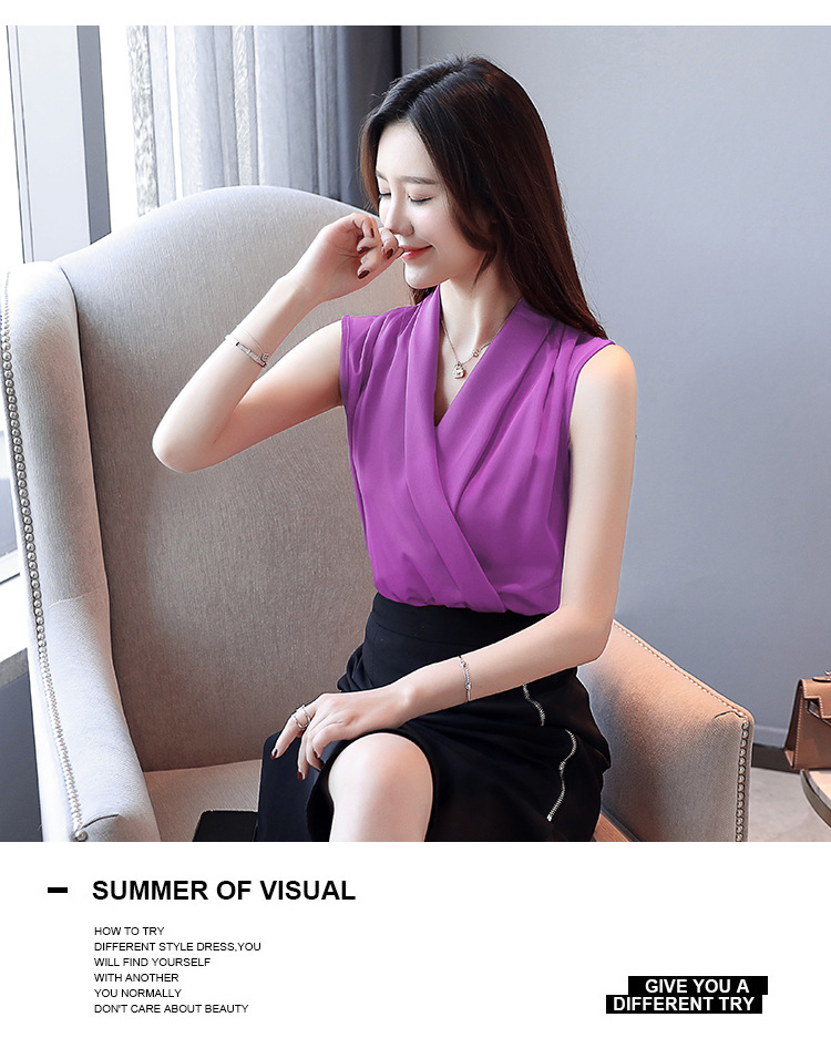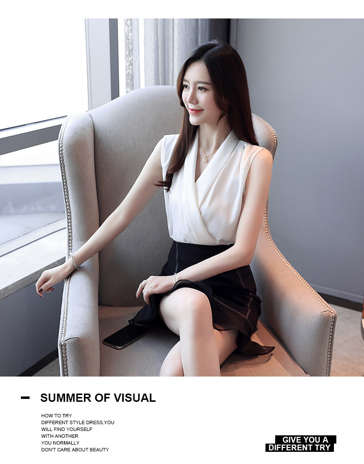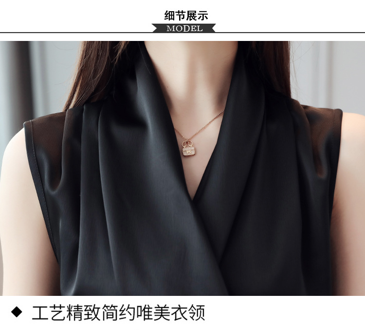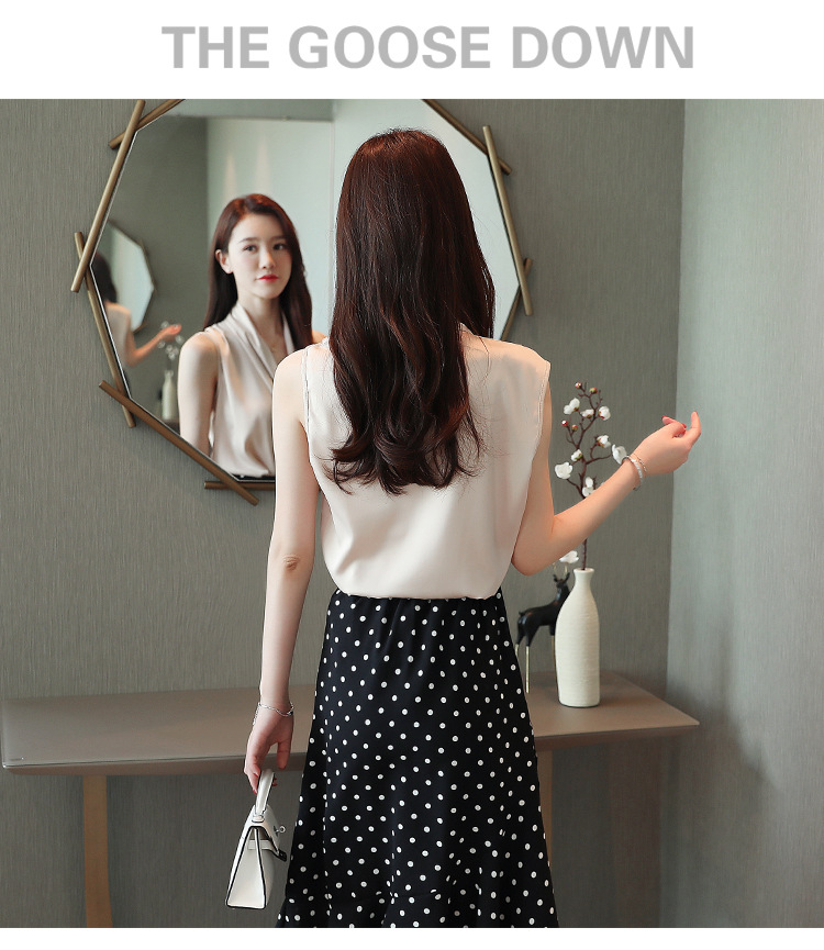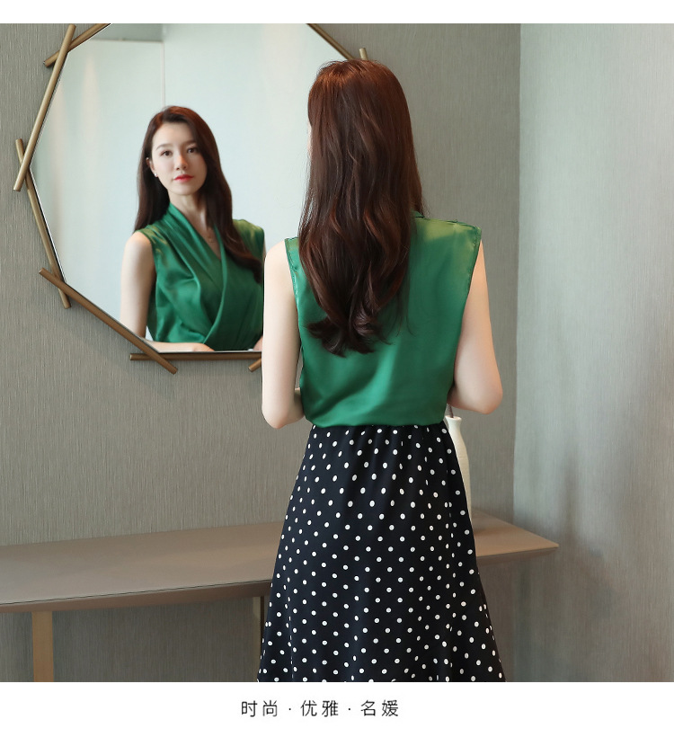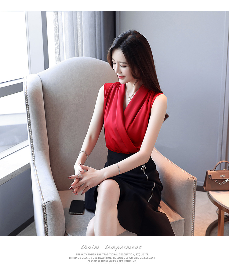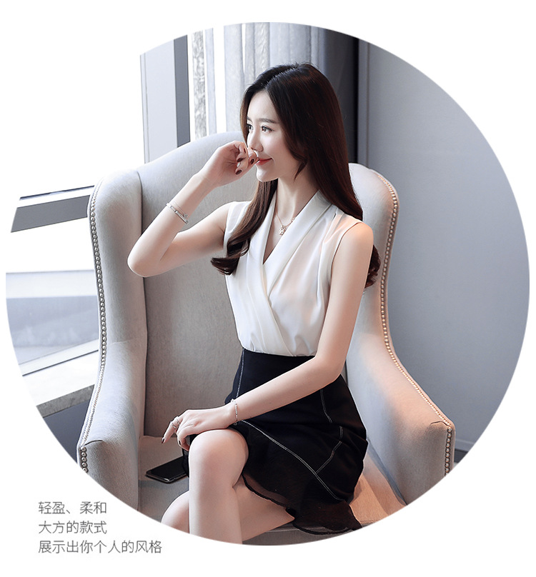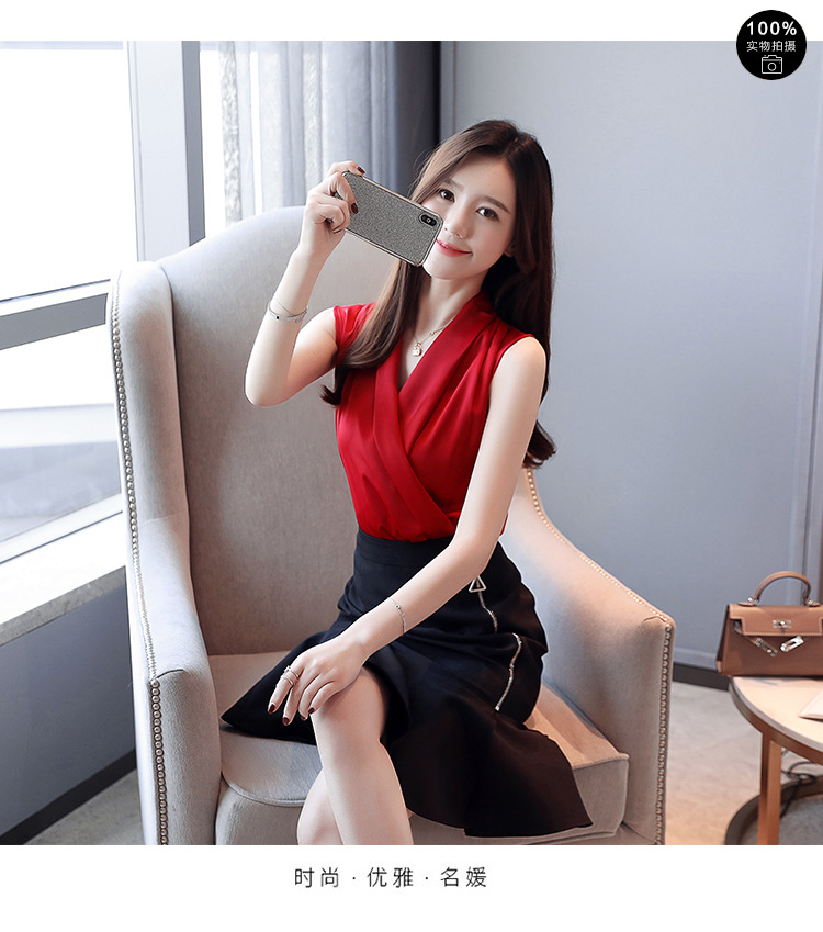 실제 사진 비디오 여름 민소매 쉬폰 셔츠 여성 2025 기질 슬리밍 V 넥 OL 새틴 셔츠 조끼스토어 가기