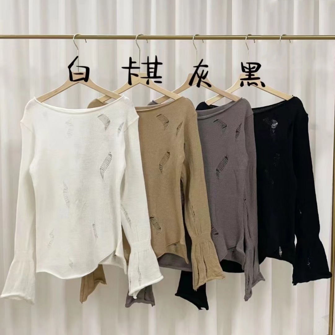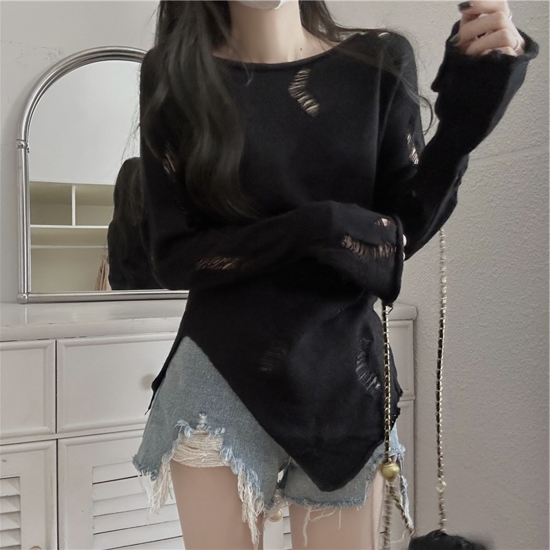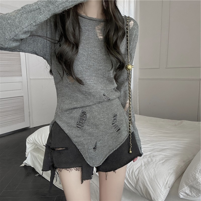 불규칙한 중공 니트웨어 여성용 가을 얇은 명주 그물 선 스크린 블라우스 중간 길이 느슨한 스플릿 시크 셔츠 탑