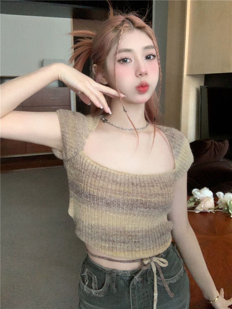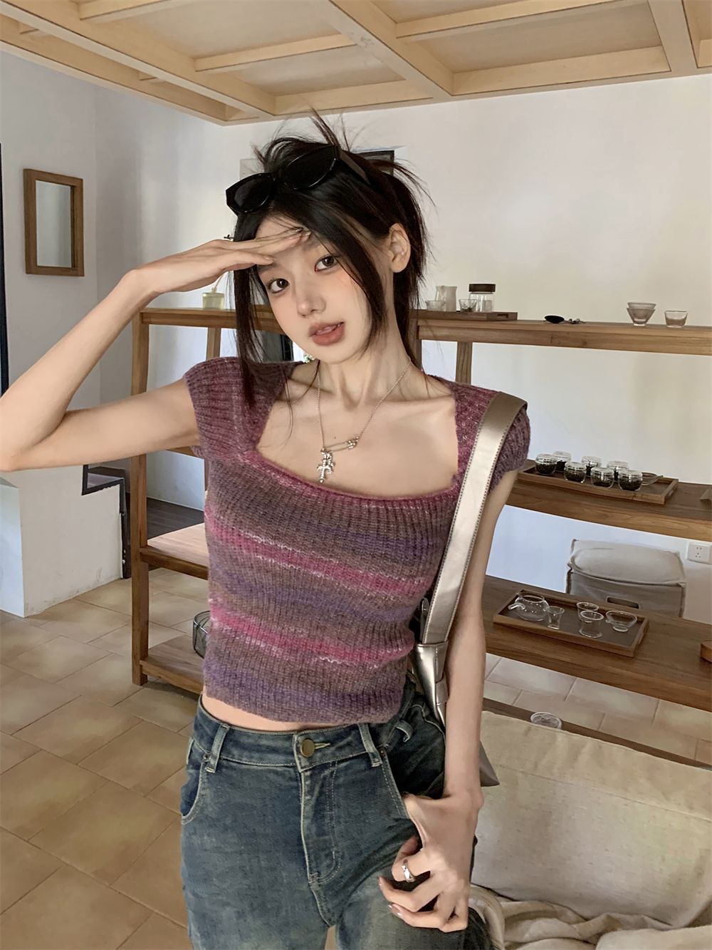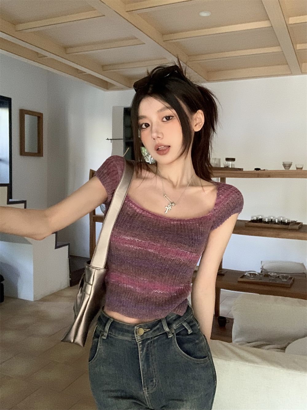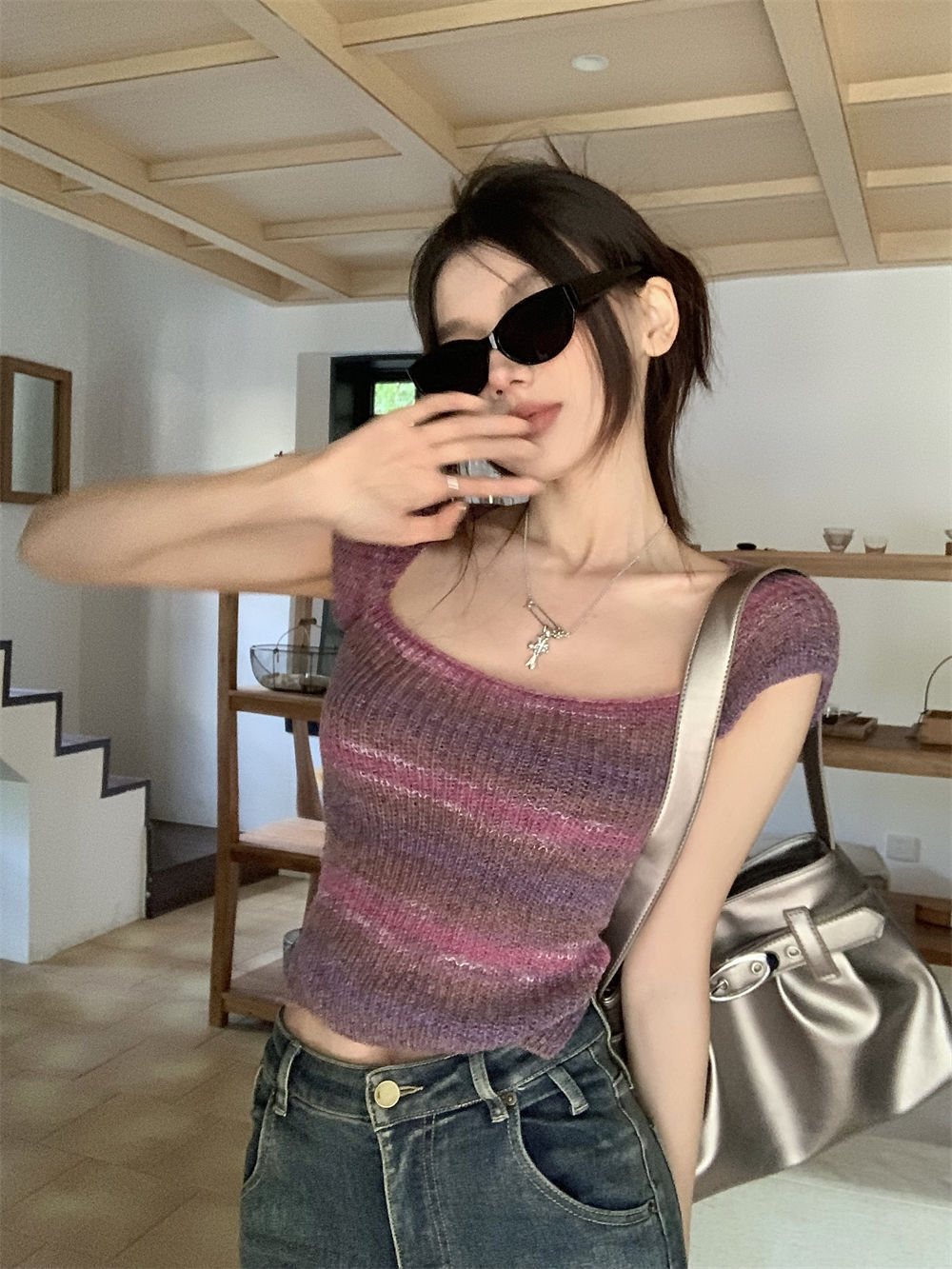 퍼플 프렌치 티셔츠 여성용 여름 새로운 스트라이프 풀오버 니트 바닥 짧은 스트랩 반팔 탑