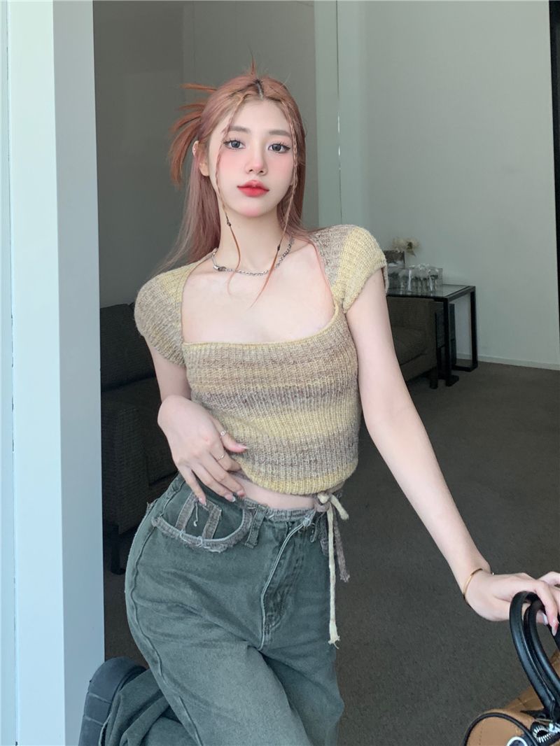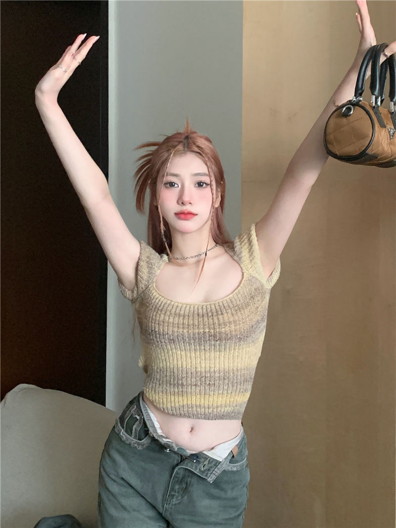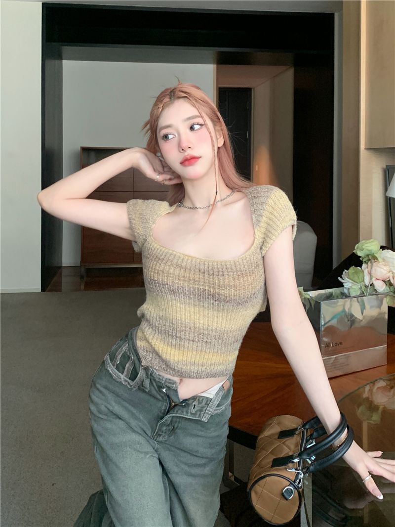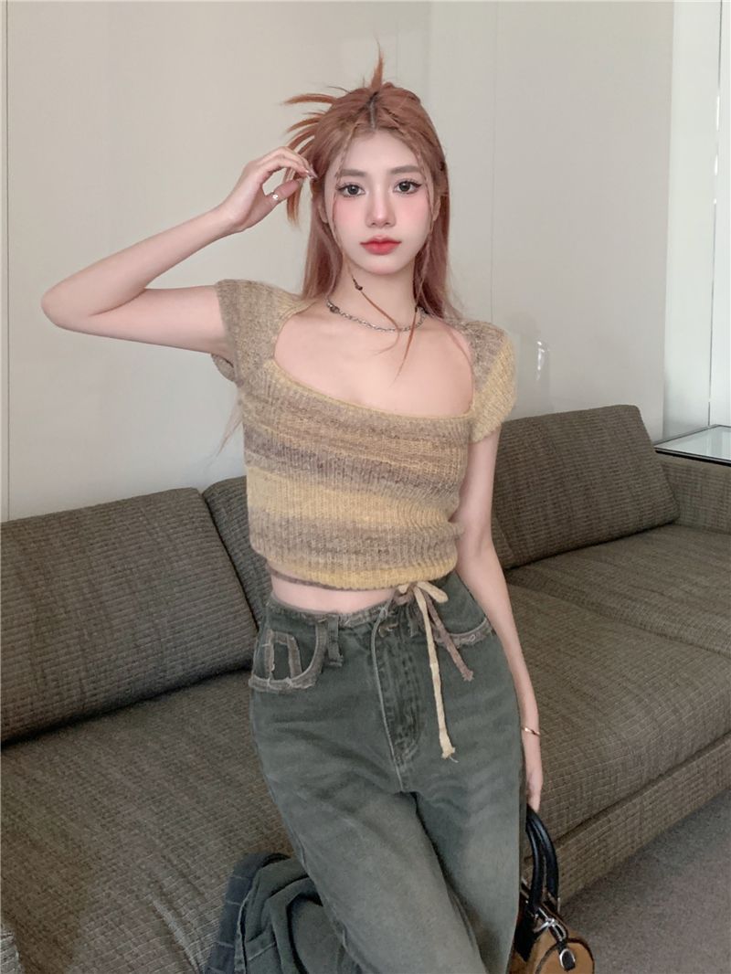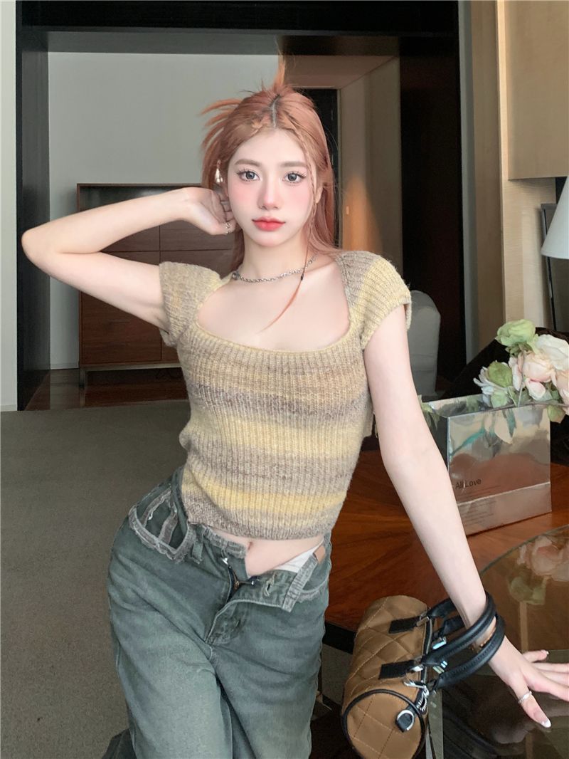 퍼플 프렌치 티셔츠 여성용 여름 새로운 스트라이프 풀오버 니트 바닥 짧은 스트랩 반팔 탑