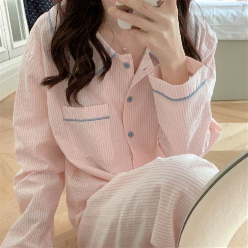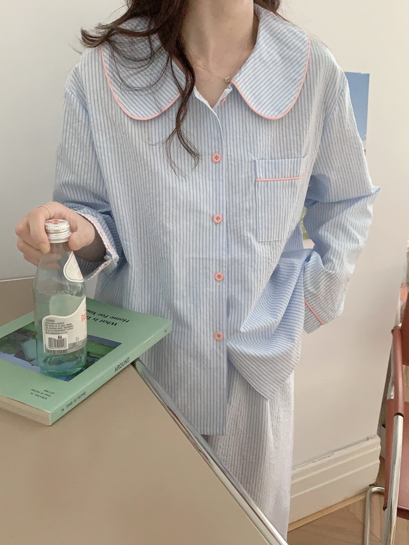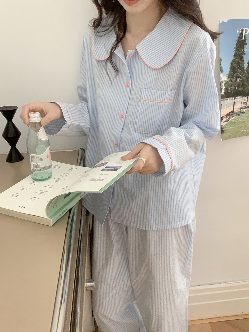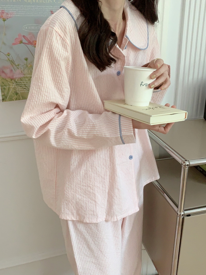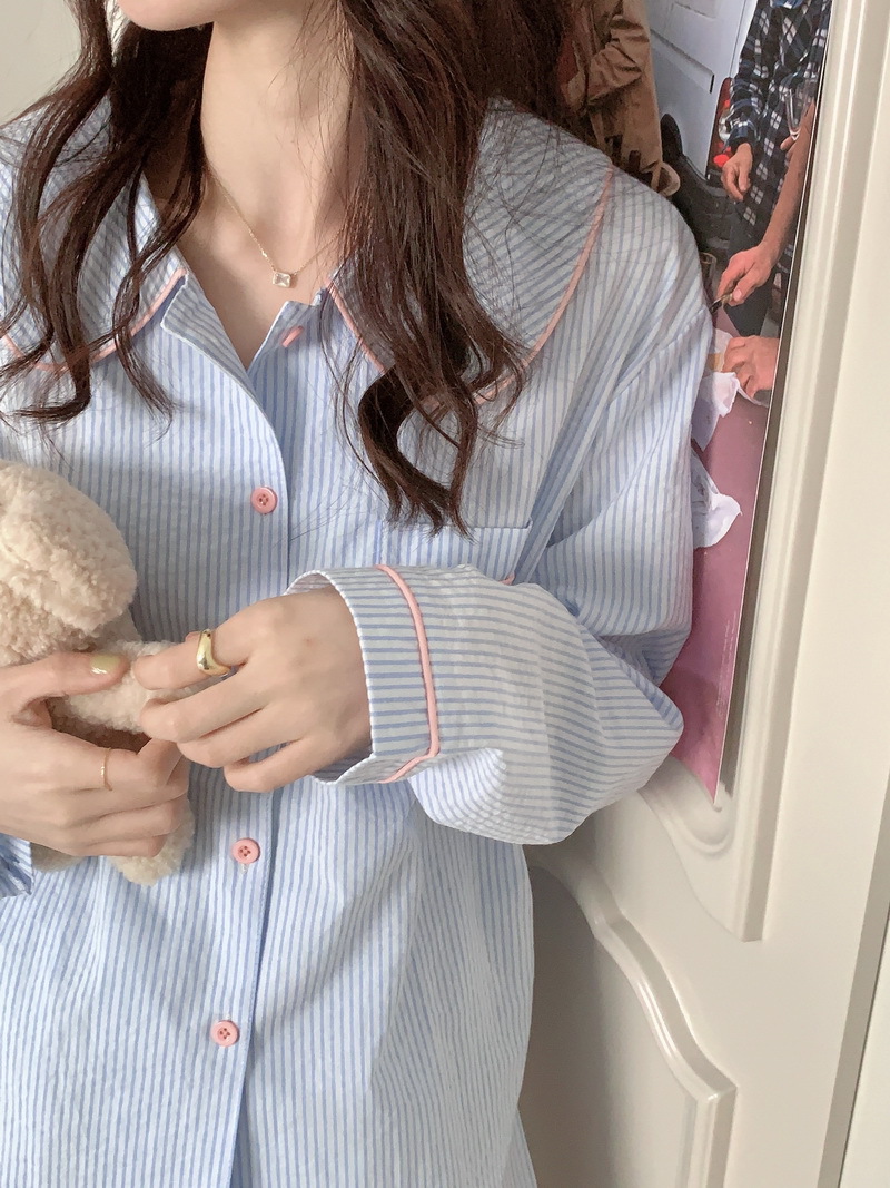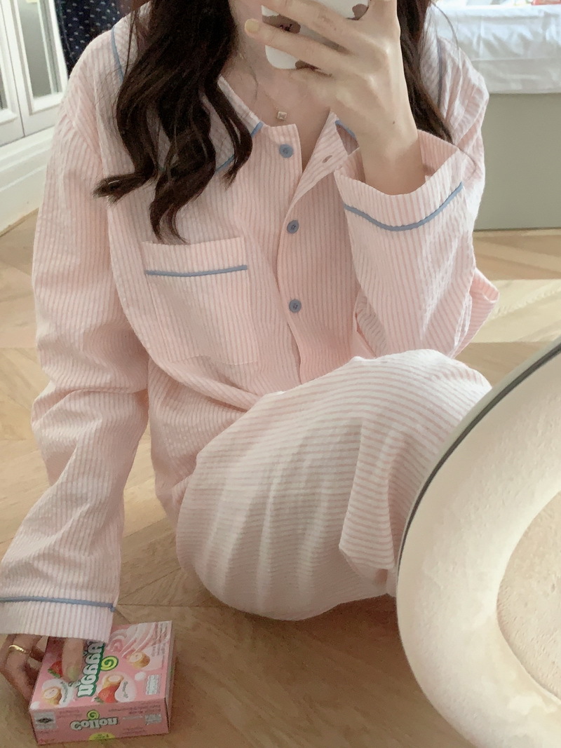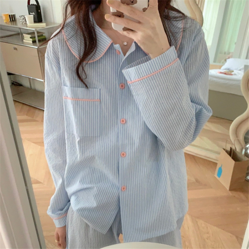 2026년 봄 신상 한국 스타일 긴팔 잠옷, 귀여운 배색 스트라이프 캐주얼 루즈핏 심플 홈웨어 세트스토어 가기