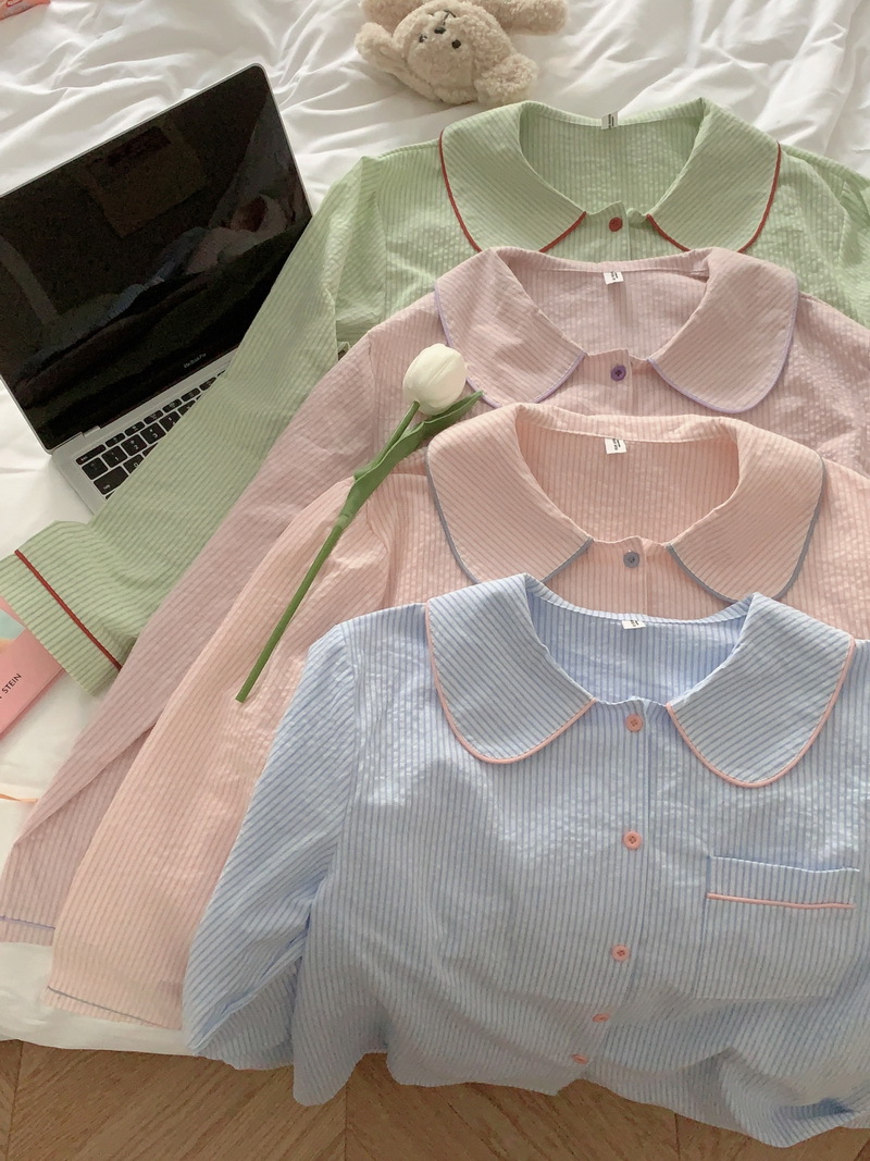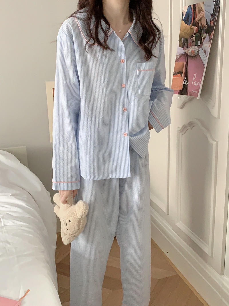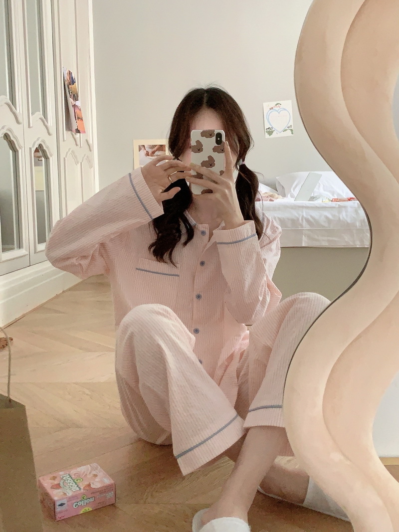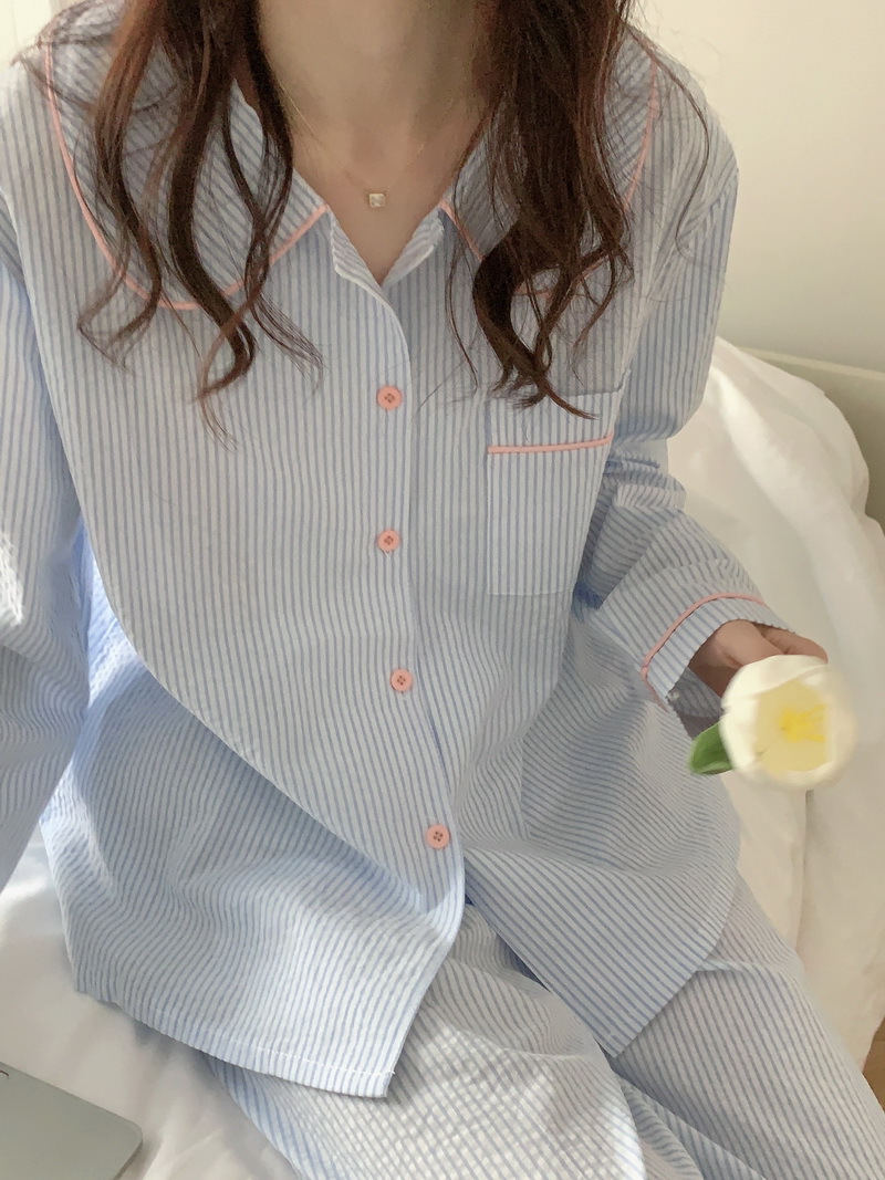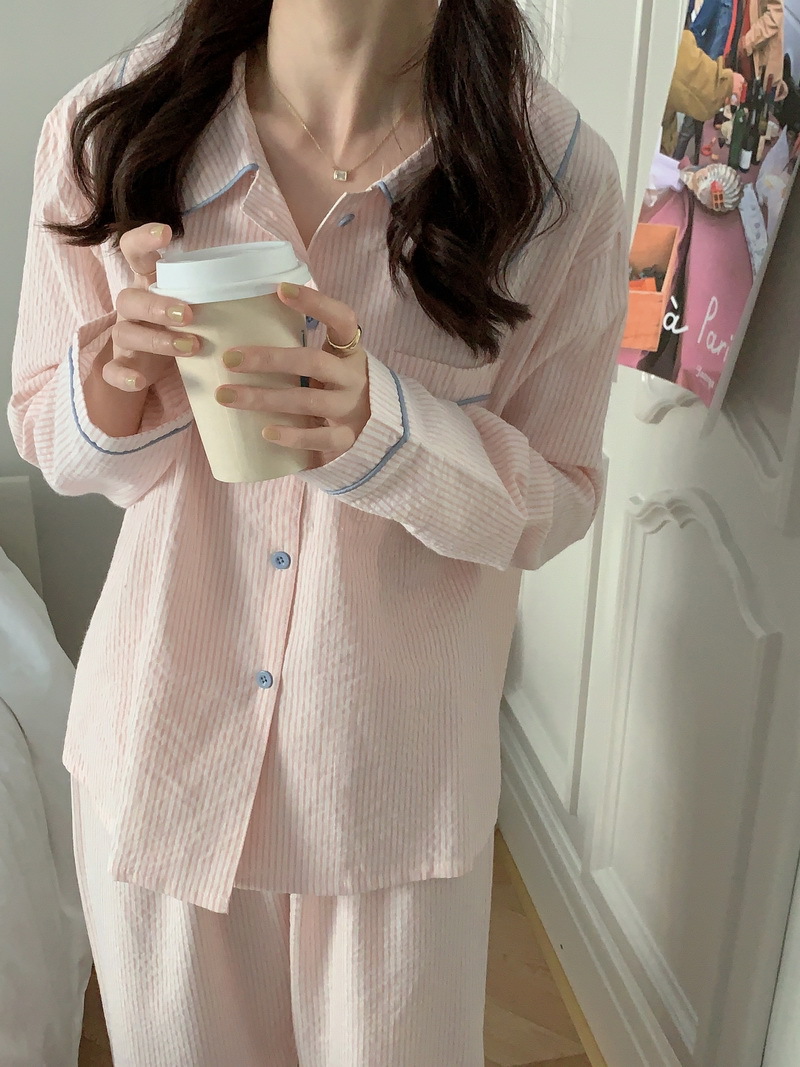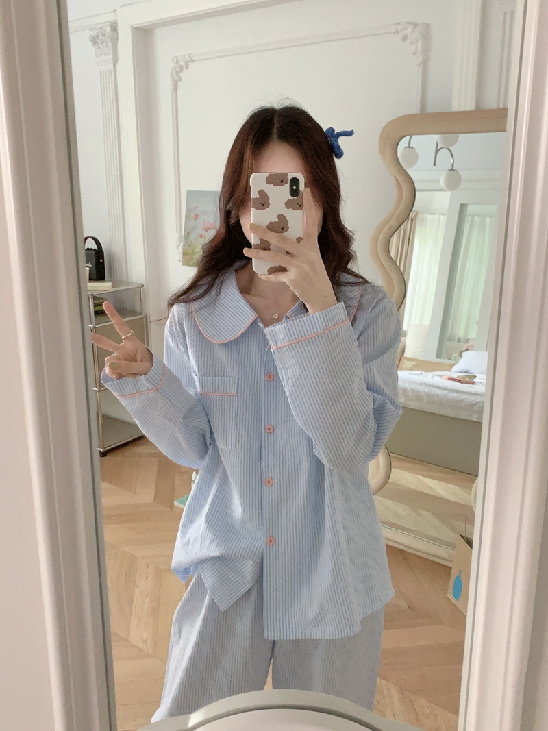 2026년 봄 신상 한국 스타일 긴팔 잠옷, 귀여운 배색 스트라이프 캐주얼 루즈핏 심플 홈웨어 세트스토어 가기