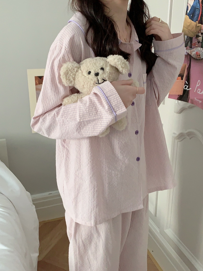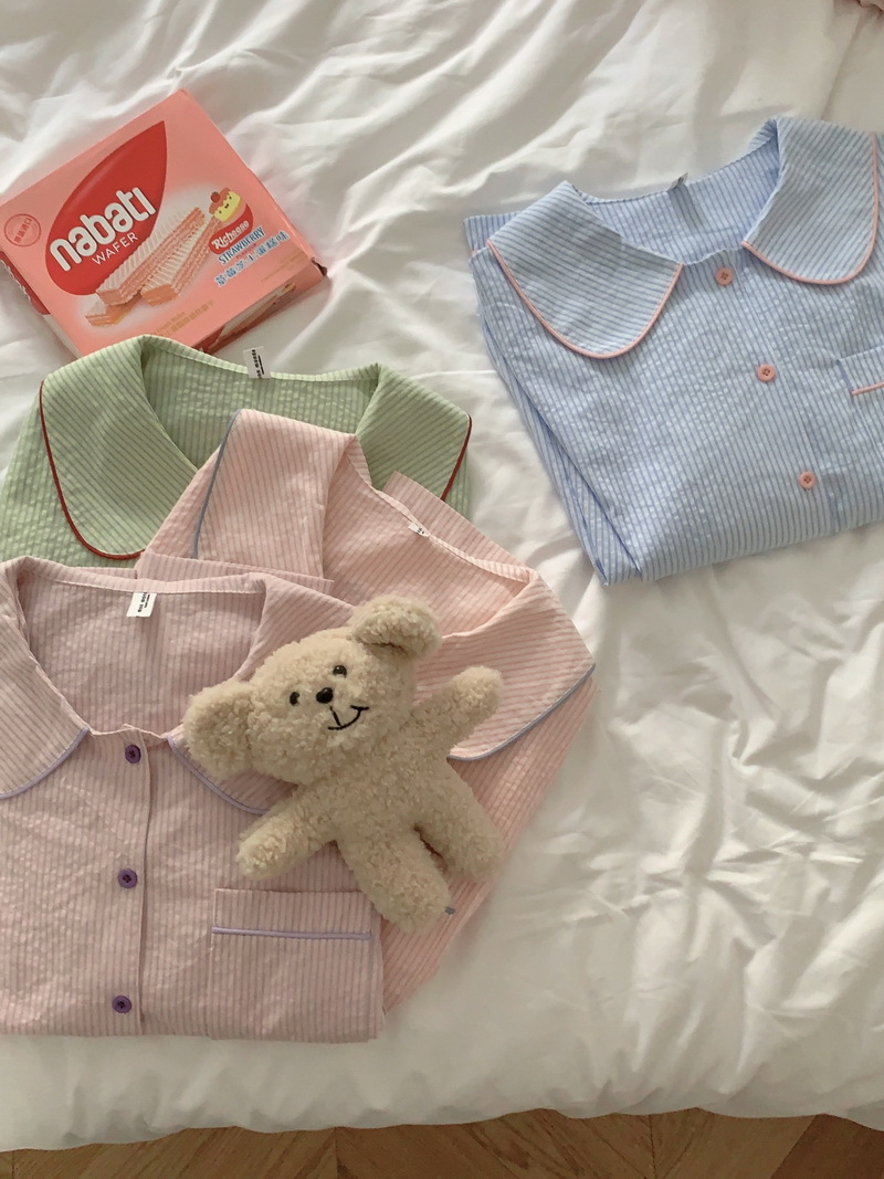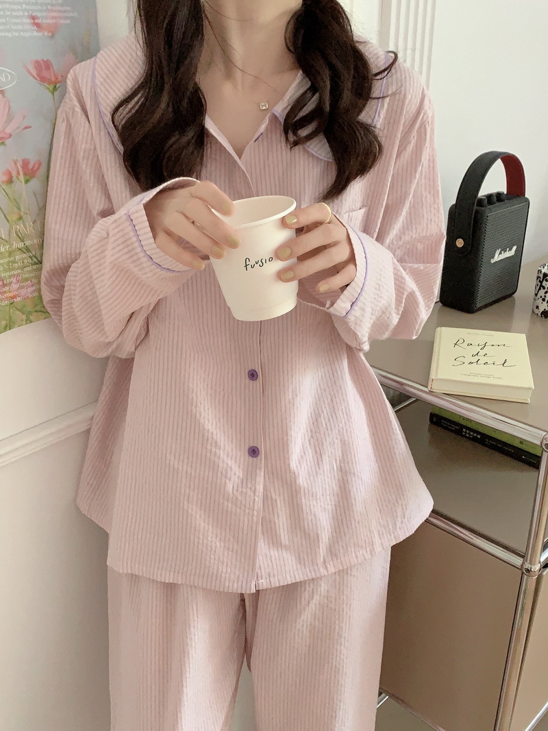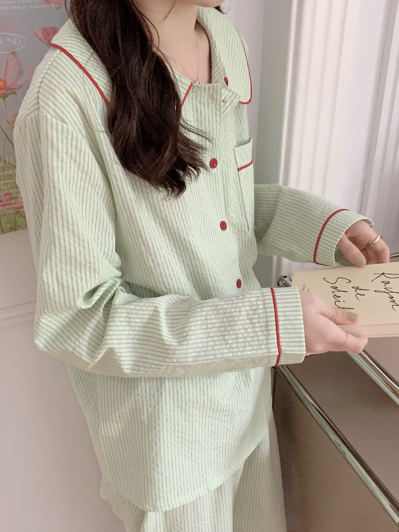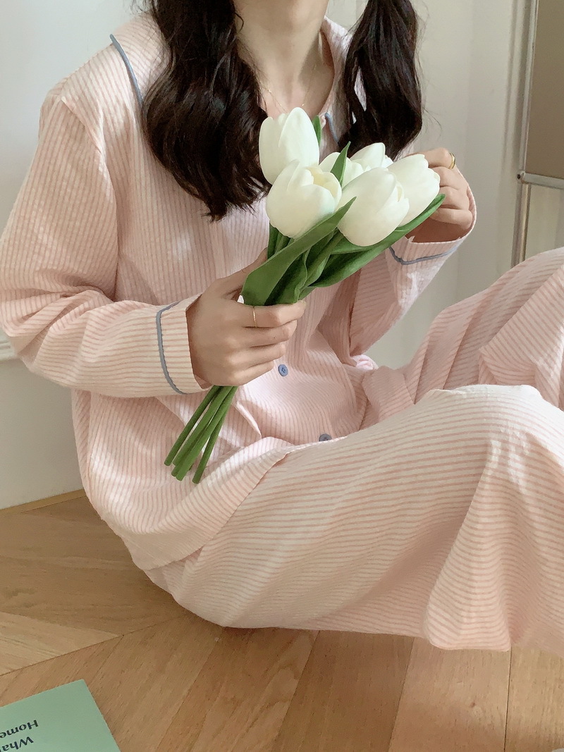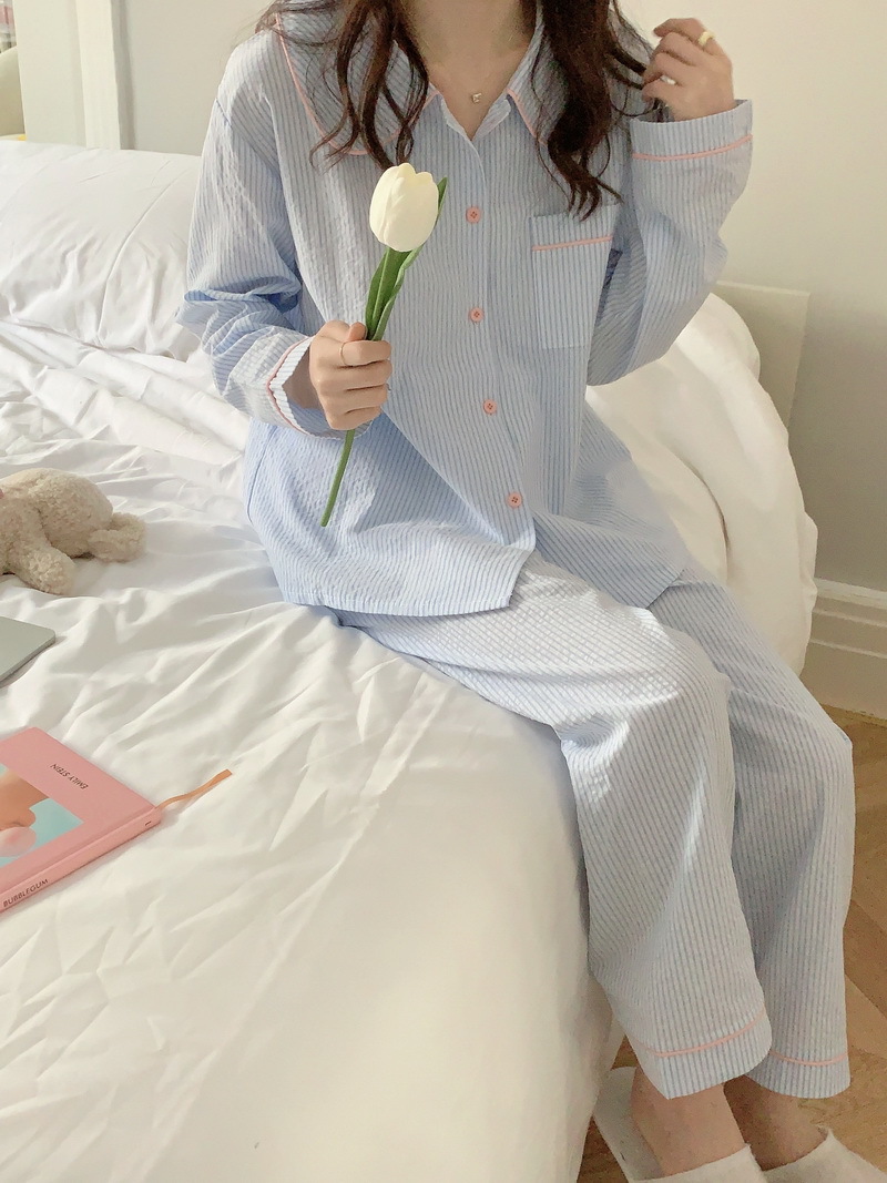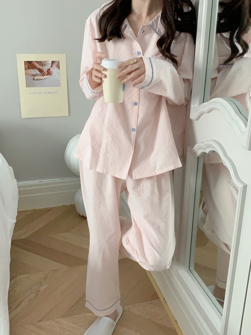 2026년 봄 신상 한국 스타일 긴팔 잠옷, 귀여운 배색 스트라이프 캐주얼 루즈핏 심플 홈웨어 세트스토어 가기