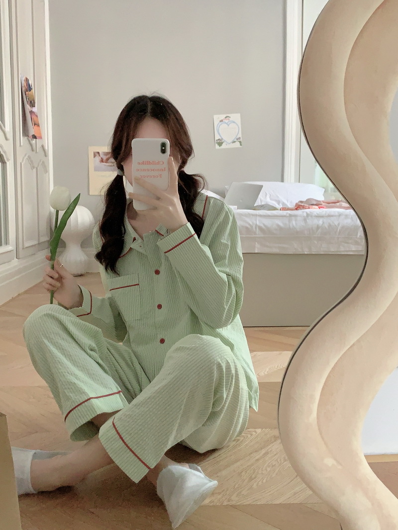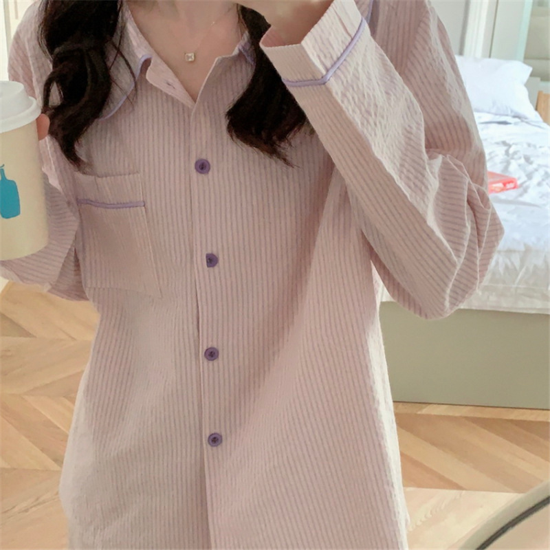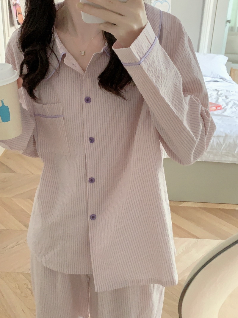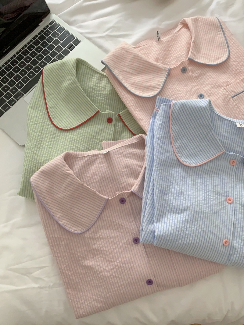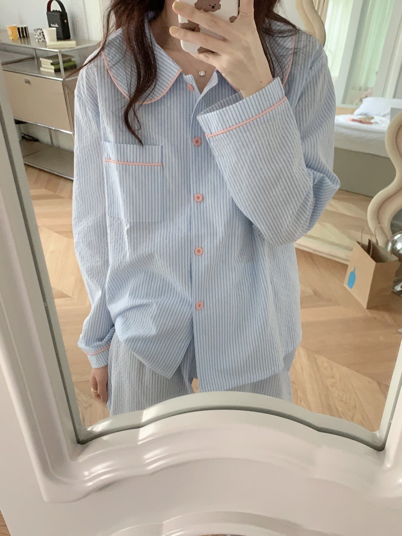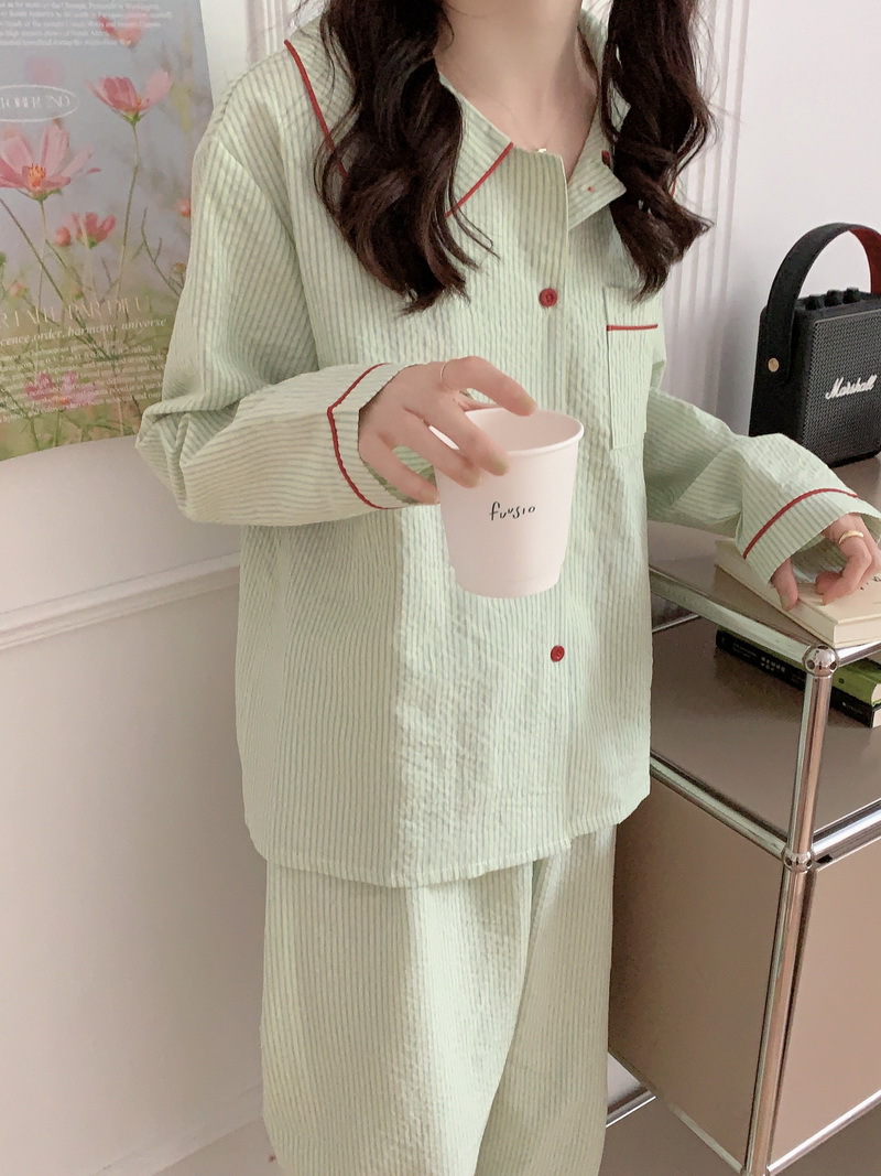 2026년 봄 신상 한국 스타일 긴팔 잠옷, 귀여운 배색 스트라이프 캐주얼 루즈핏 심플 홈웨어 세트스토어 가기