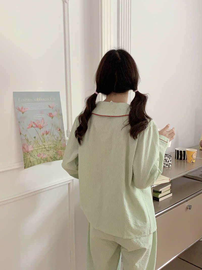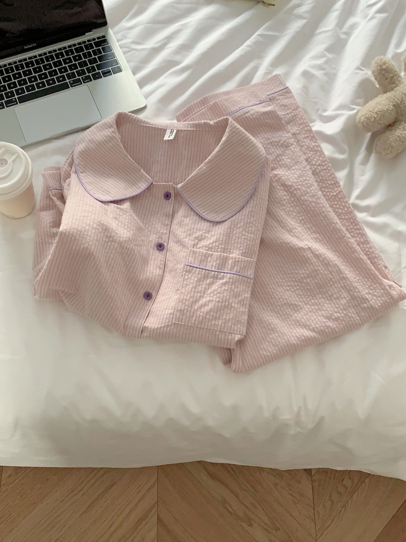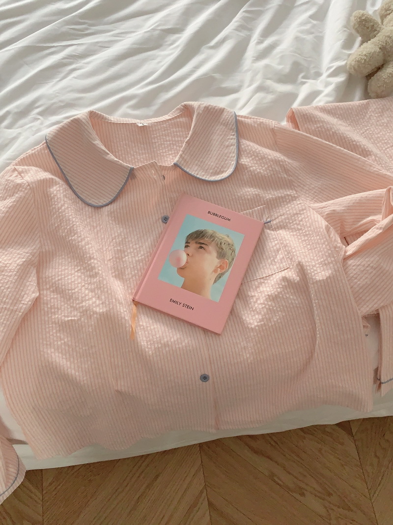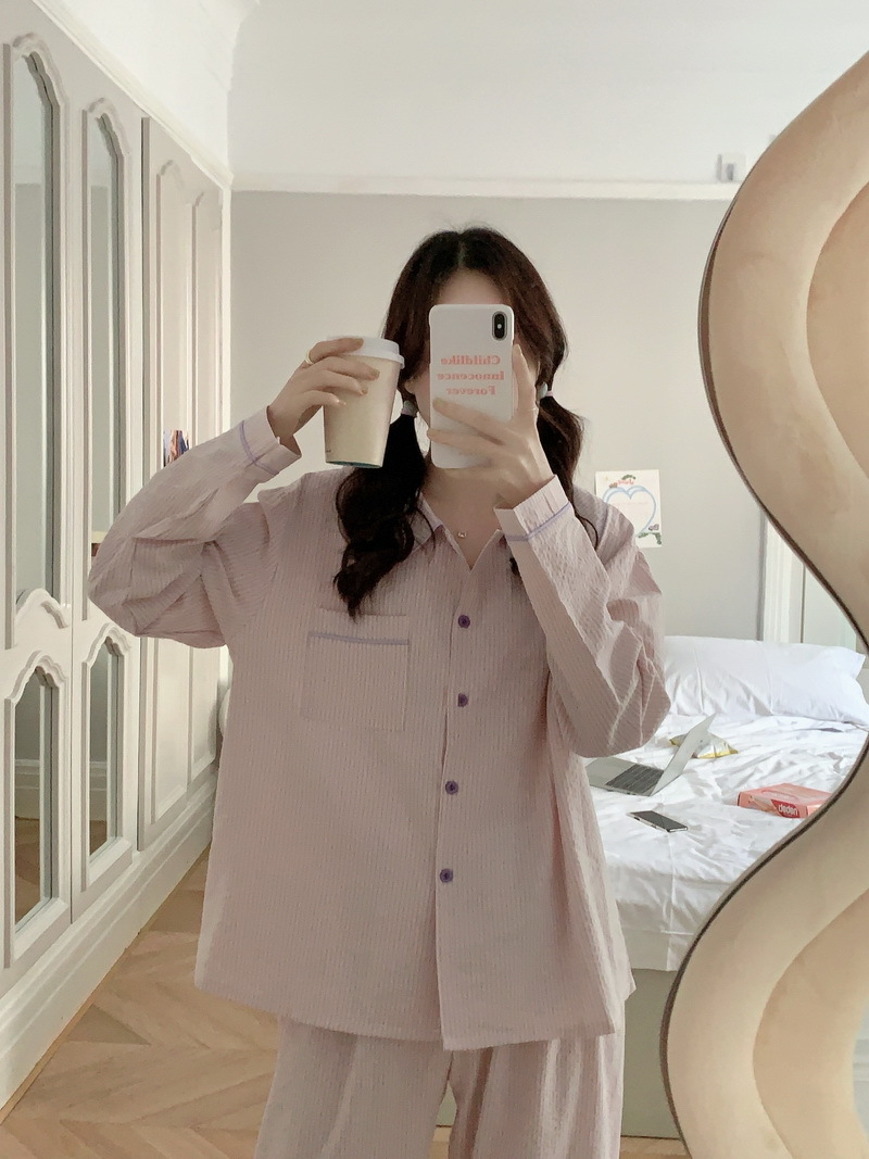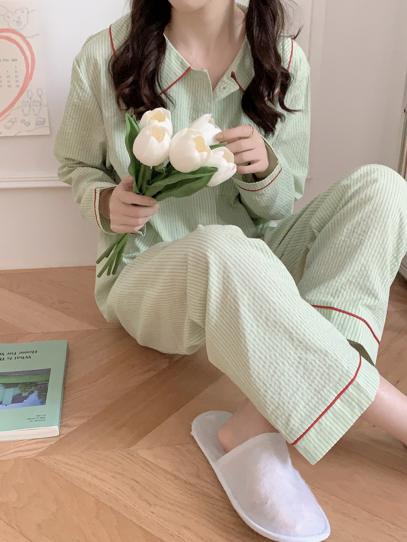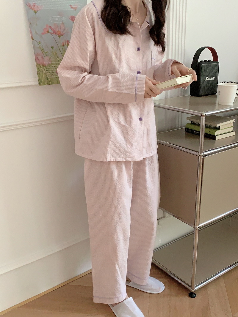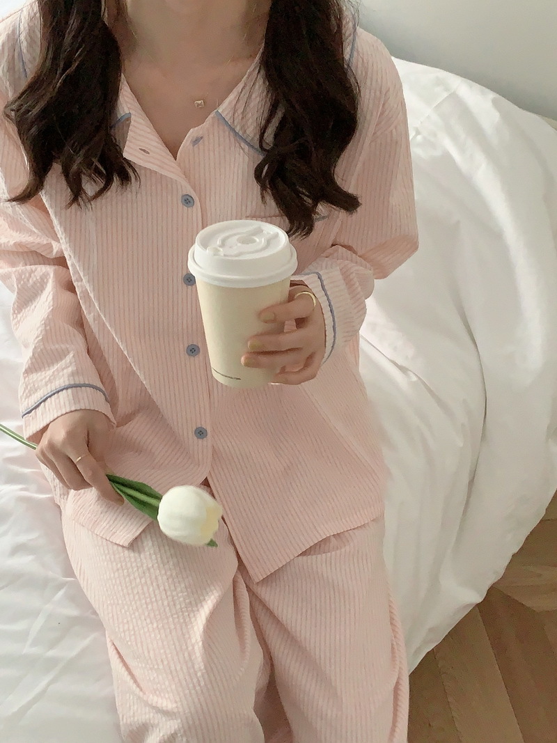 2026년 봄 신상 한국 스타일 긴팔 잠옷, 귀여운 배색 스트라이프 캐주얼 루즈핏 심플 홈웨어 세트스토어 가기