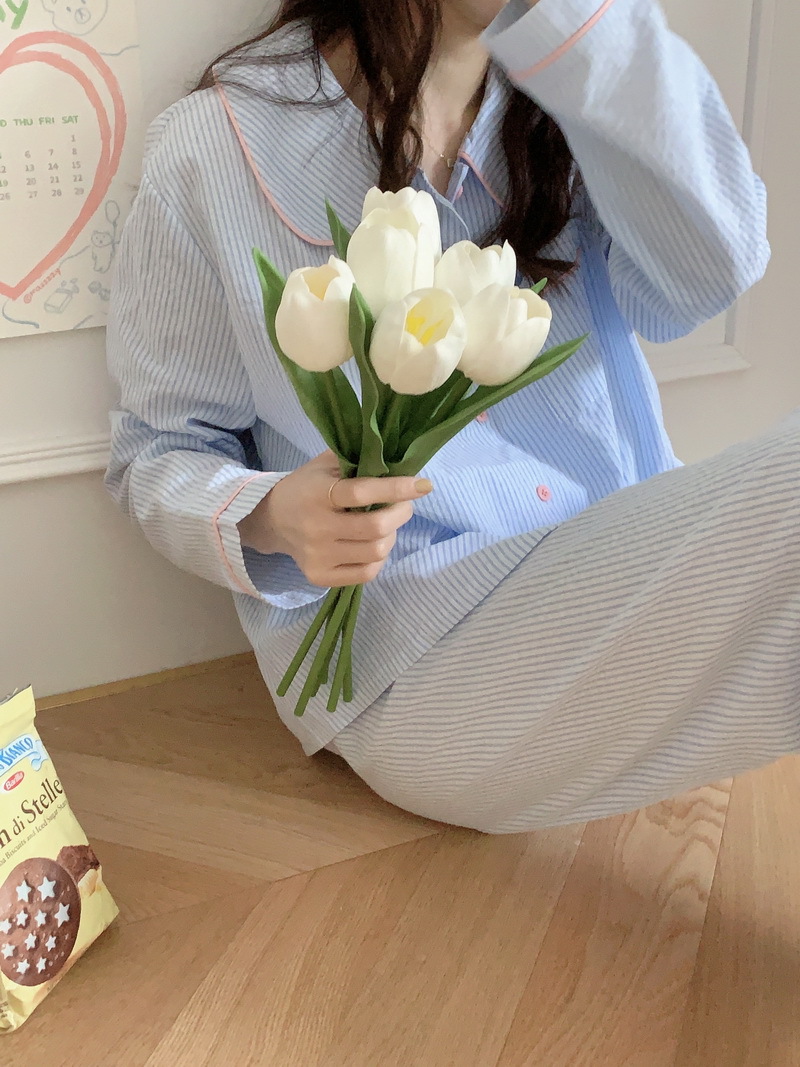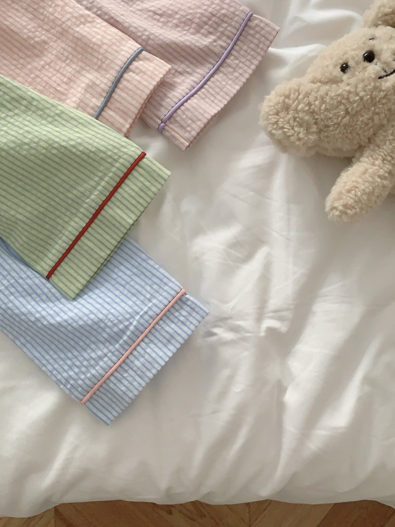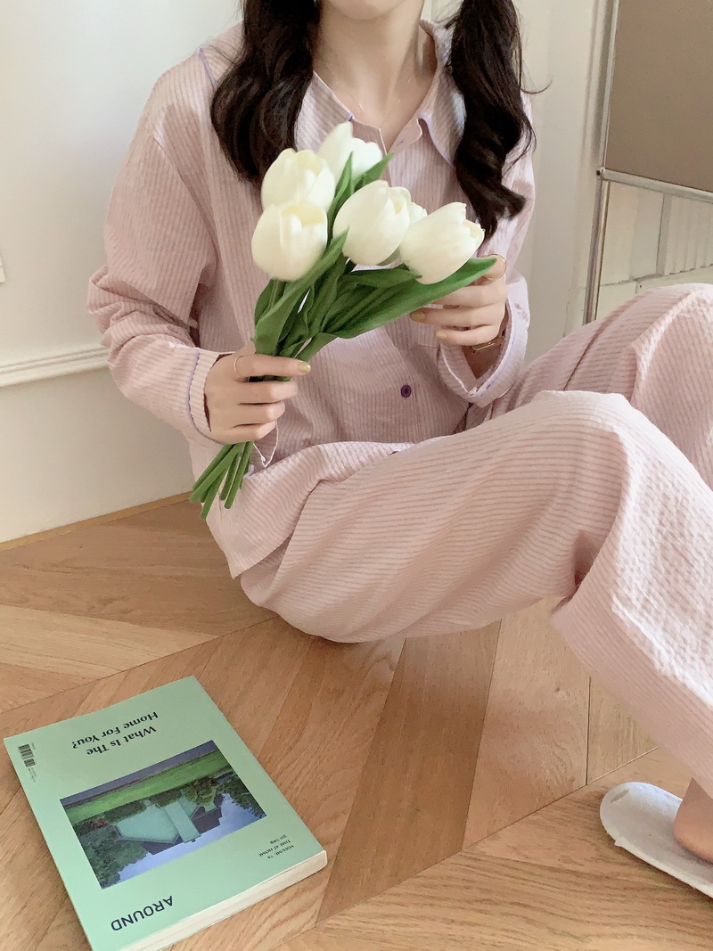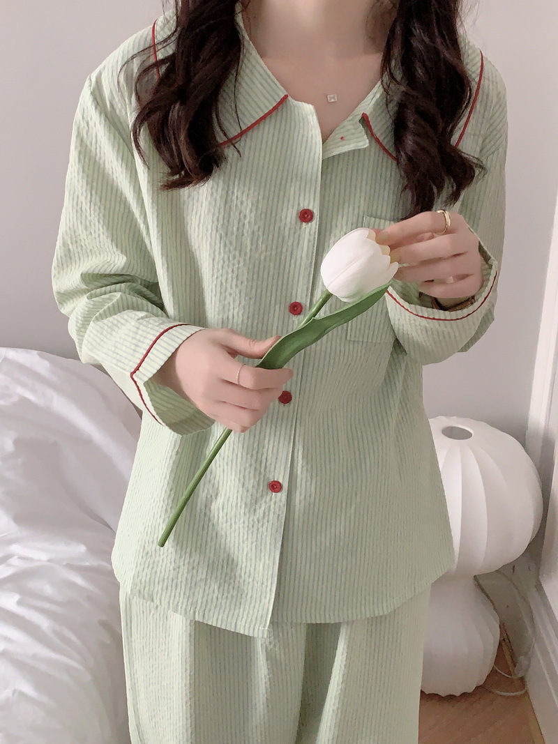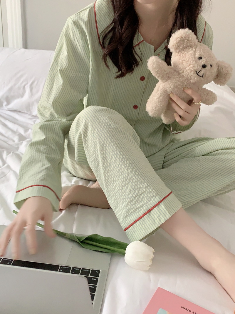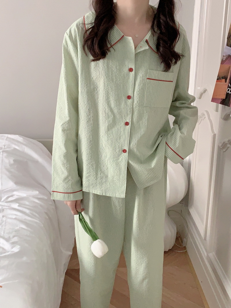 2026년 봄 신상 한국 스타일 긴팔 잠옷, 귀여운 배색 스트라이프 캐주얼 루즈핏 심플 홈웨어 세트스토어 가기