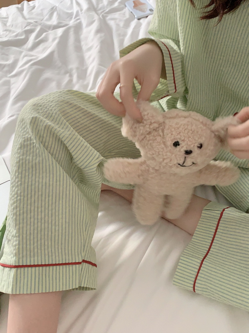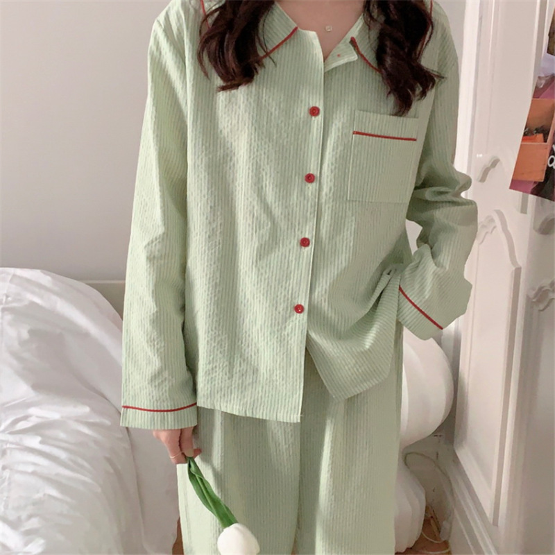 2026년 봄 신상 한국 스타일 긴팔 잠옷, 귀여운 배색 스트라이프 캐주얼 루즈핏 심플 홈웨어 세트