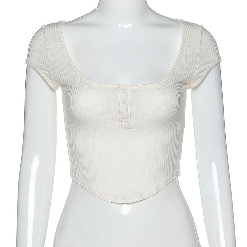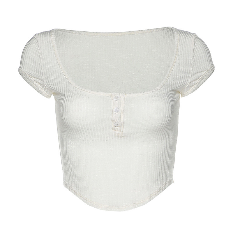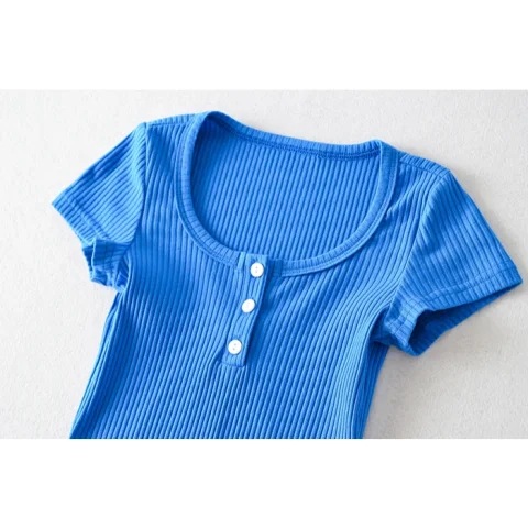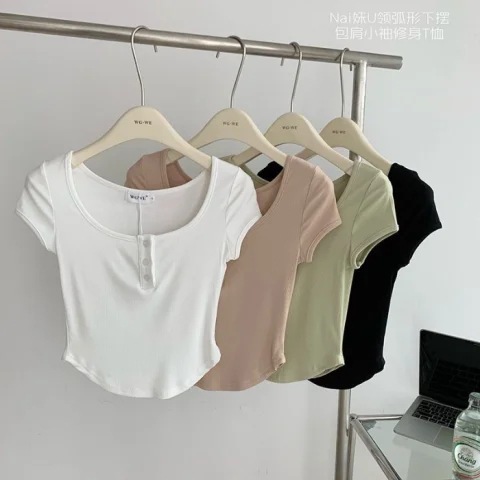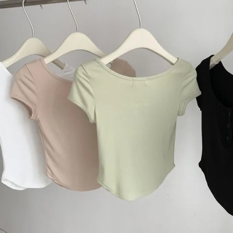 2023 유럽과 미국 스파이스 걸 스타일 단색 배꼽 반팔 티셔츠 여성용 슈퍼 피규어 모든 매치 짧은 탑 봄과 여름스토어 가기