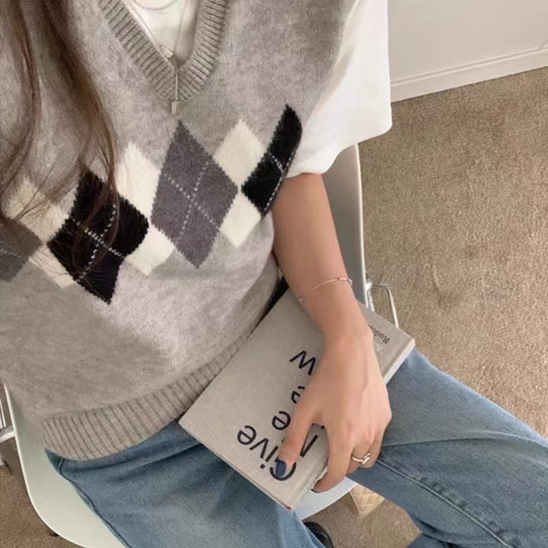 여성을위한 대학 스타일 자카드 v 넥 스택 니트 조끼 2024 봄, 가을 여성을위한 새로운 다이아몬드 패턴의 간단한 스웨터 조끼스토어 가기