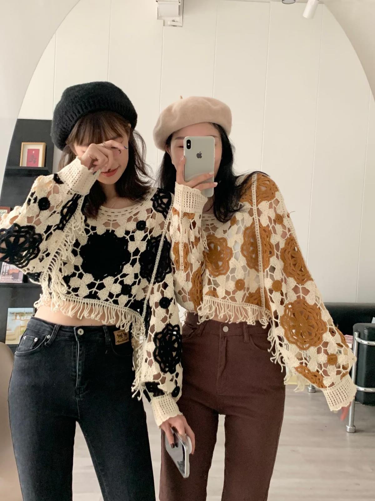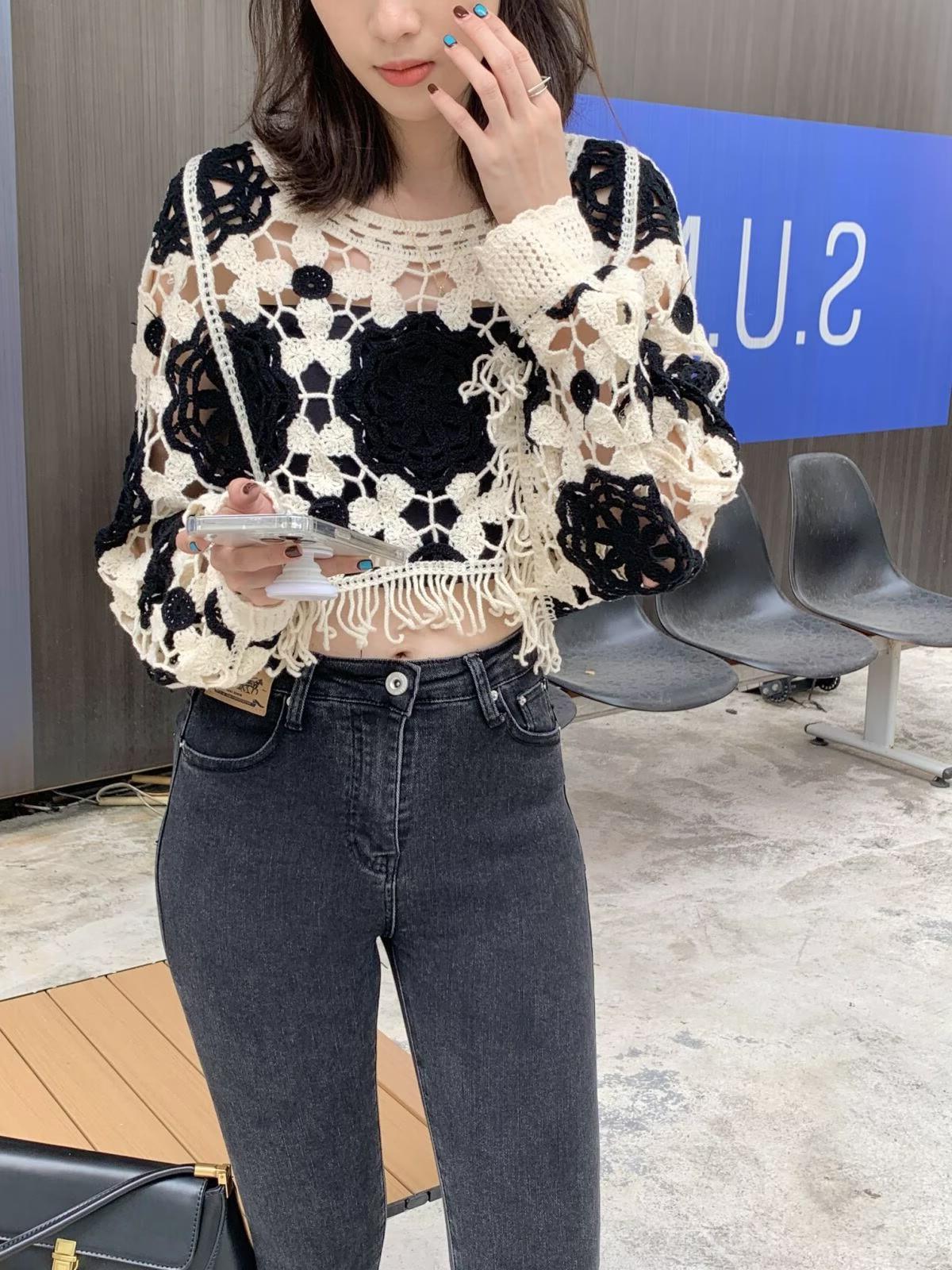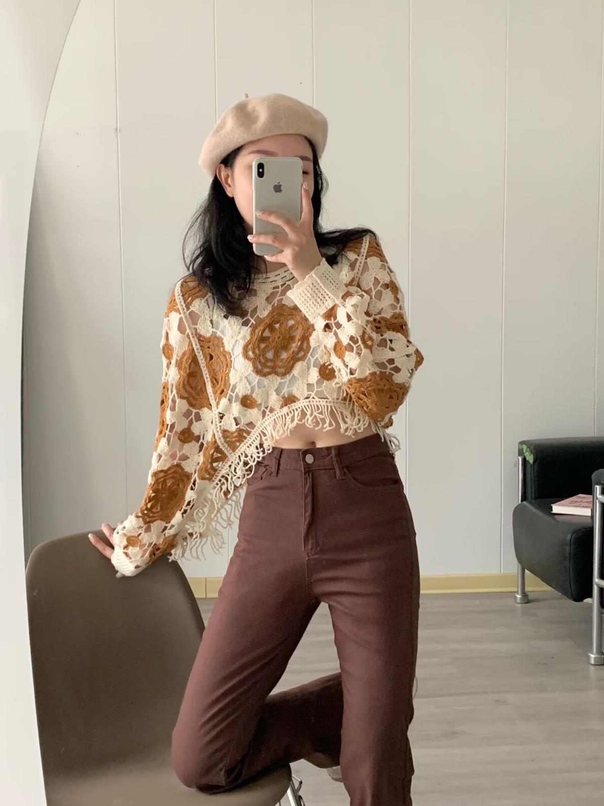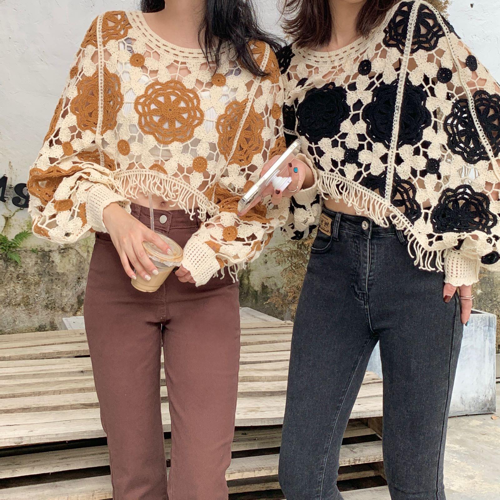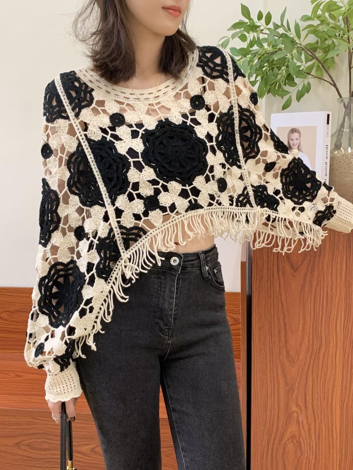 봄과 가을 휴가 후크 꽃 중공 니트웨어 여성의 게으른 스타일 느슨한 터틀넥 망토 틈새 웨스턴 스타일 블라우스스토어 가기