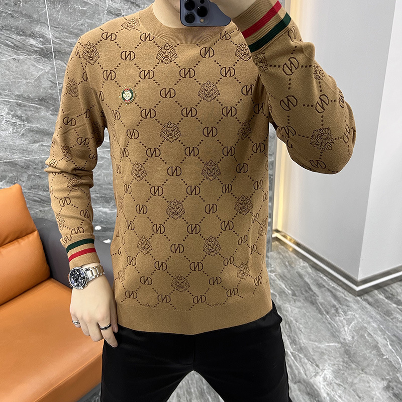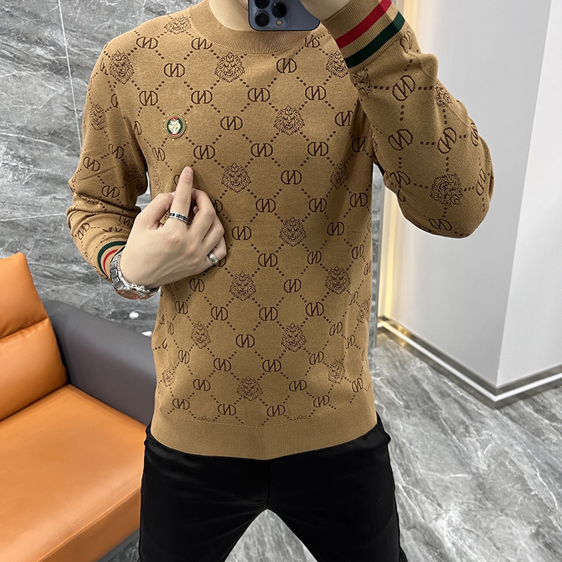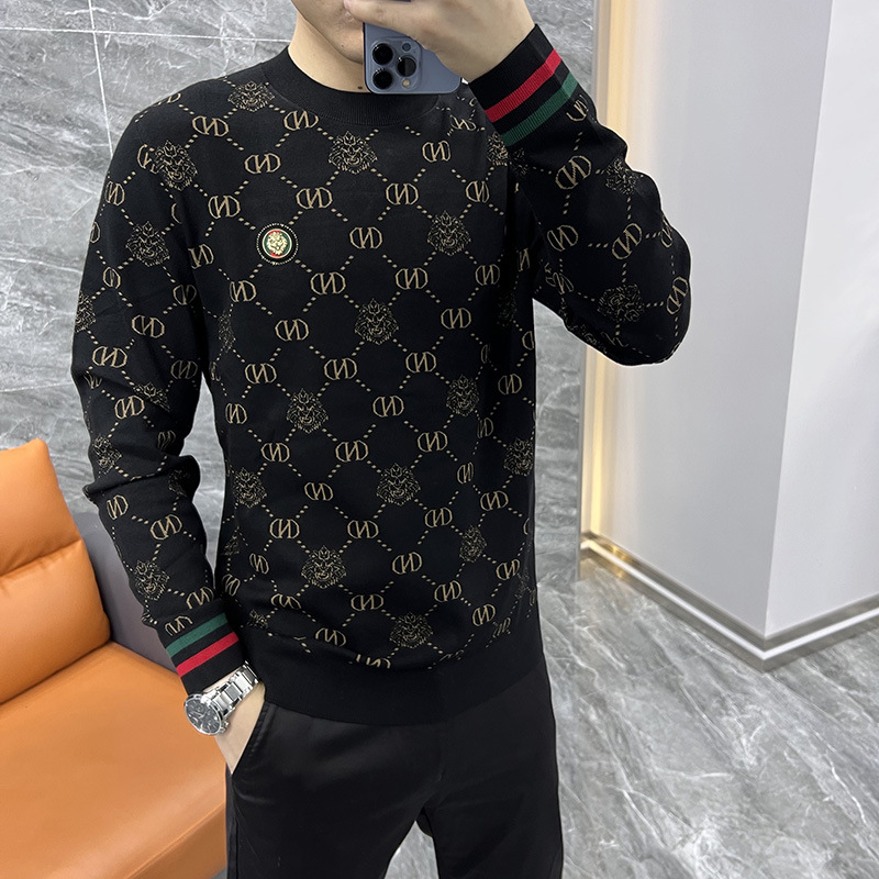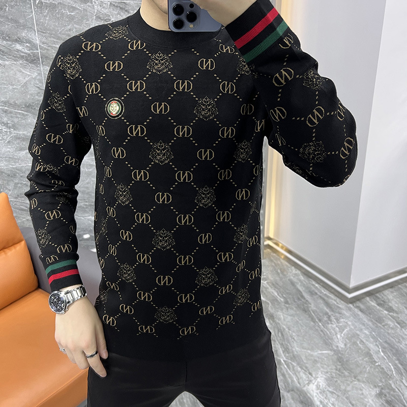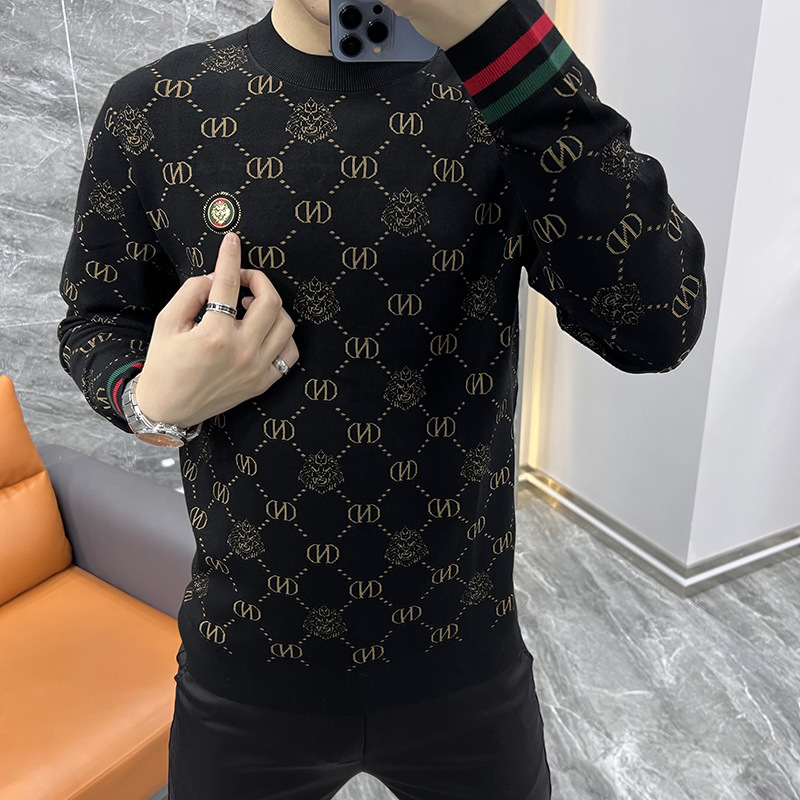 경량 럭셔리 패션 남성용 봄 가을 긴팔 라운드넥 니트셔츠, 멋지고 개성 있는 프린트와 반짝이 장식, 신축성 있고 편안한 상의