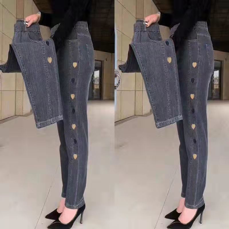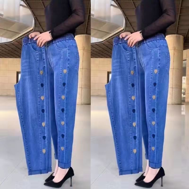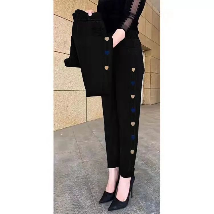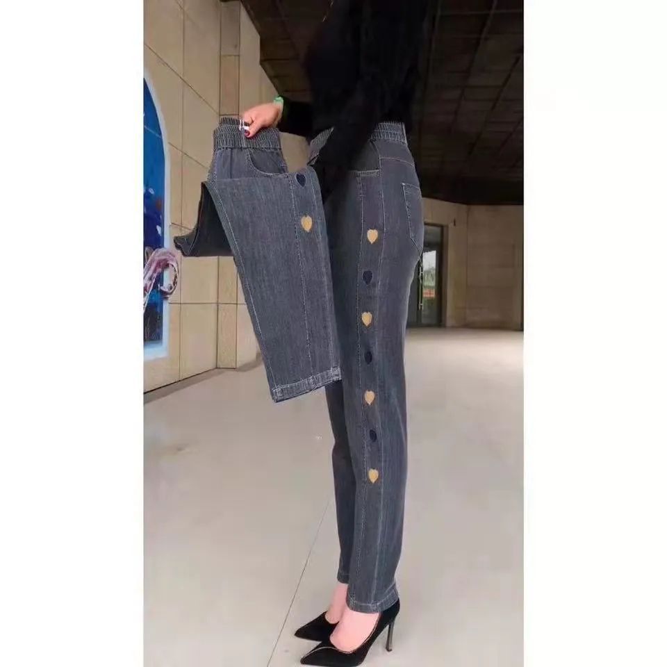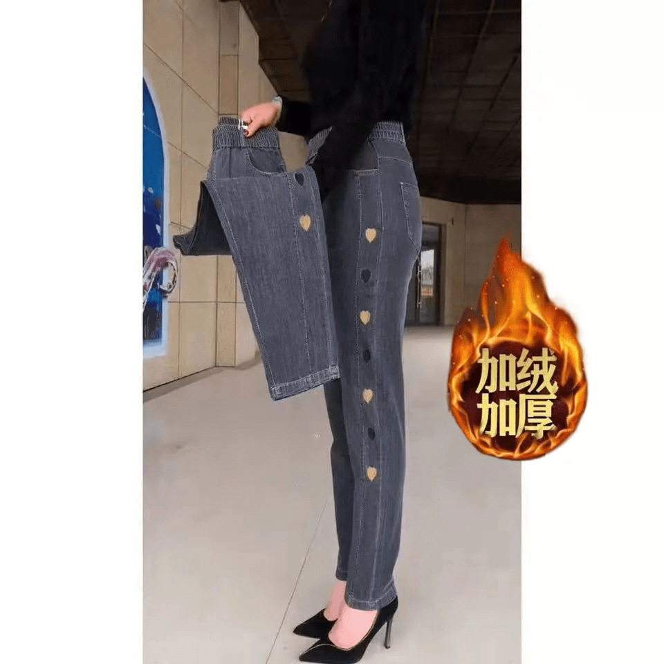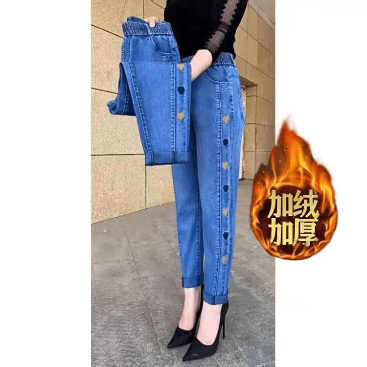 2023 가을과 겨울 새로운 Harlan 기모 청바지 여성용 플러스 사이즈 스트레치 하이 웨이스트 중년 느슨한 모든 경기 슬리밍 바지