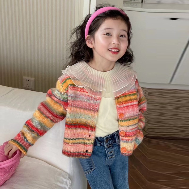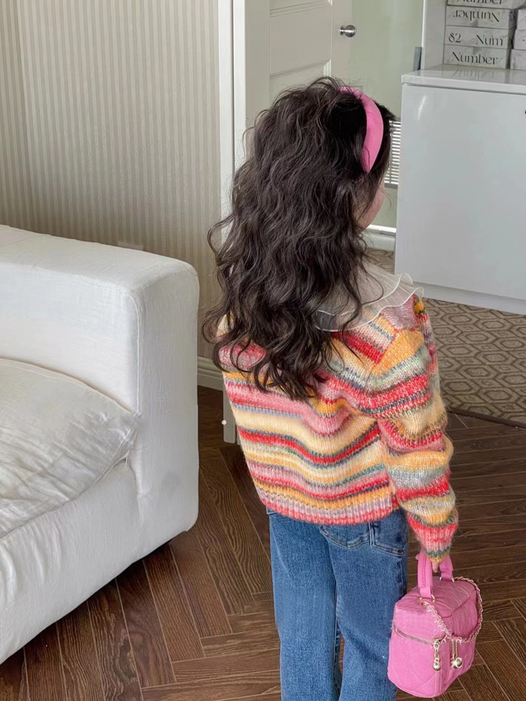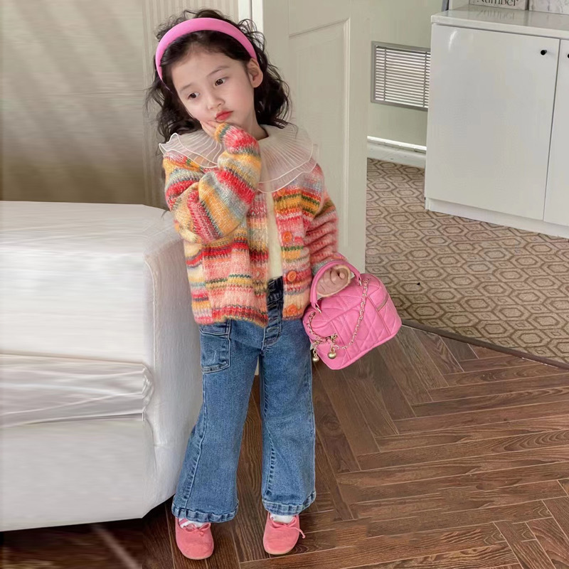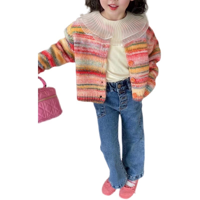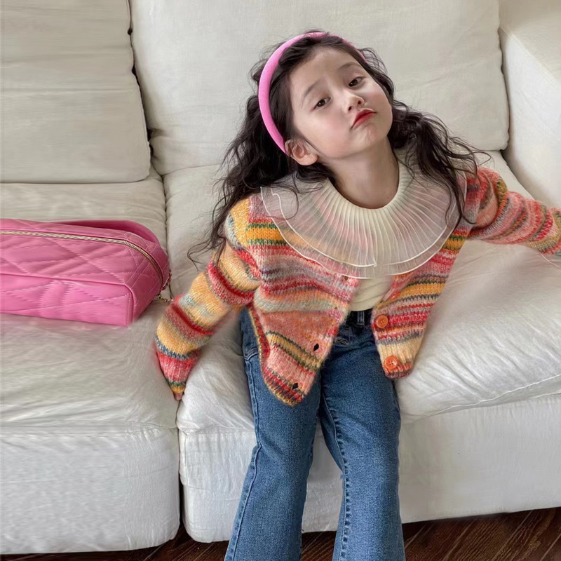 재고정리, 반품 및 교환 불가【합리적인 주문】여아용 스트라이프 니트 가디건+베이스레이어+데님팬츠스토어 가기