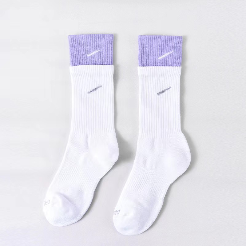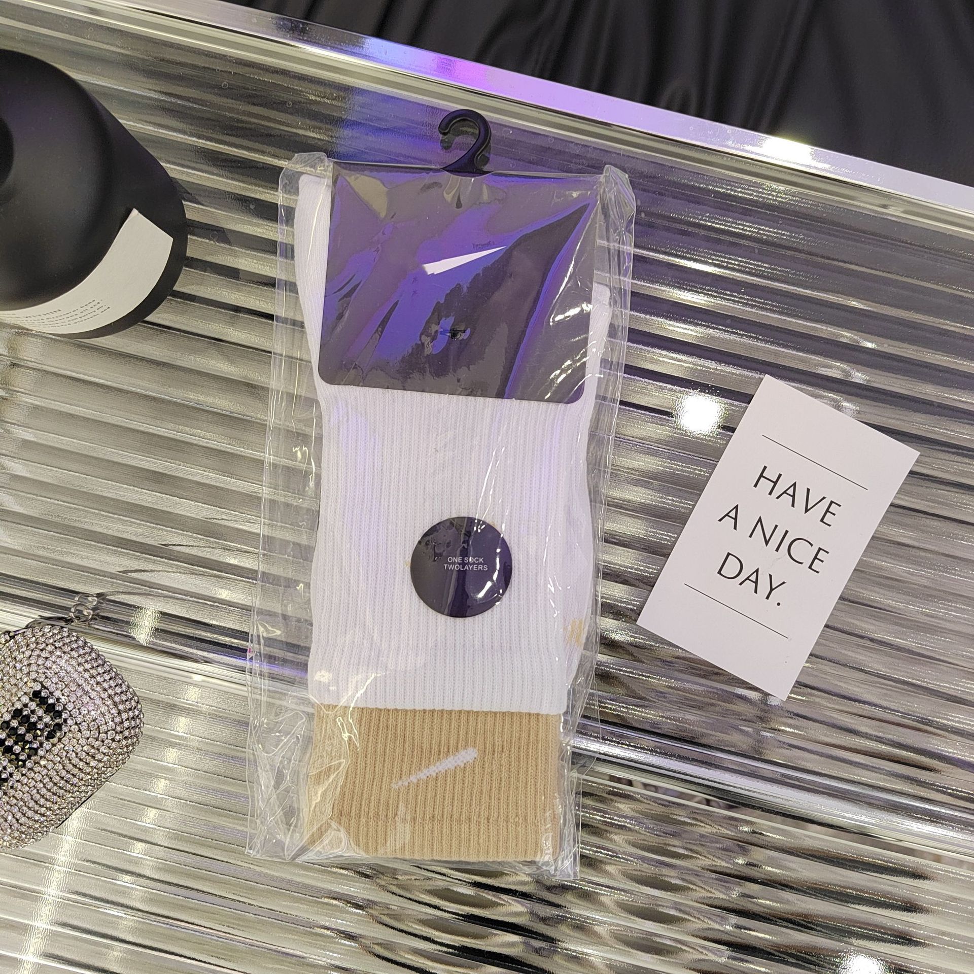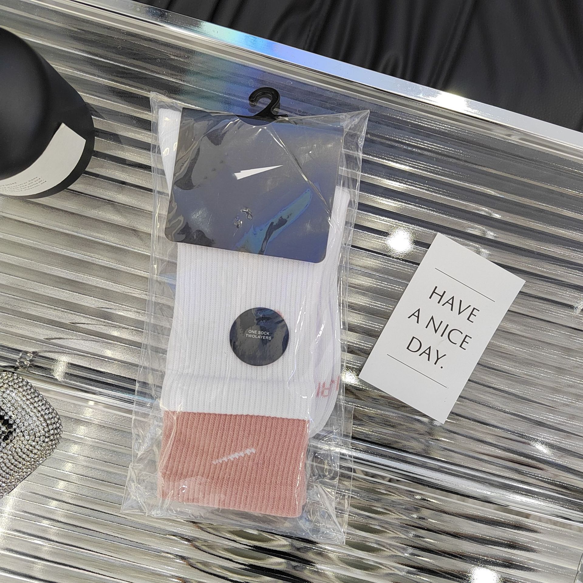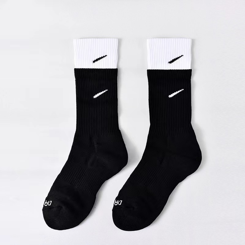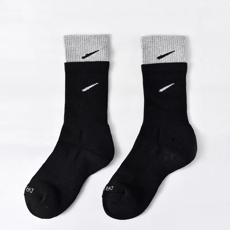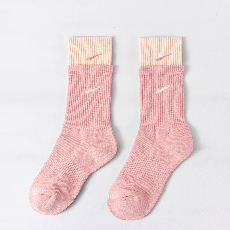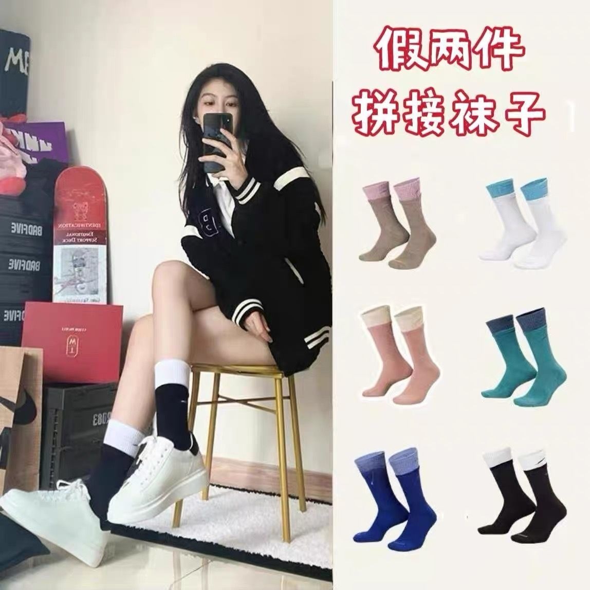 봄여름용 고급스러운 디자인의 하이탑 양말, 이중 레이어드 이중 밴딩, 페이크 투피스 캐주얼 트렌디 피트니스 스포츠 양말스토어 가기
