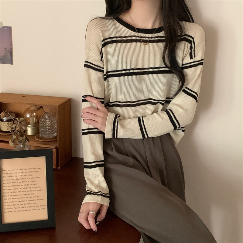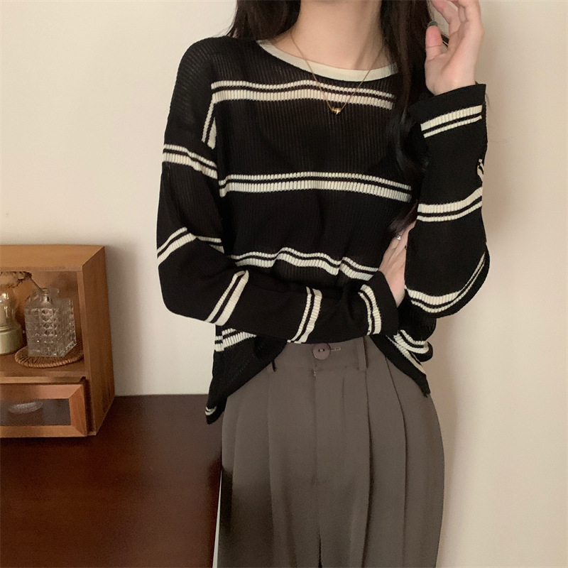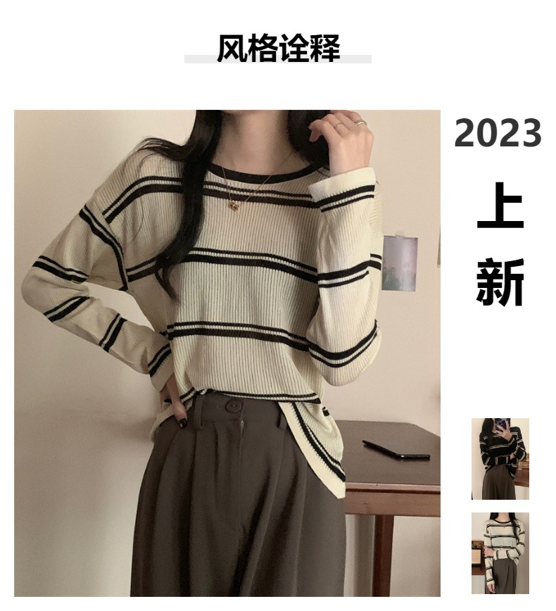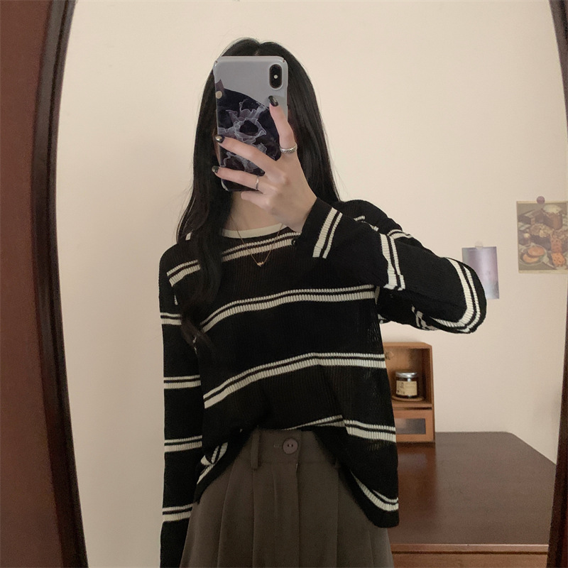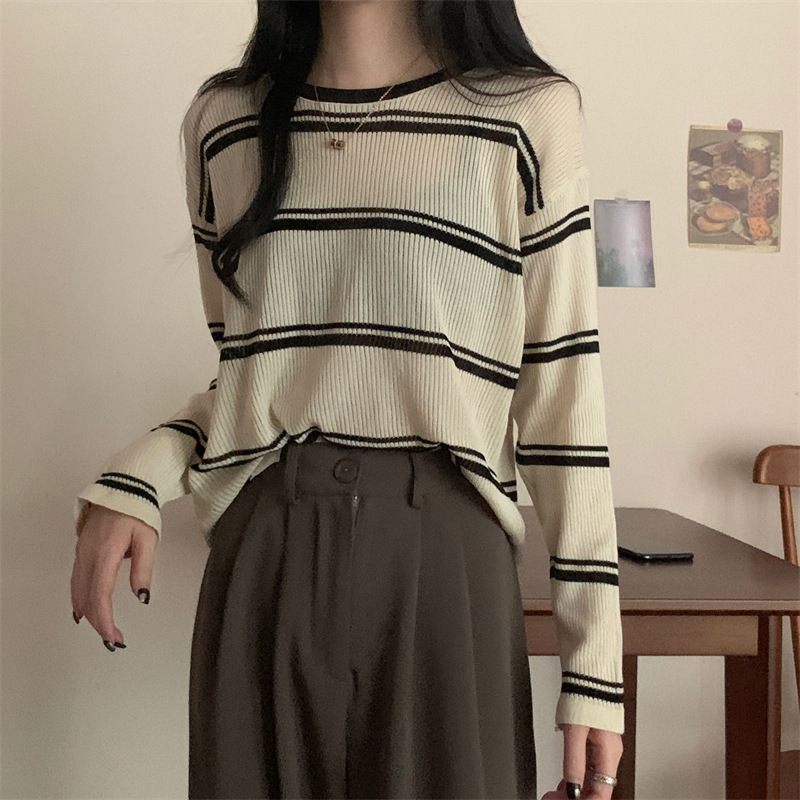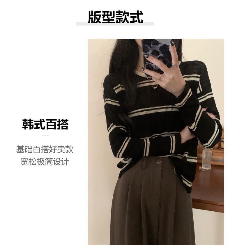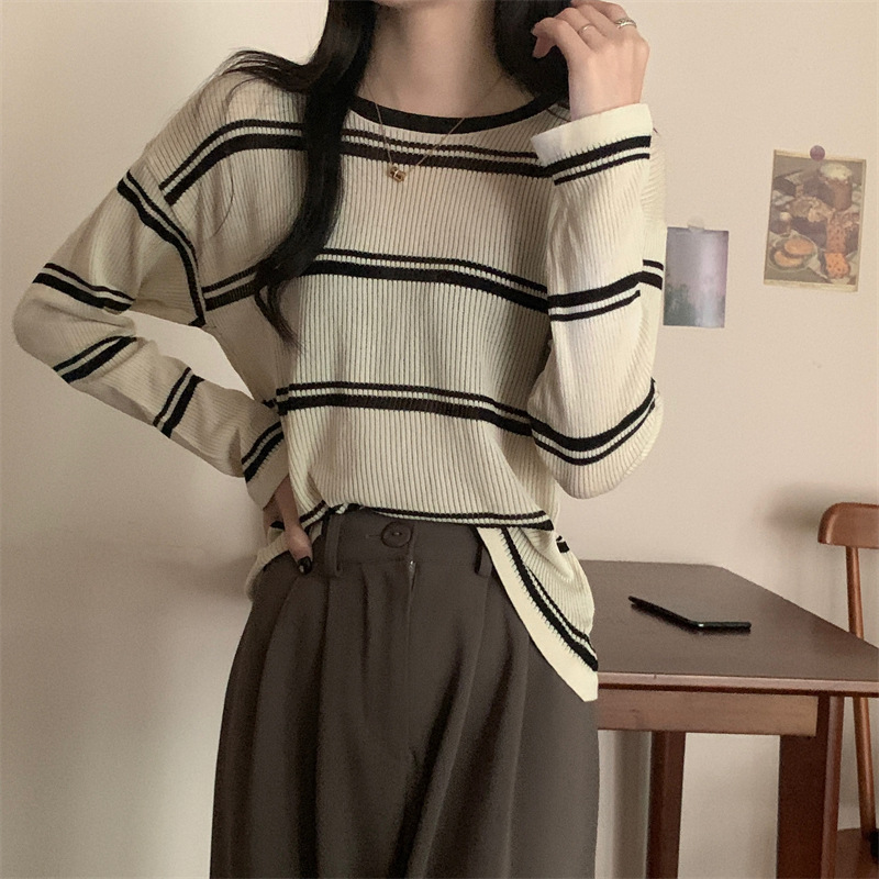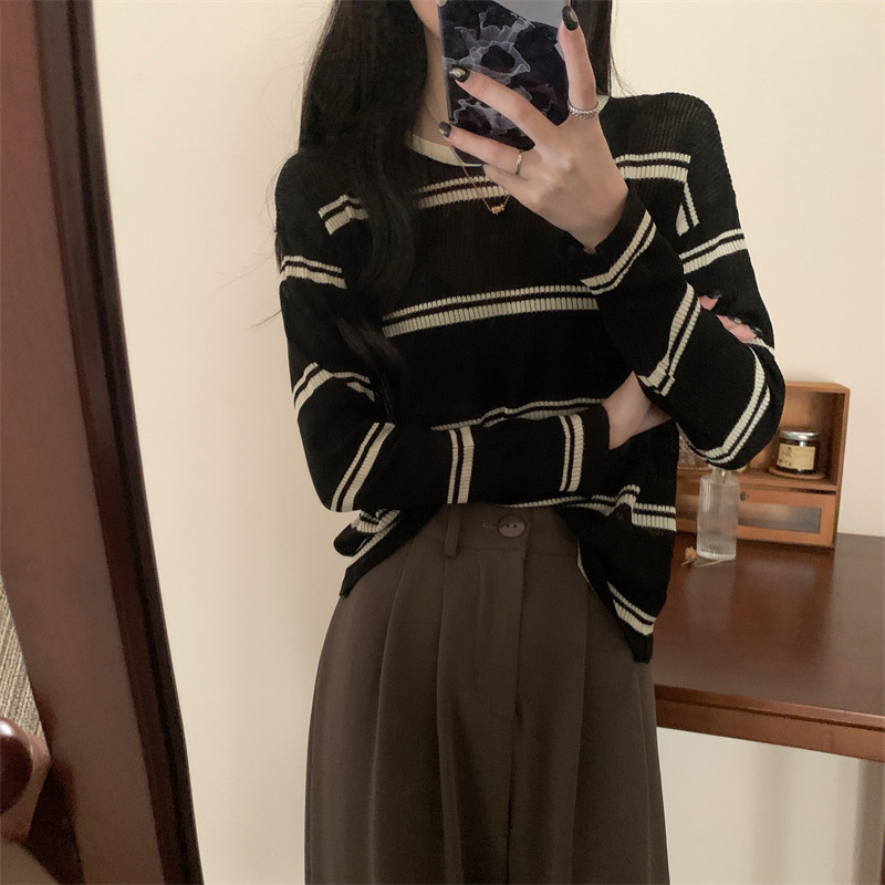 한국 스타일 시크한 세련된 디자인 감각 대조 컬러 스트라이프 긴팔 스웨터 여성의 이른 가을 느슨한 게으른 스타일 웨스턴 스타일 탑스토어 가기
