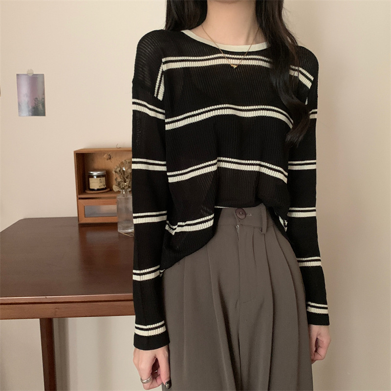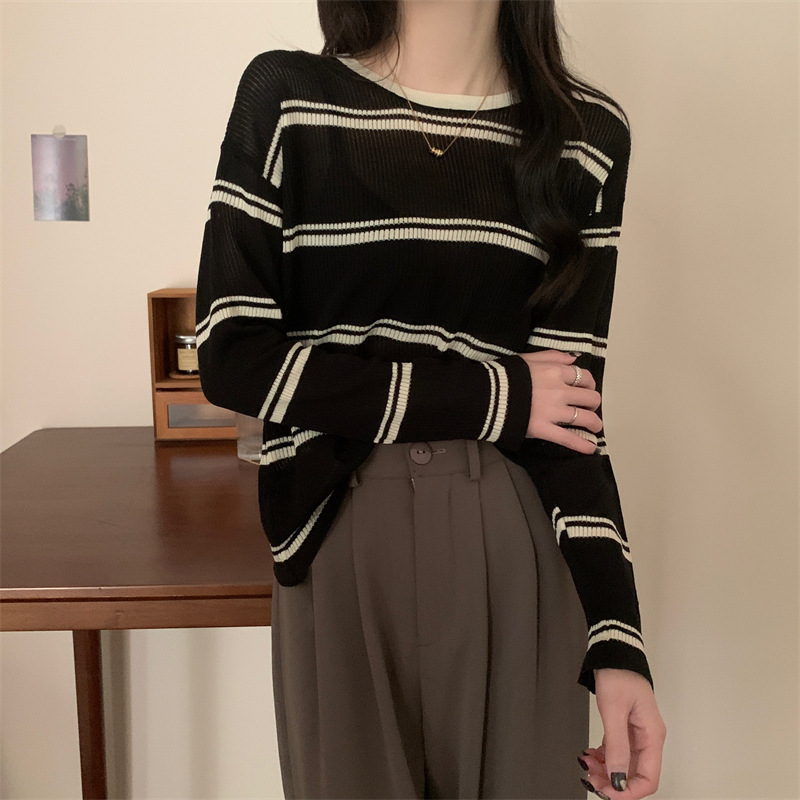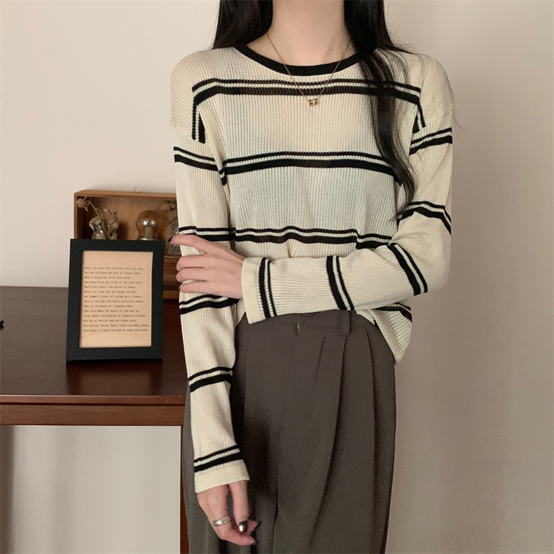 한국 스타일 시크한 세련된 디자인 감각 대조 컬러 스트라이프 긴팔 스웨터 여성의 이른 가을 느슨한 게으른 스타일 웨스턴 스타일 탑